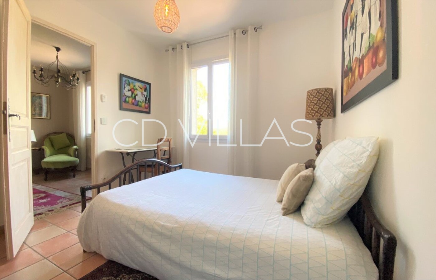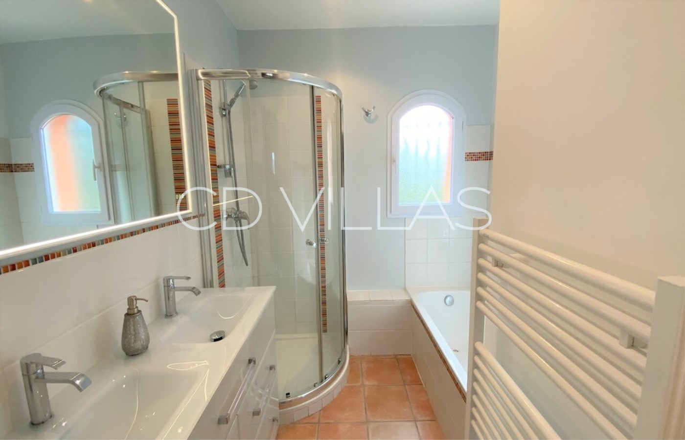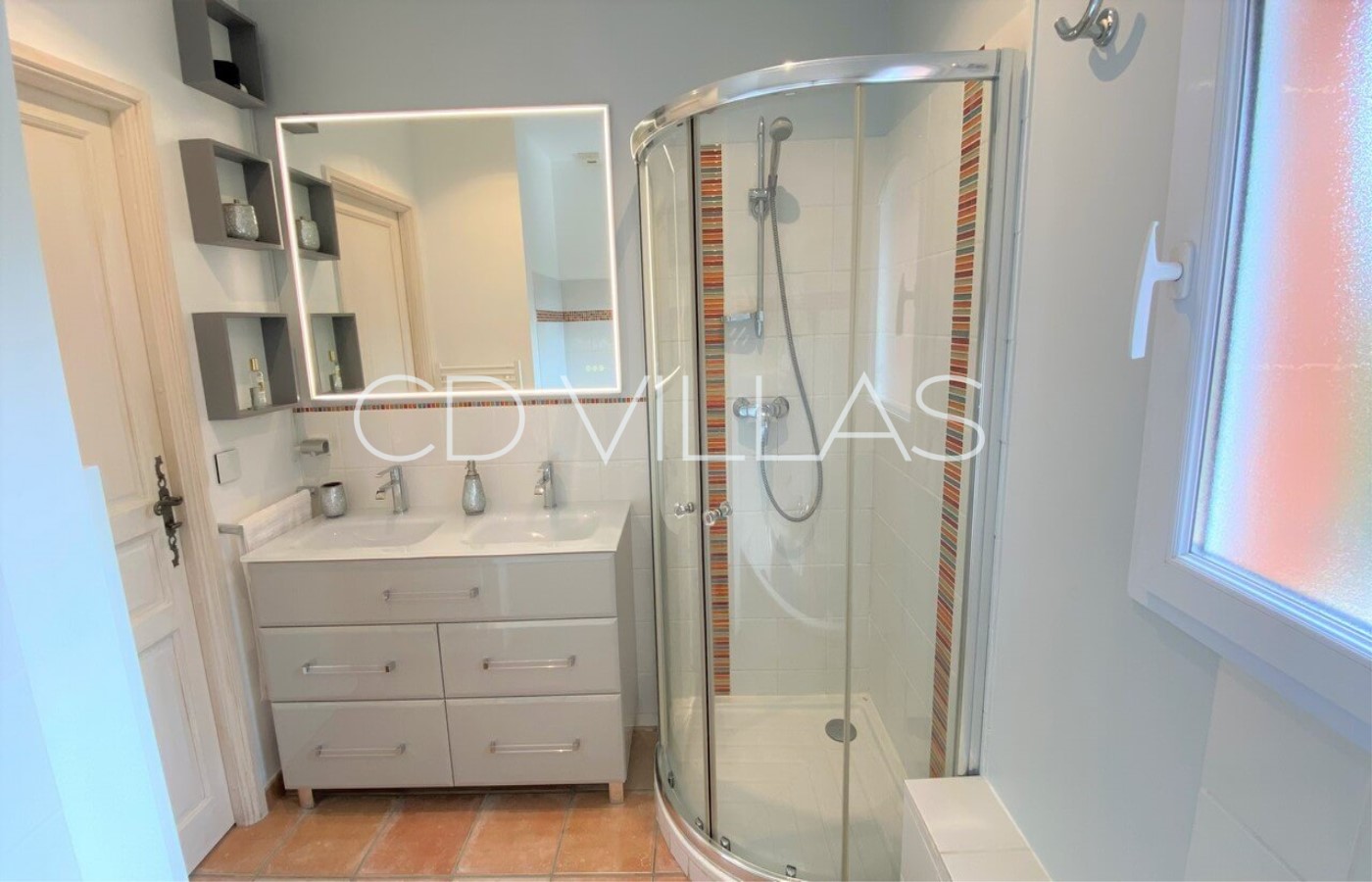 Les 4 chambres sont situées au premier étage avec 3 chambres doubles avec lits 140cm, toutes partageant une salle de bain sur le palier avec douche, baignoire, double vasque et WC séparés. La chambre principale dispose d'un lit queen size, d'une salle de douche attenante avec double vasque, d'un dressing et d'une vue sur la piscine