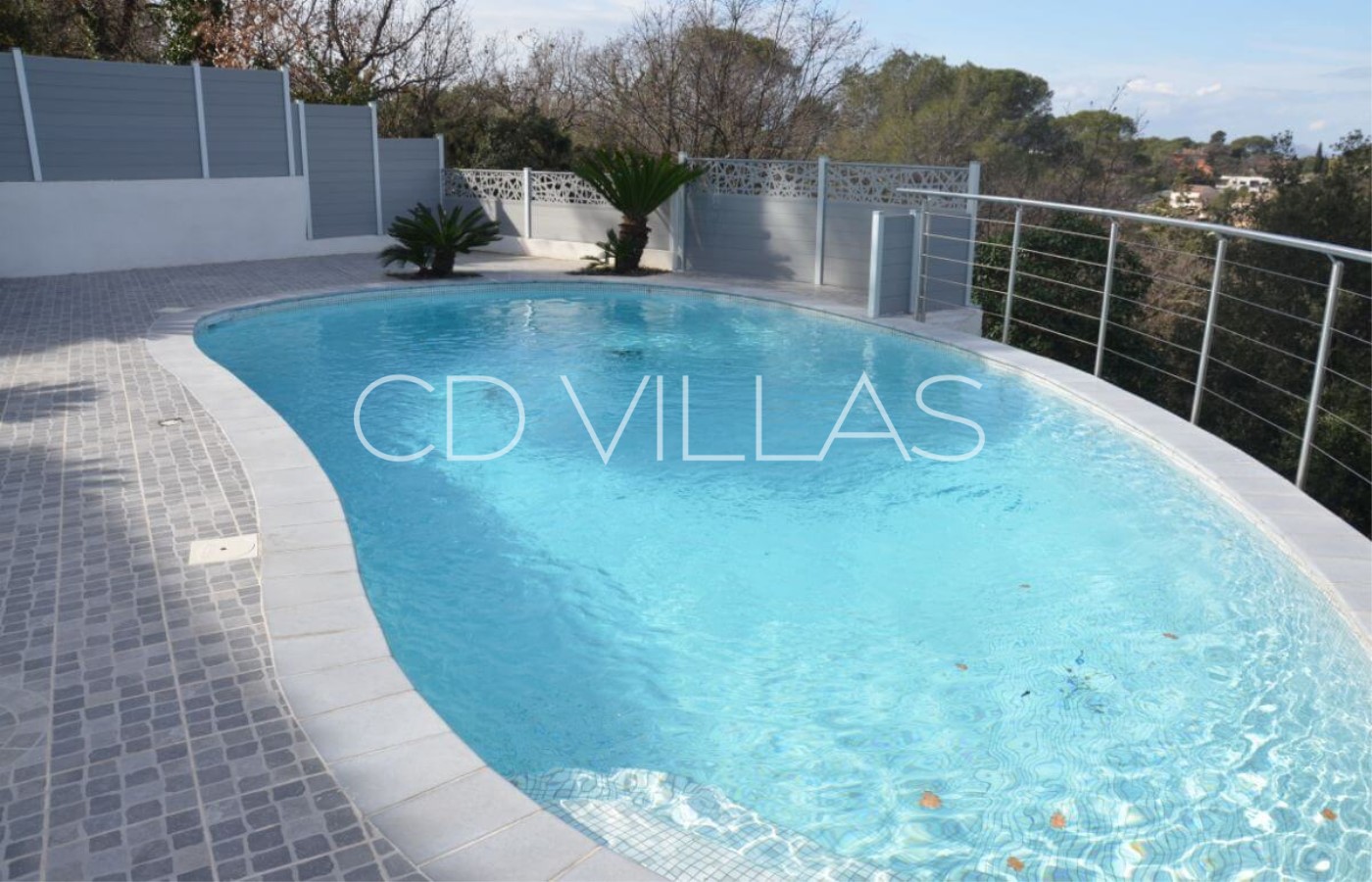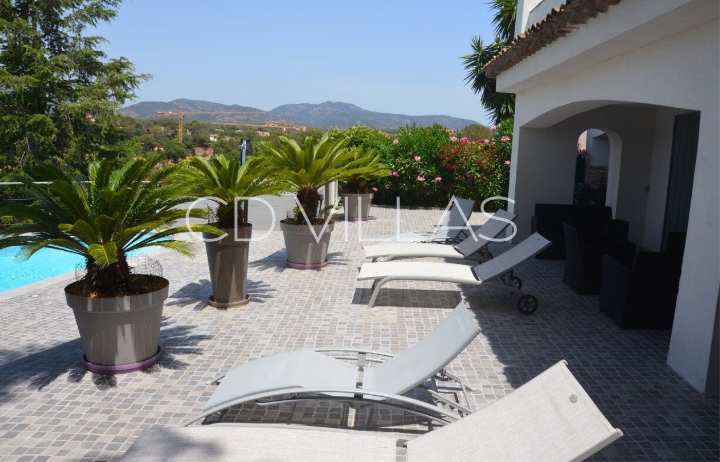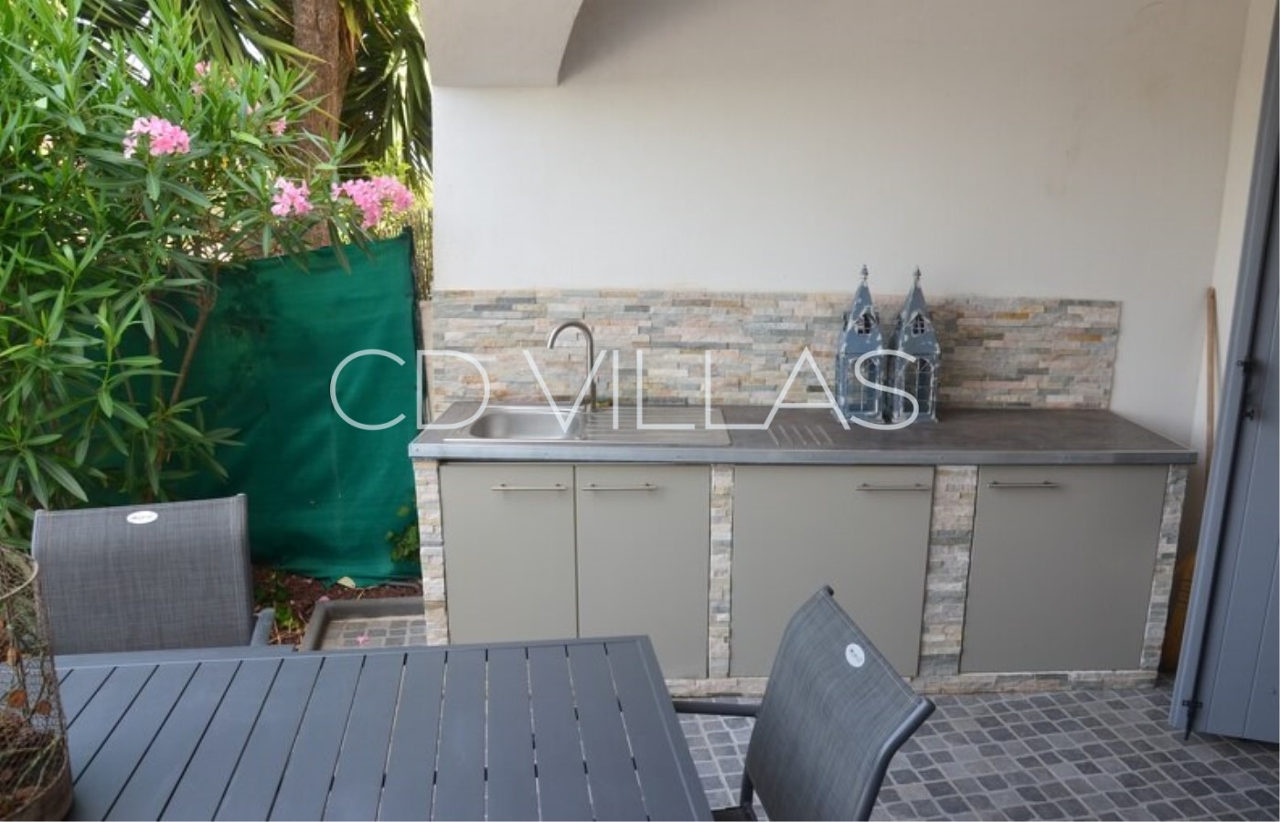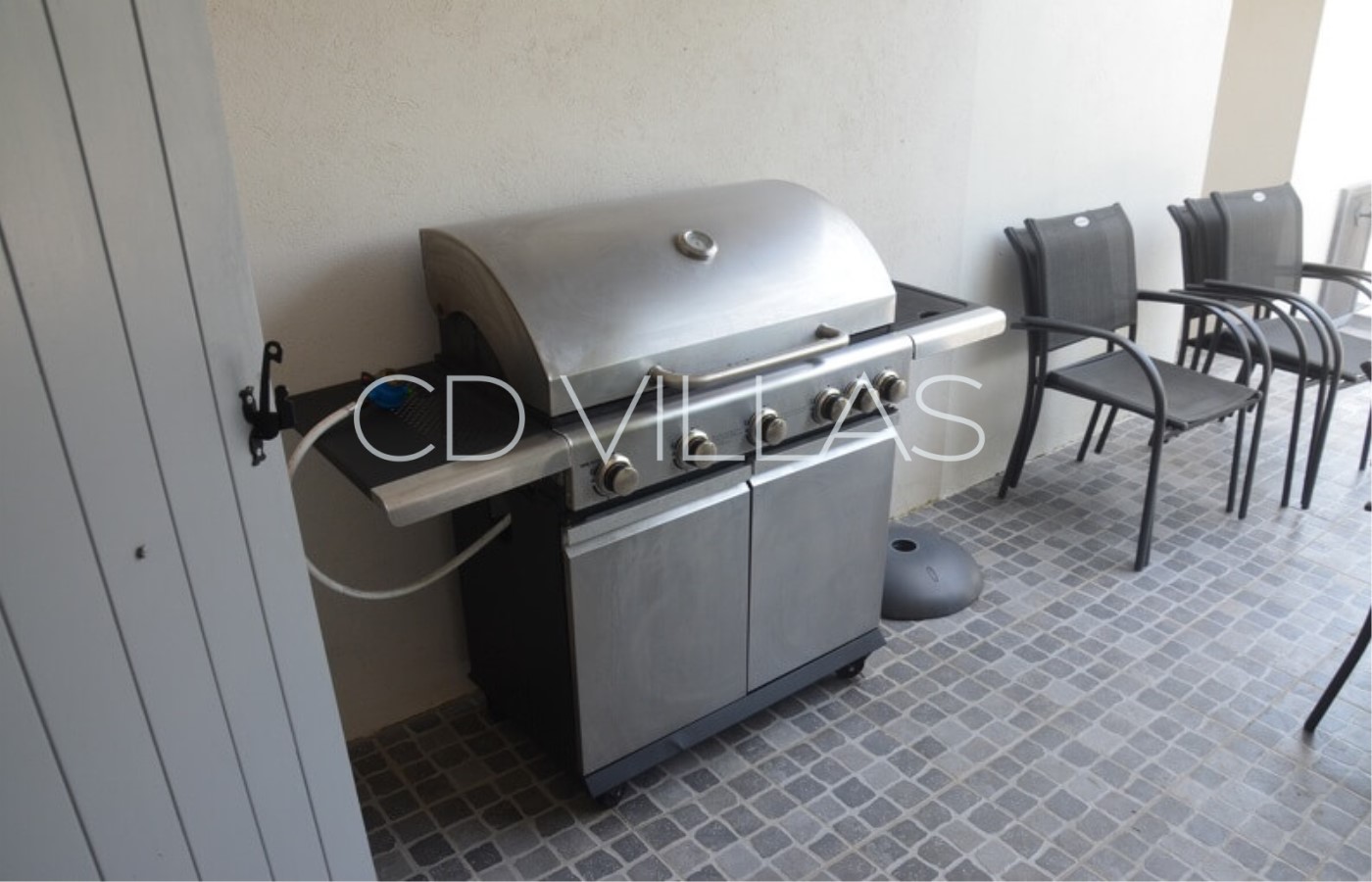 Cet étage donne accès à la salle à manger extérieure avec un BBQ au gaz, 2 salons d'été ombragés et des chaises longues pour profiter des rayons du soleil. La piscine de forme libre est située à ce niveau.