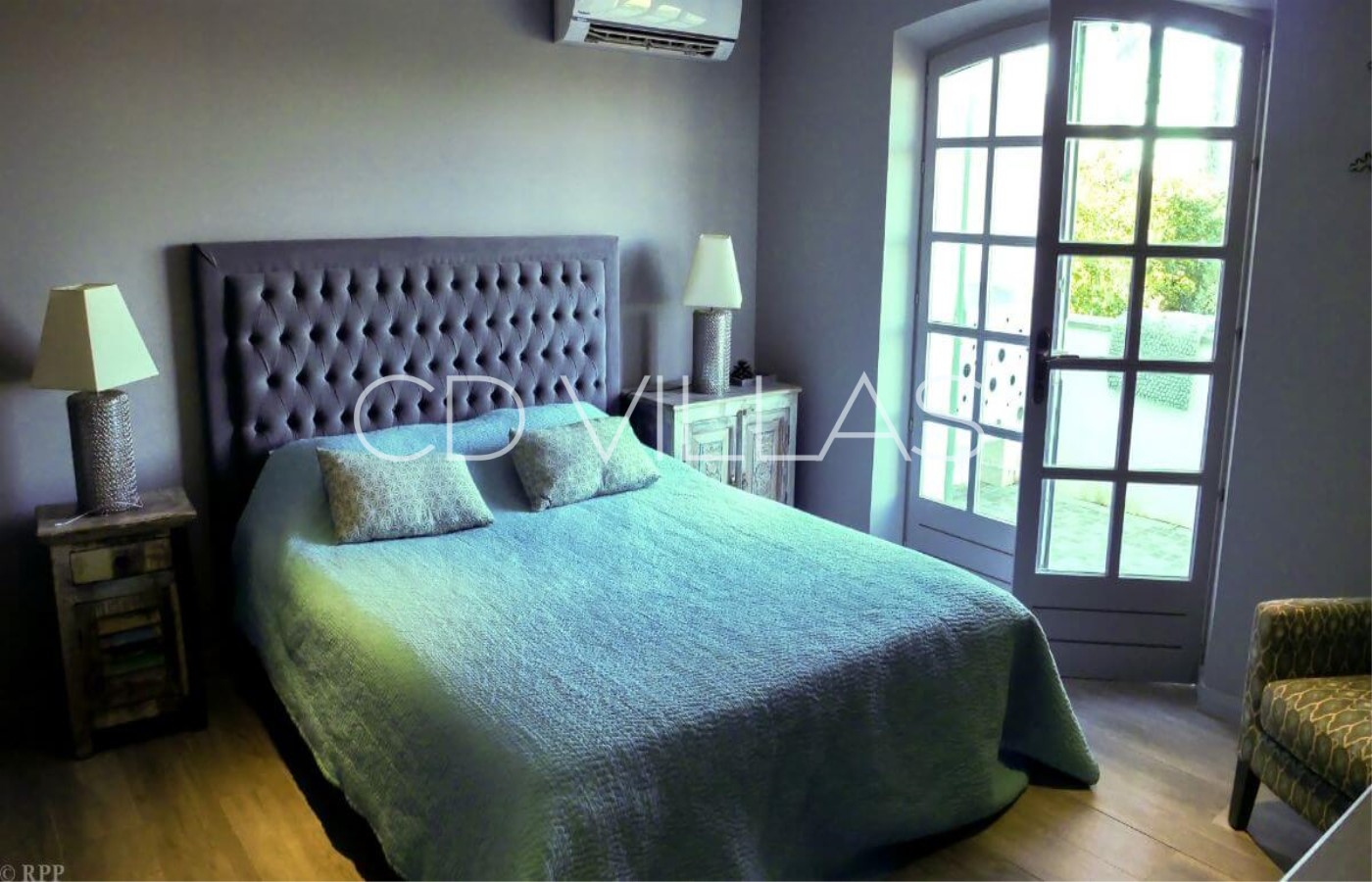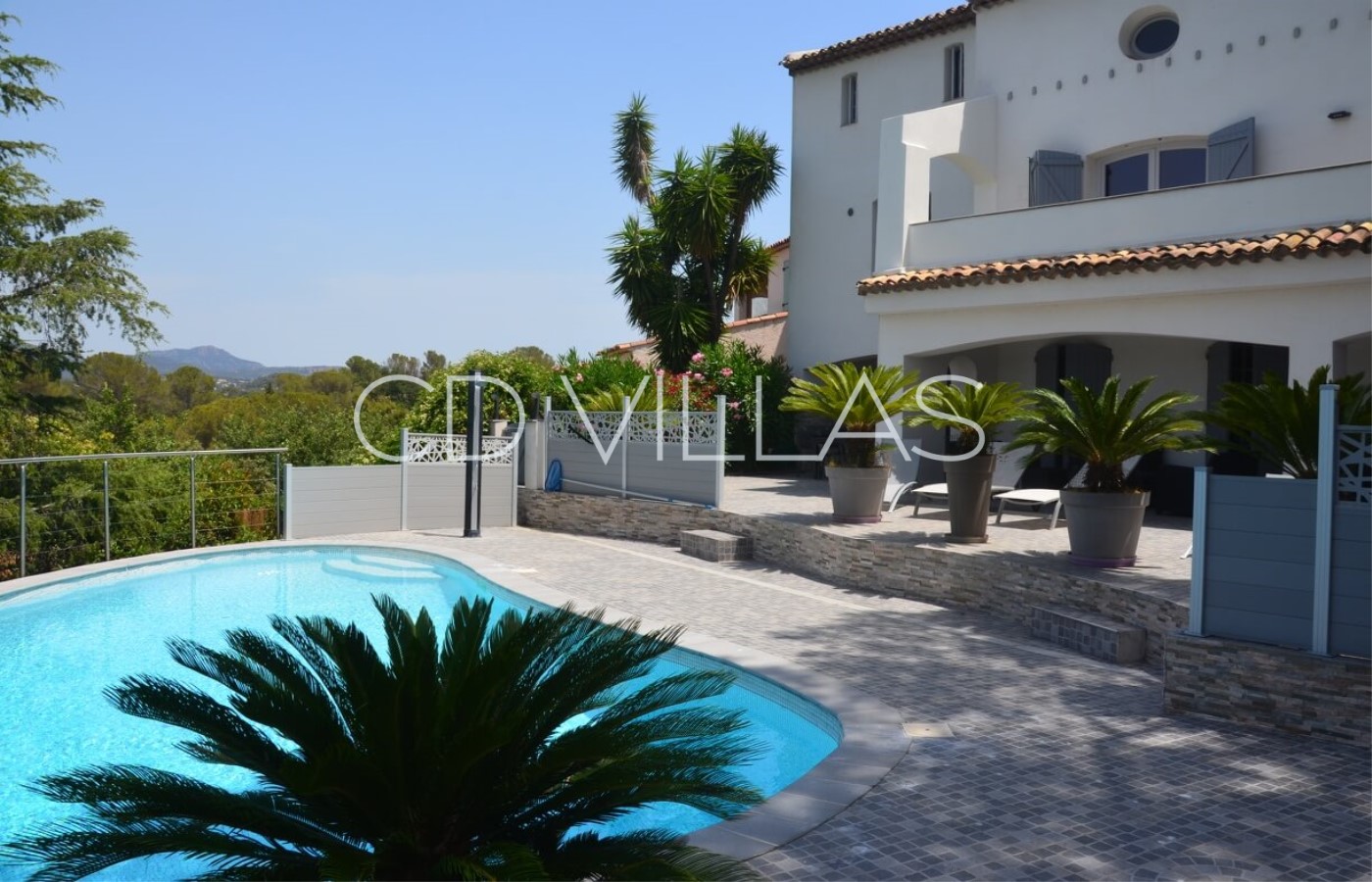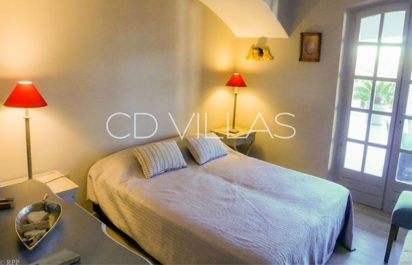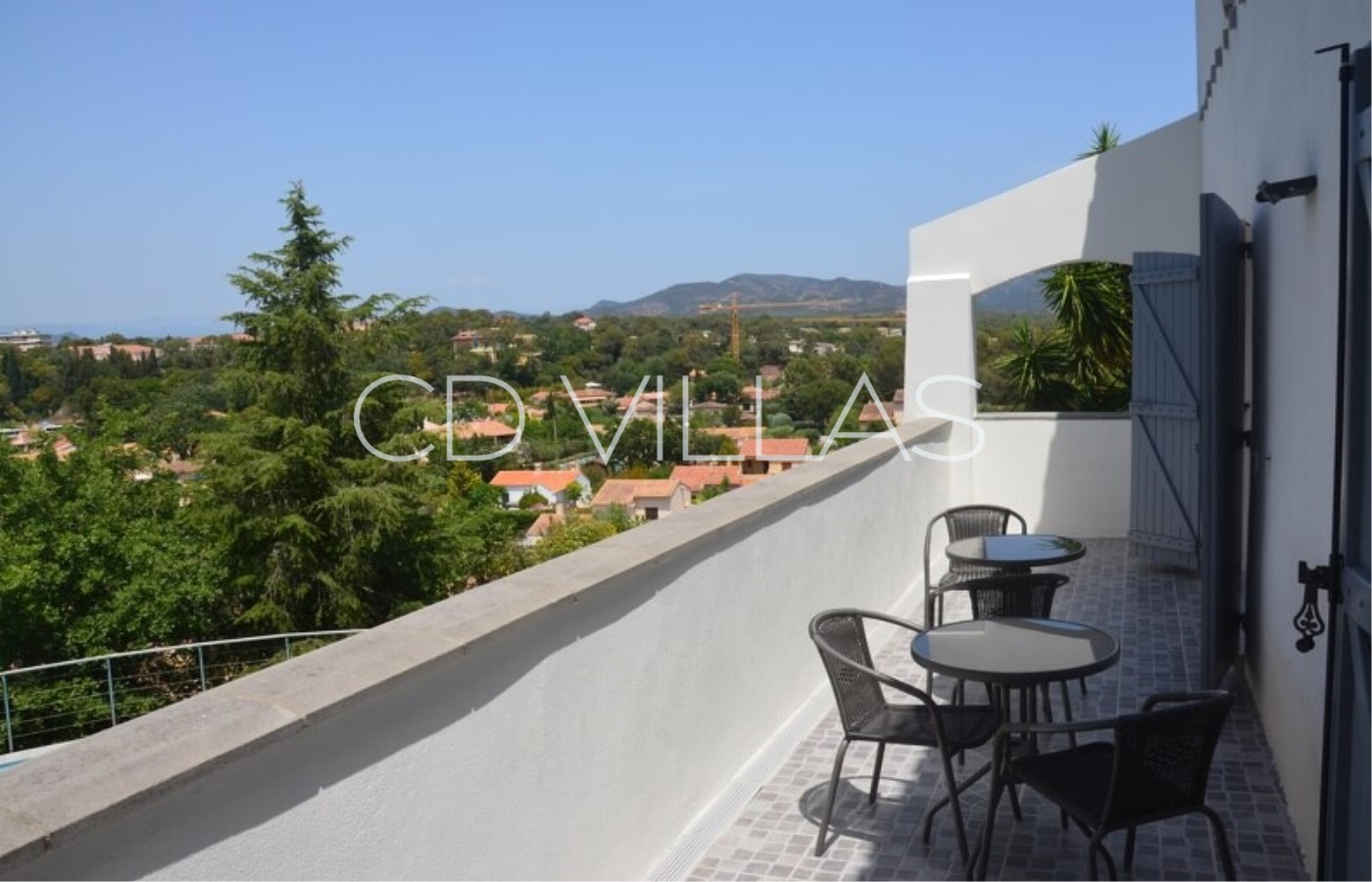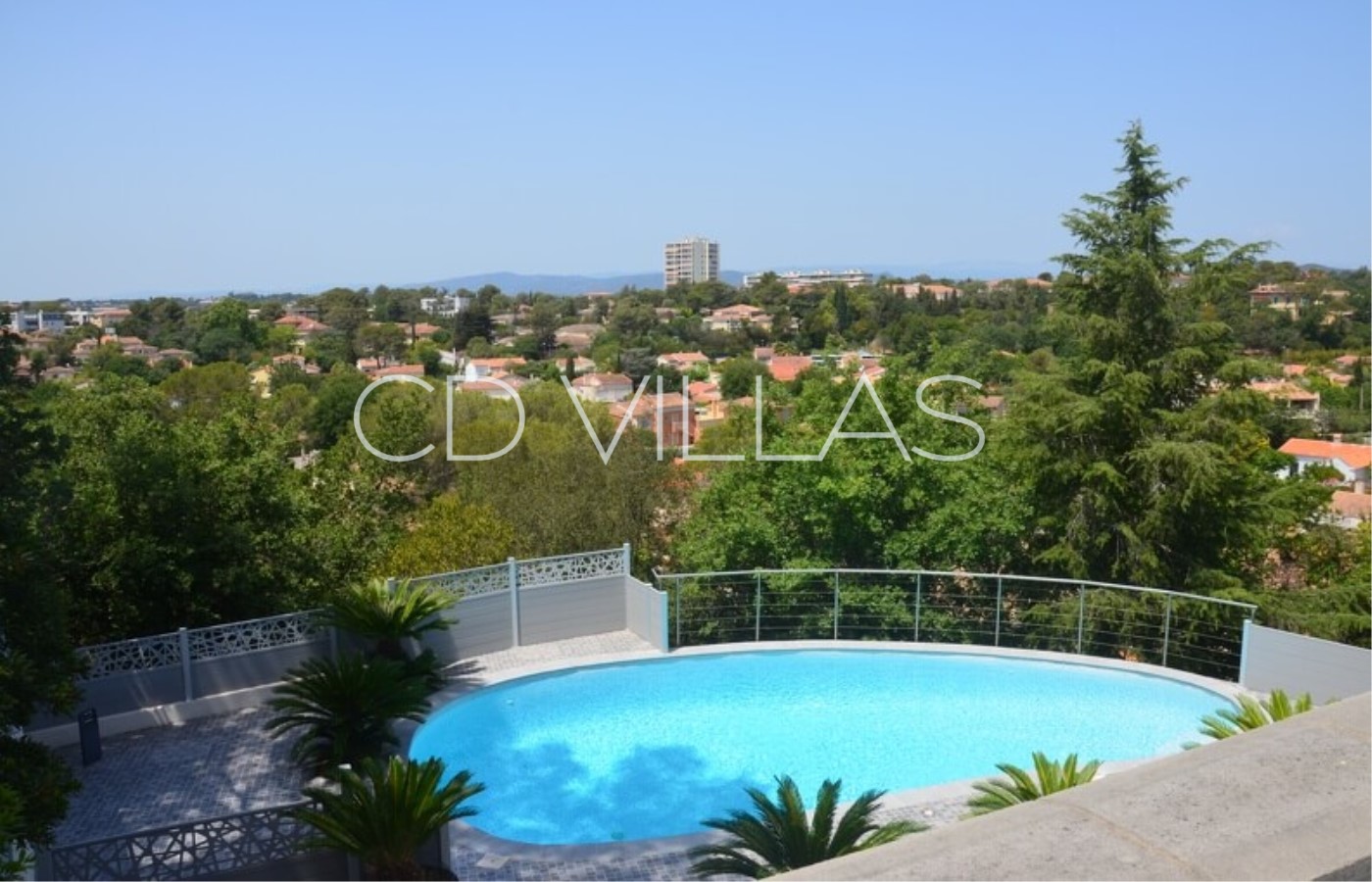 Cet étage donne accès à la salle à manger extérieure avec un BBQ au gaz, 2 salons d'été ombragés et des chaises longues pour profiter des rayons du soleil. La piscine de forme libre est située à ce niveau.