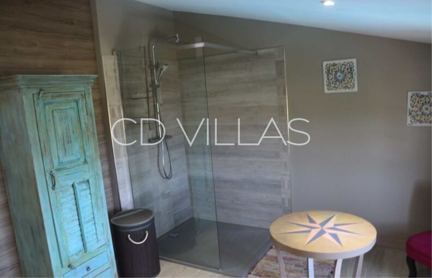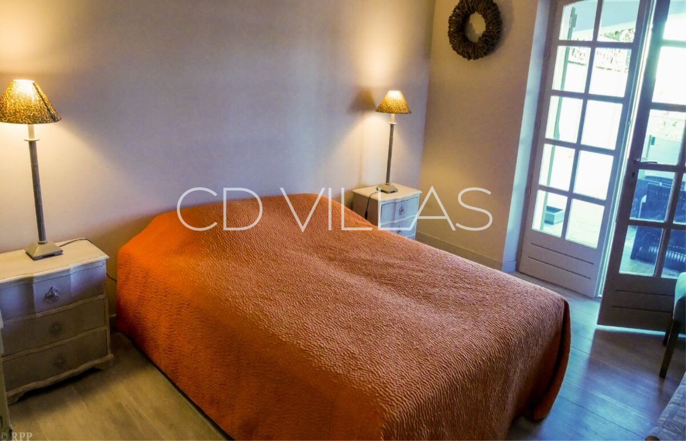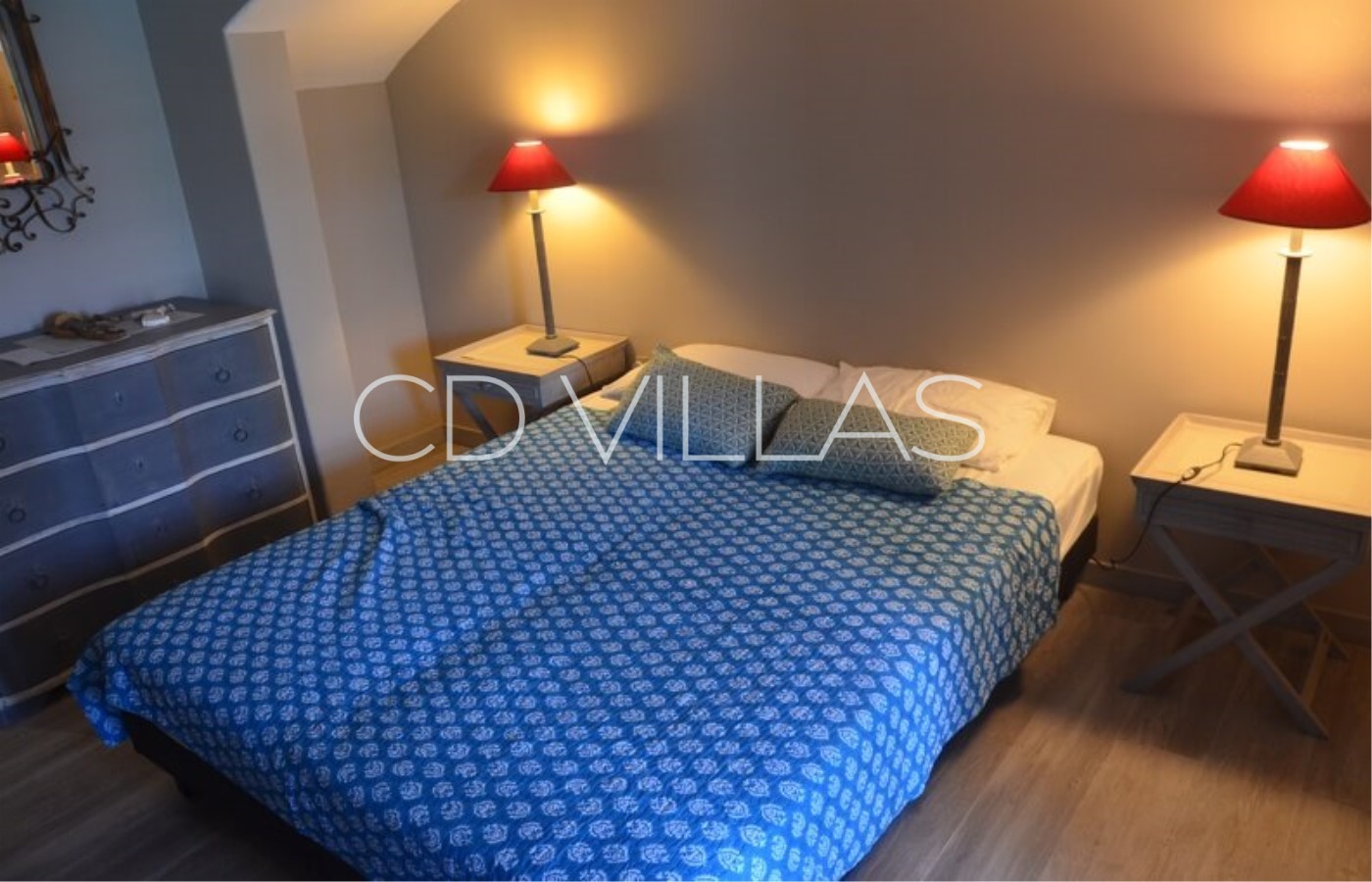 Au même étage, on trouve une grande chambre double avec placards et salle de bain (baignoire avec douche, double vasque) et vue sur la campagne. Un autre escalier mène au niveau inférieur avec 3 chambres supplémentaires (2 avec lits jumeaux et une avec lit double) plus 2 salles de douche et WC séparés, et une buanderie avec lave-linge et sèche-linge.