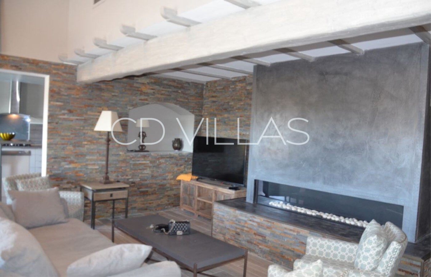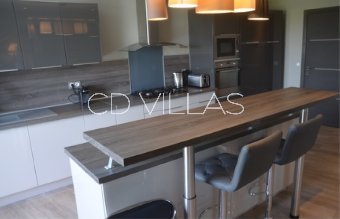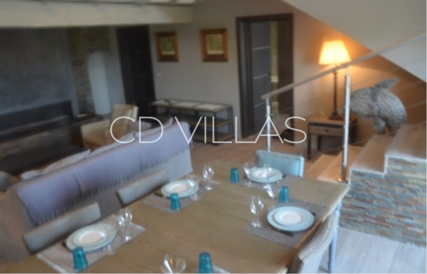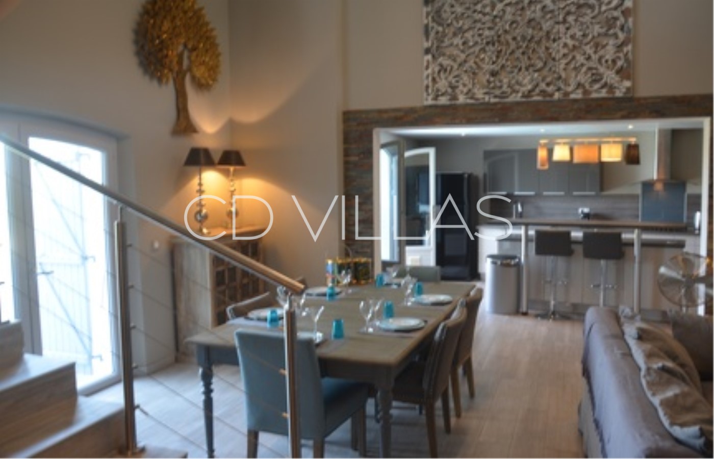 Un escalier mène à un grand séjour ouvert avec un salon moderne avec canapés et fauteuils confortables, une télévision à écran plat et une cheminée à gaz. La salle à manger est ouverte sur le salon et sur la cuisine, entièrement équipée avec des appareils modernes: four, micro-ondes, plaques de cuisson à gaz, lave-vaisselle, bouilloire, machine à café Nespresso et grille-pain. Le séjour s'ouvre sur une grande terrasse pour profiter de la vue ou prendre un verre au coucher du soleil.