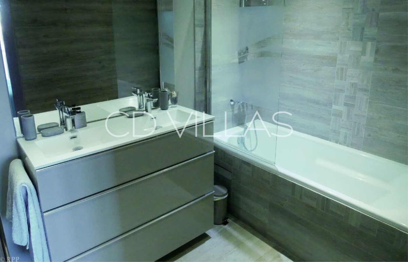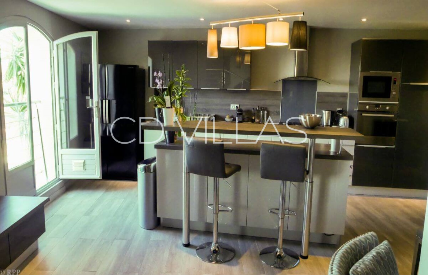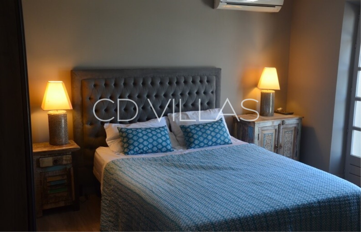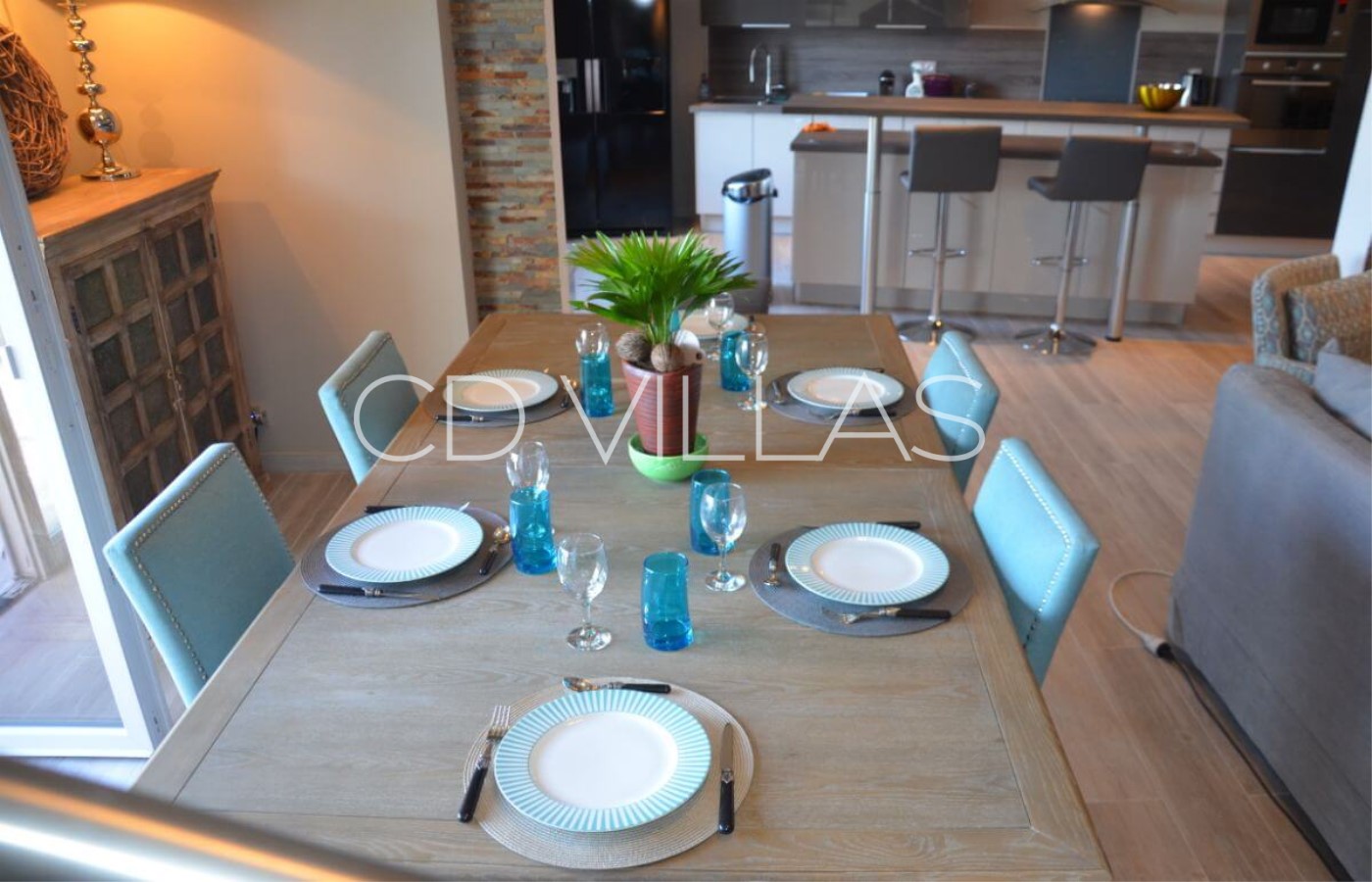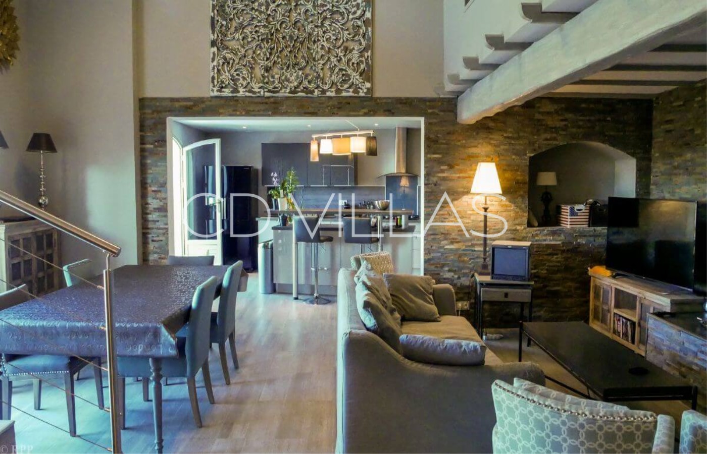 Un escalier mène à un grand séjour ouvert avec un salon moderne avec canapés et fauteuils confortables, une télévision à écran plat et une cheminée à gaz. La salle à manger est ouverte sur le salon et sur la cuisine, entièrement équipée avec des appareils modernes: four, micro-ondes, plaques de cuisson à gaz, lave-vaisselle, bouilloire, machine à café Nespresso et grille-pain. Le séjour s'ouvre sur une grande terrasse pour profiter de la vue ou prendre un verre au coucher du soleil.