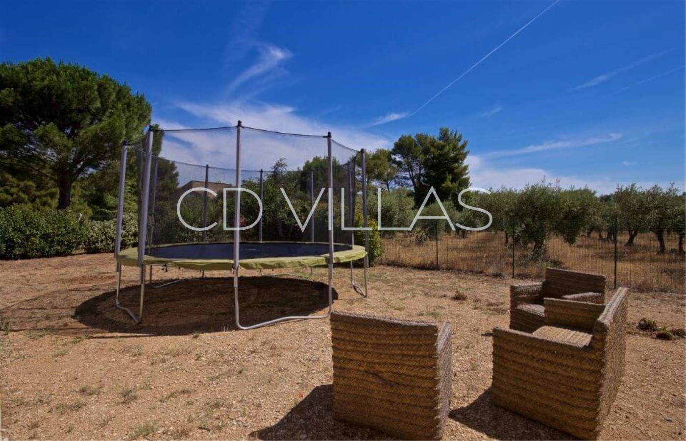 La propriété a tout ce dont on peut rêver en Provence : possibilité de se rendre à pied dans un charmant village, oliveraie, pelouses plates pour jouer, trampoline, salons d'été, ombre et belle vue. La grande piscine de 14m x 4m est sécurisée et peut être chauffée.
