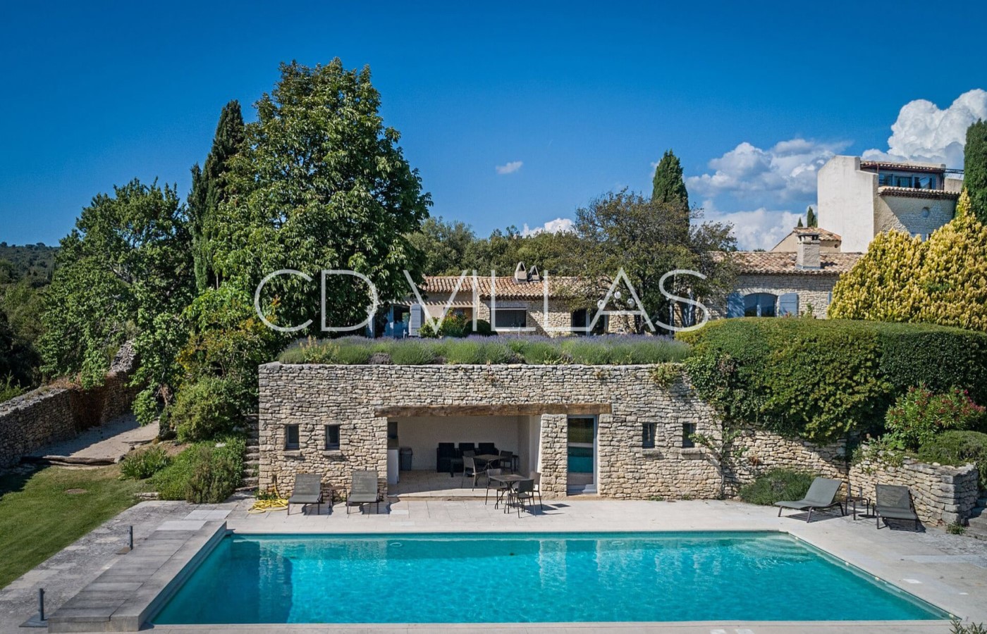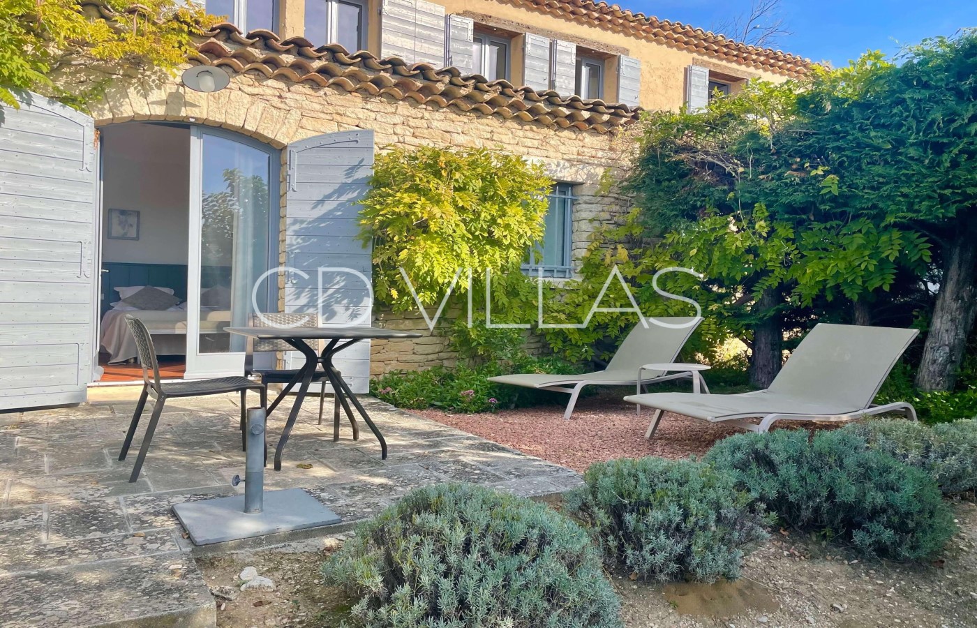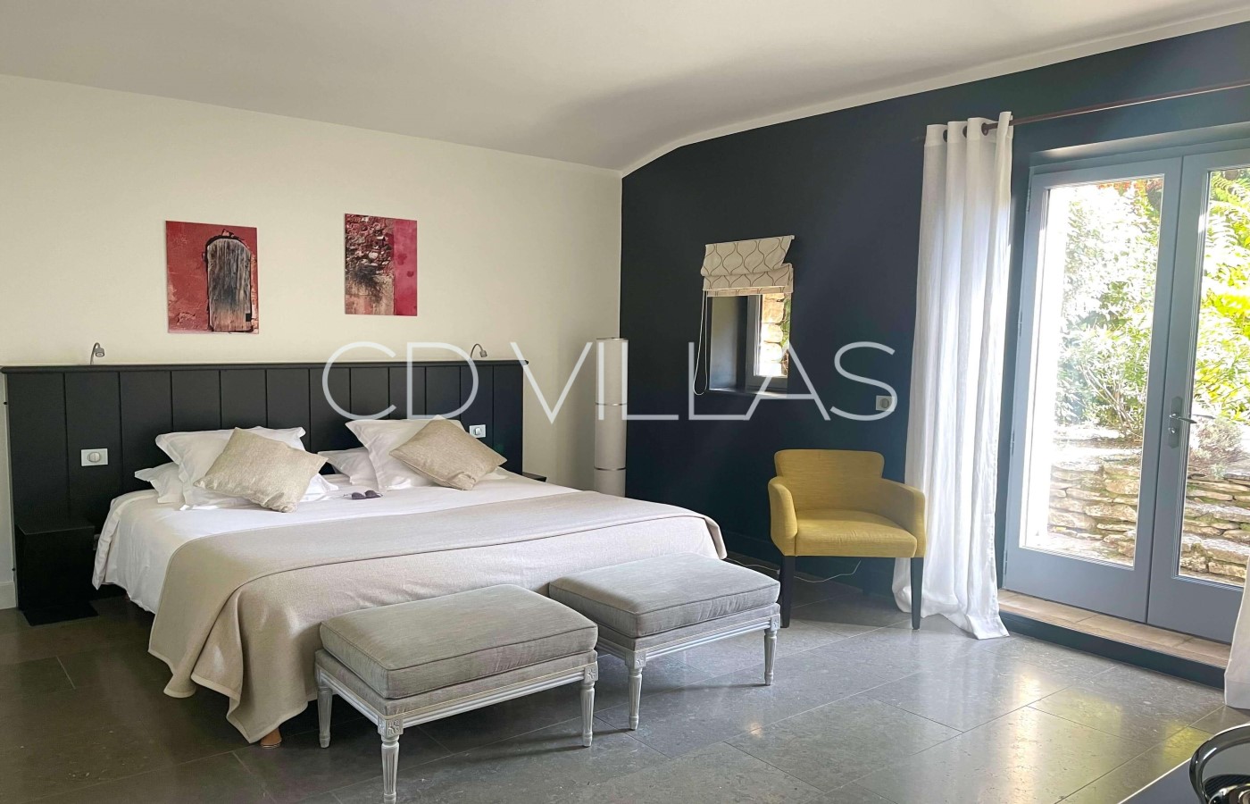 La propriété possède 7 chambres pouvant être doubles ou twin et 7 salles de bains, pouvant accueillir jusqu'à 15 personnes. Toutes les chambres sont climatisées et bénéficient d'équipements hôteliers tels que cafetière et théière, wifi, sèche-cheveux et articles de toilette. Celles du rez-de-chaussée disposent chacune d'une terrasse privative donnant sur un jardin au charme provençal authentique (restanques, bories, lavandes, oliviers, figuiers...). Les chambres à l'étage bénéficient d'une vue spectaculaire sur le Luberon et le château médiéval de Gordes.