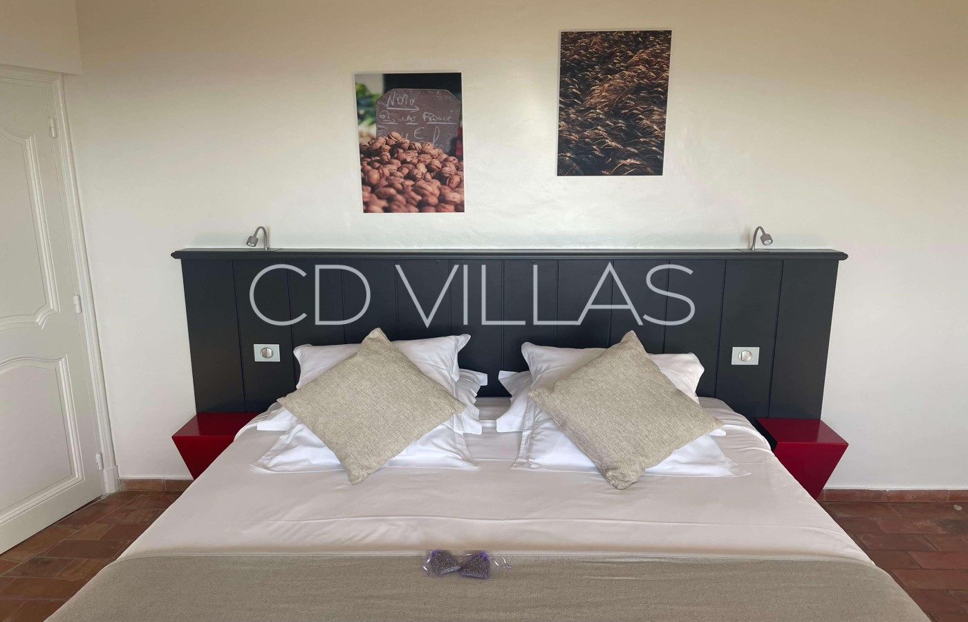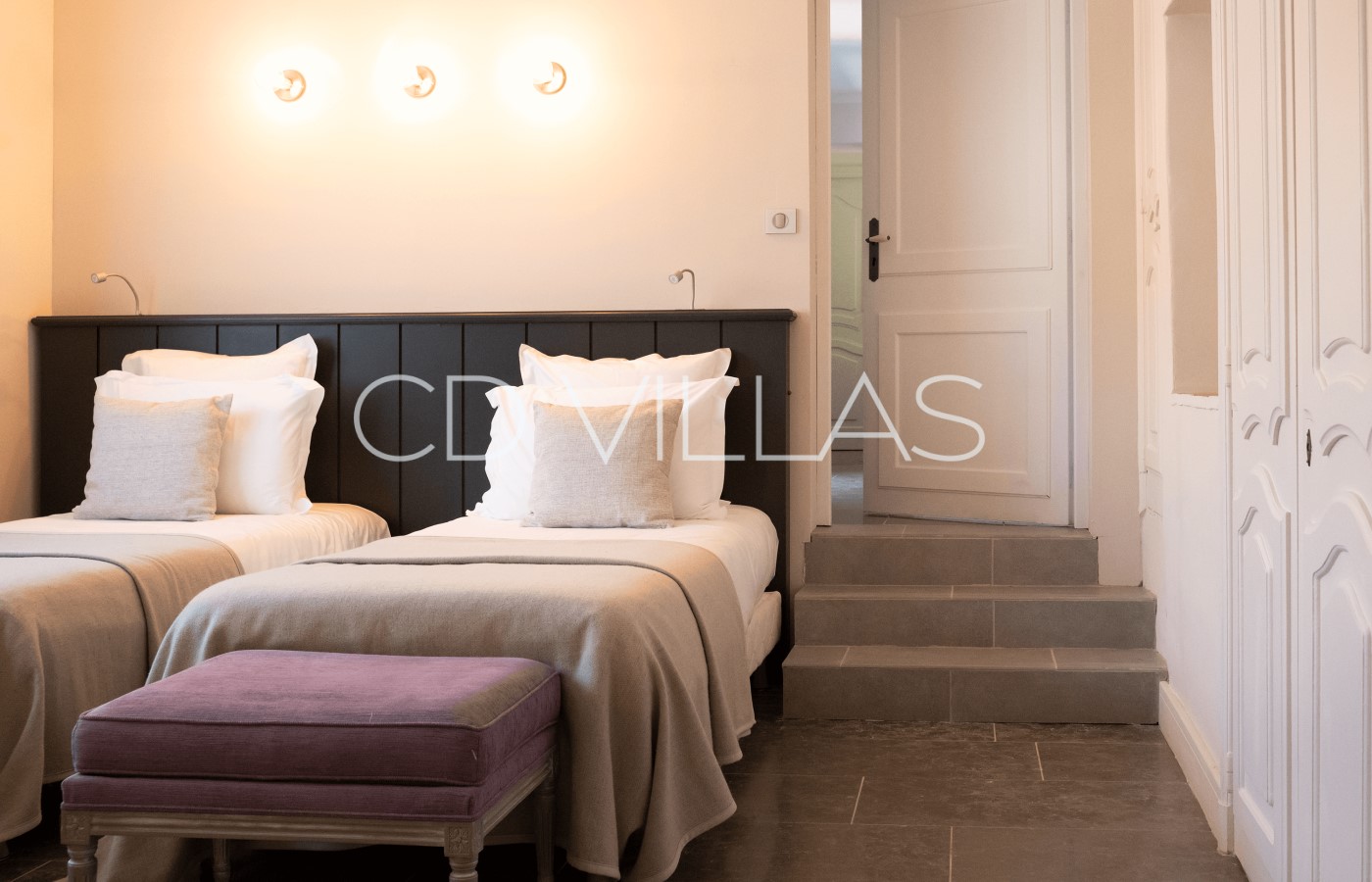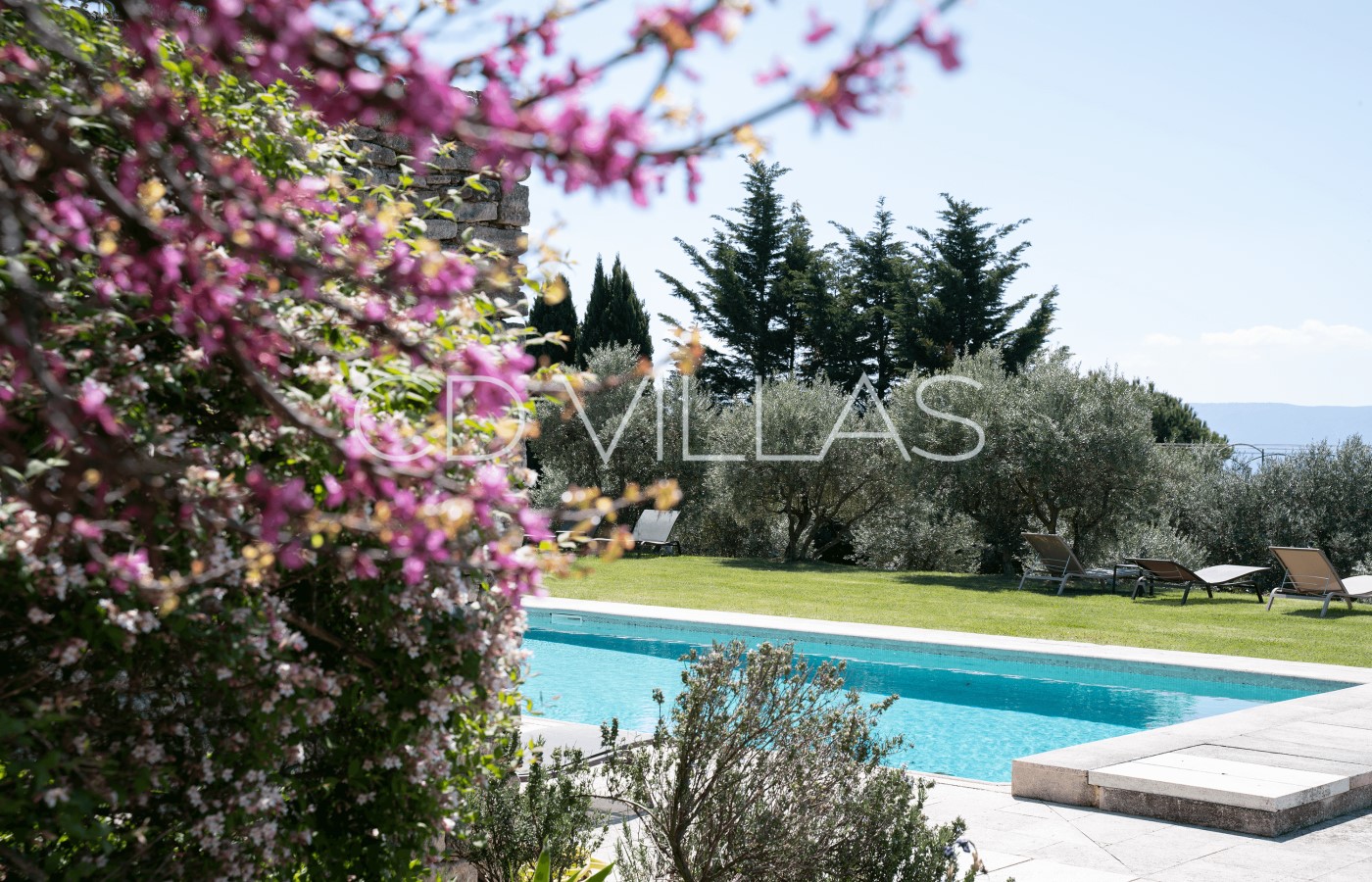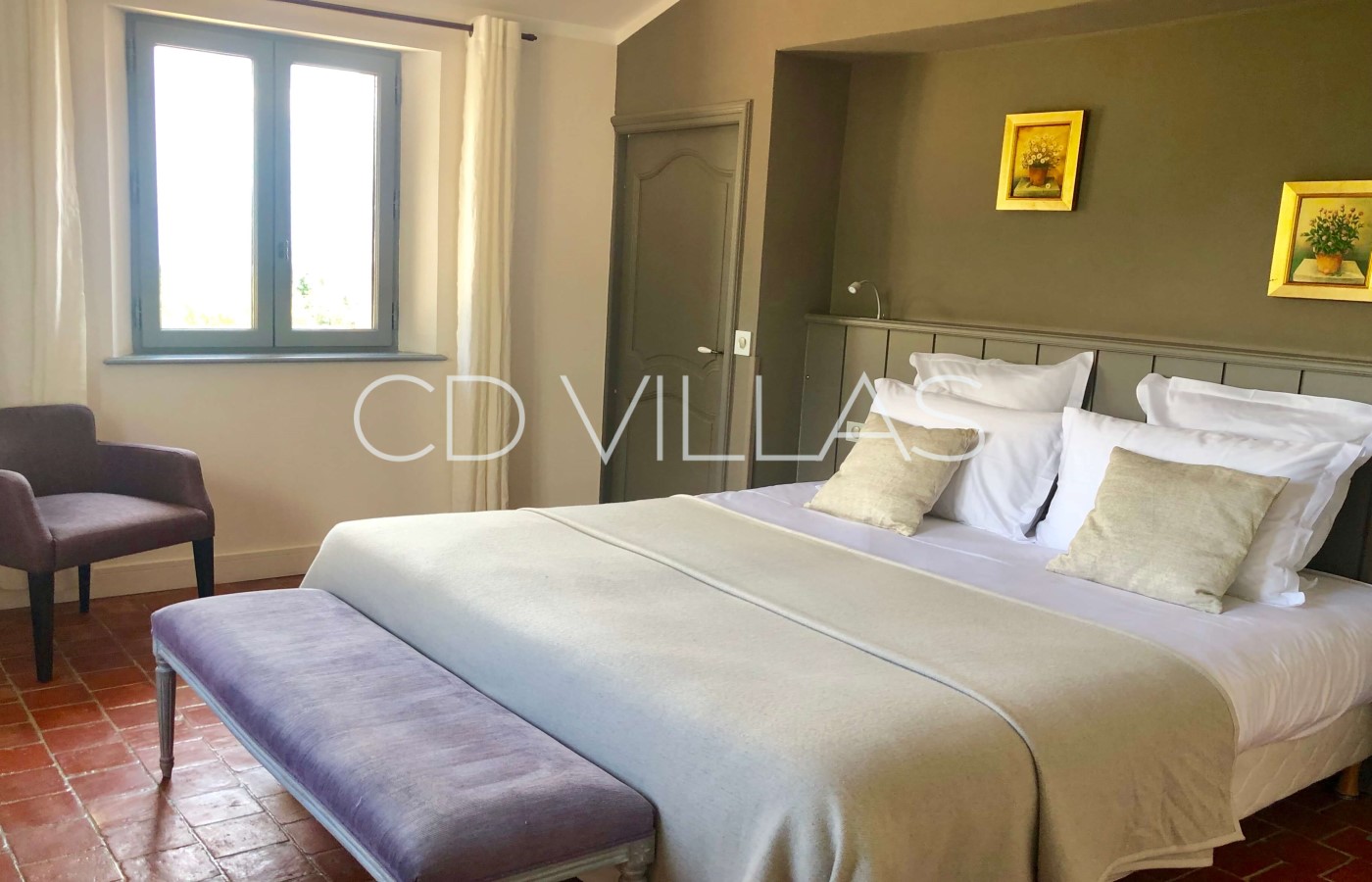 La propriété possède 7 chambres pouvant être doubles ou twin et 7 salles de bains, pouvant accueillir jusqu'à 15 personnes. Toutes les chambres sont climatisées et bénéficient d'équipements hôteliers tels que cafetière et théière, wifi, sèche-cheveux et articles de toilette. Celles du rez-de-chaussée disposent chacune d'une terrasse privative donnant sur un jardin au charme provençal authentique (restanques, bories, lavandes, oliviers, figuiers...). Les chambres à l'étage bénéficient d'une vue spectaculaire sur le Luberon et le château médiéval de Gordes.