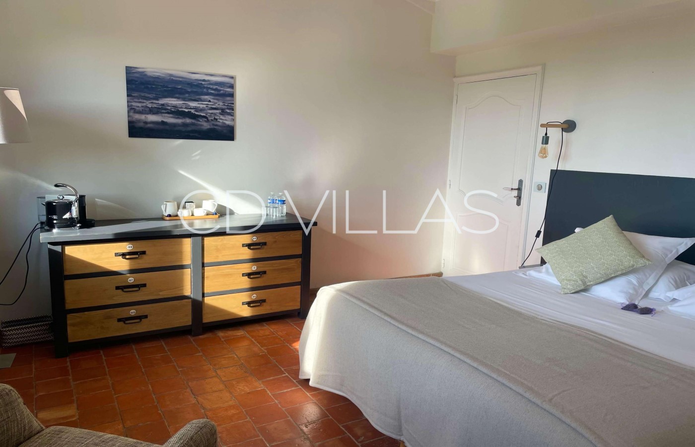 Chambre 5 - Chambre double située au premier étage avec lit double Kingsize et salle de bains en suite. Belle vue sur le château de Gordes et les collines du Luberon.