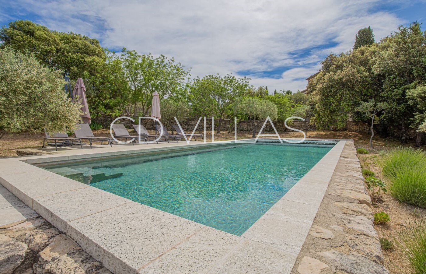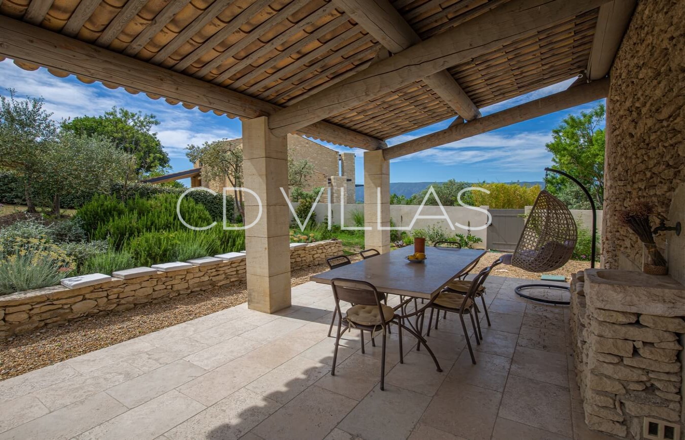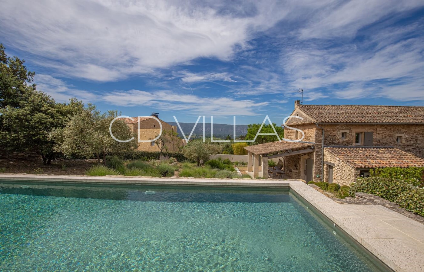 La maison offre calme et intimité sans être isolée, avec un magnifique jardin provençal, partiellement clôturé de murs en pierres sèches traditionnels de Gordes. La piscine, véritable oasis de fraîcheur, est située sur une restanque offrant une vue magnifique sur le Luberon.
