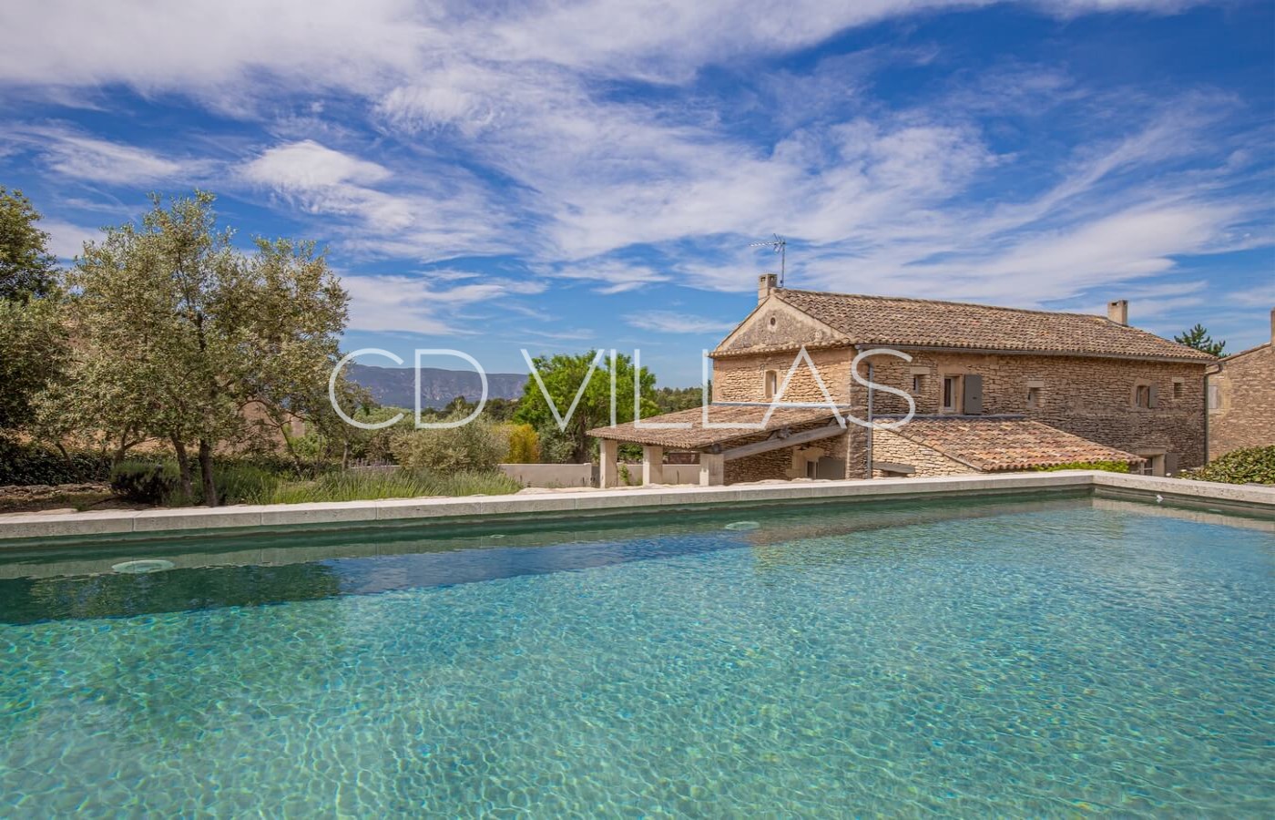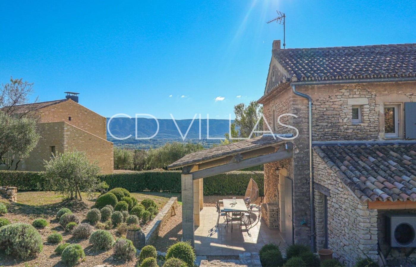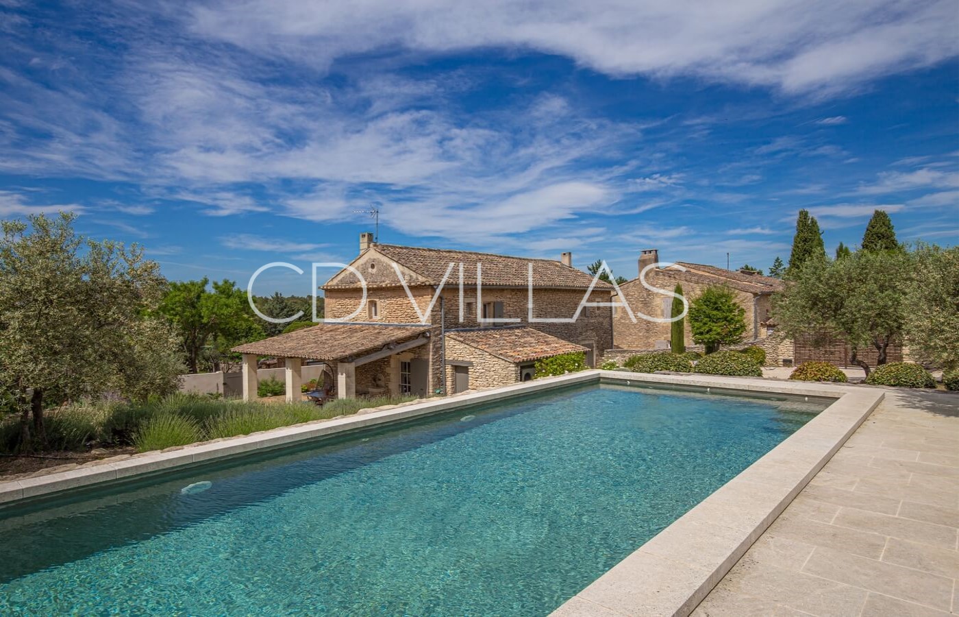 La maison offre calme et intimité sans être isolée, avec un magnifique jardin provençal, partiellement clôturé de murs en pierres sèches traditionnels de Gordes. La piscine, véritable oasis de fraîcheur, est située sur une restanque offrant une vue magnifique sur le Luberon.
