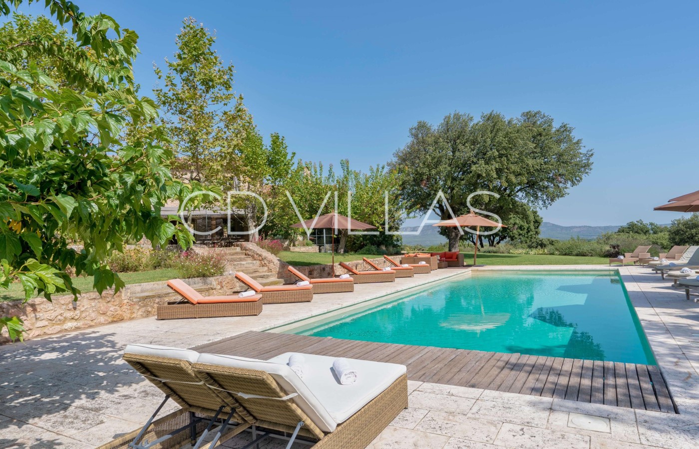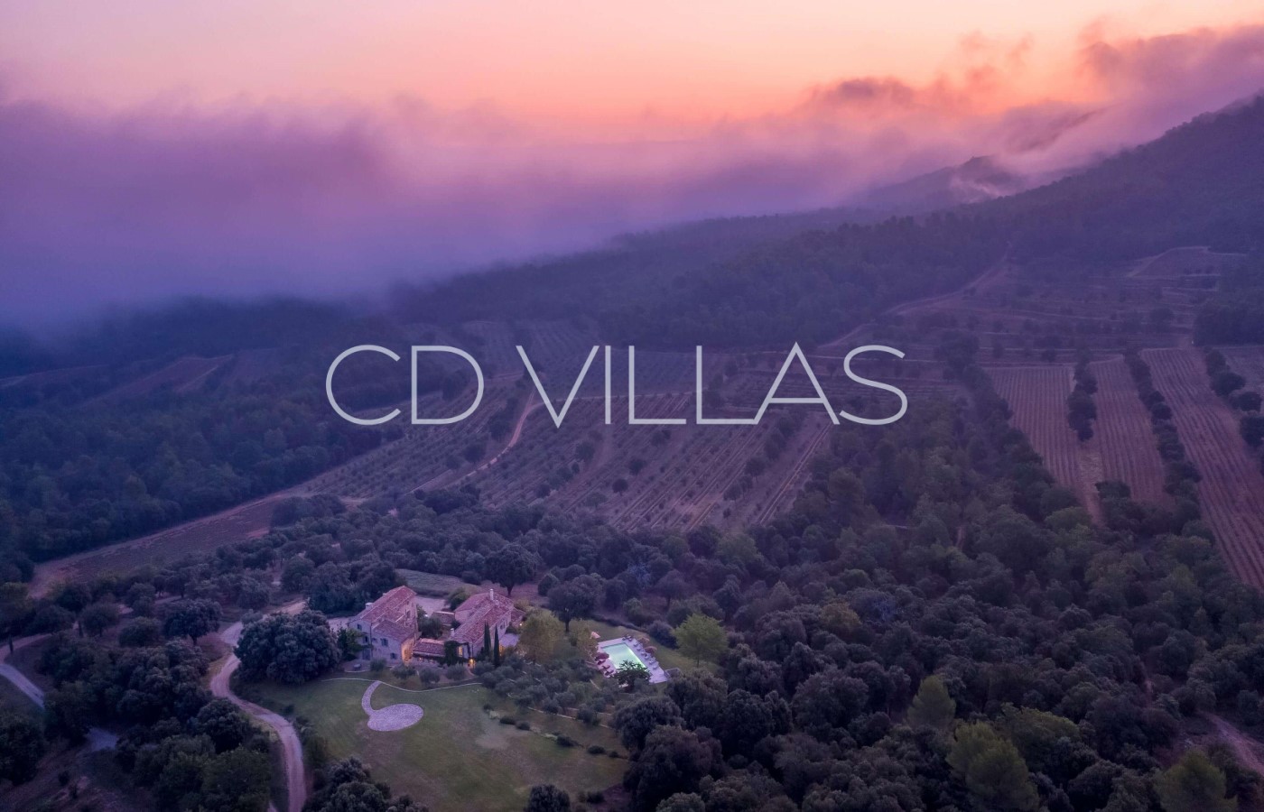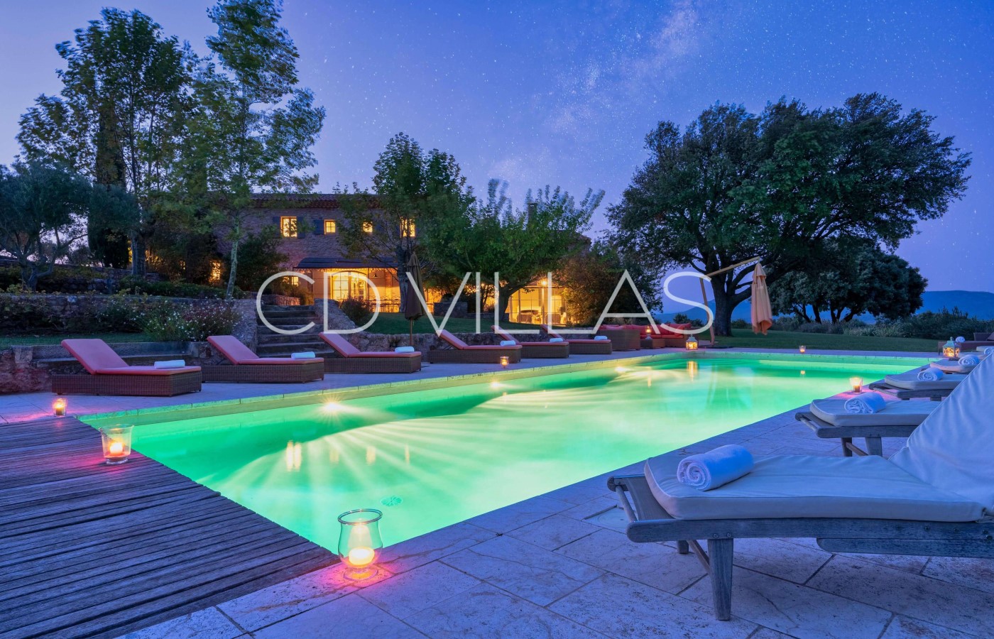 La propriété est située au cœur de son propre domaine, entouré de lavandes et d'oliviers. L'accès se fait par un chemin privé à travers bois et champs, ou par hélicoptère grâce à un héliport dans la propriété. Profitant d'une position élevée, la propriété offre une vue imprenable sur la campagne environnante avec les montagnes en arrière-plan.