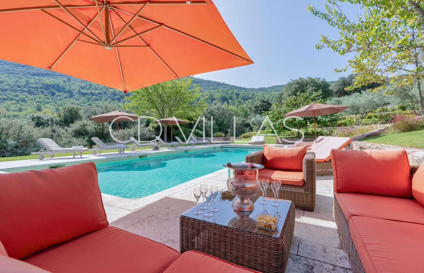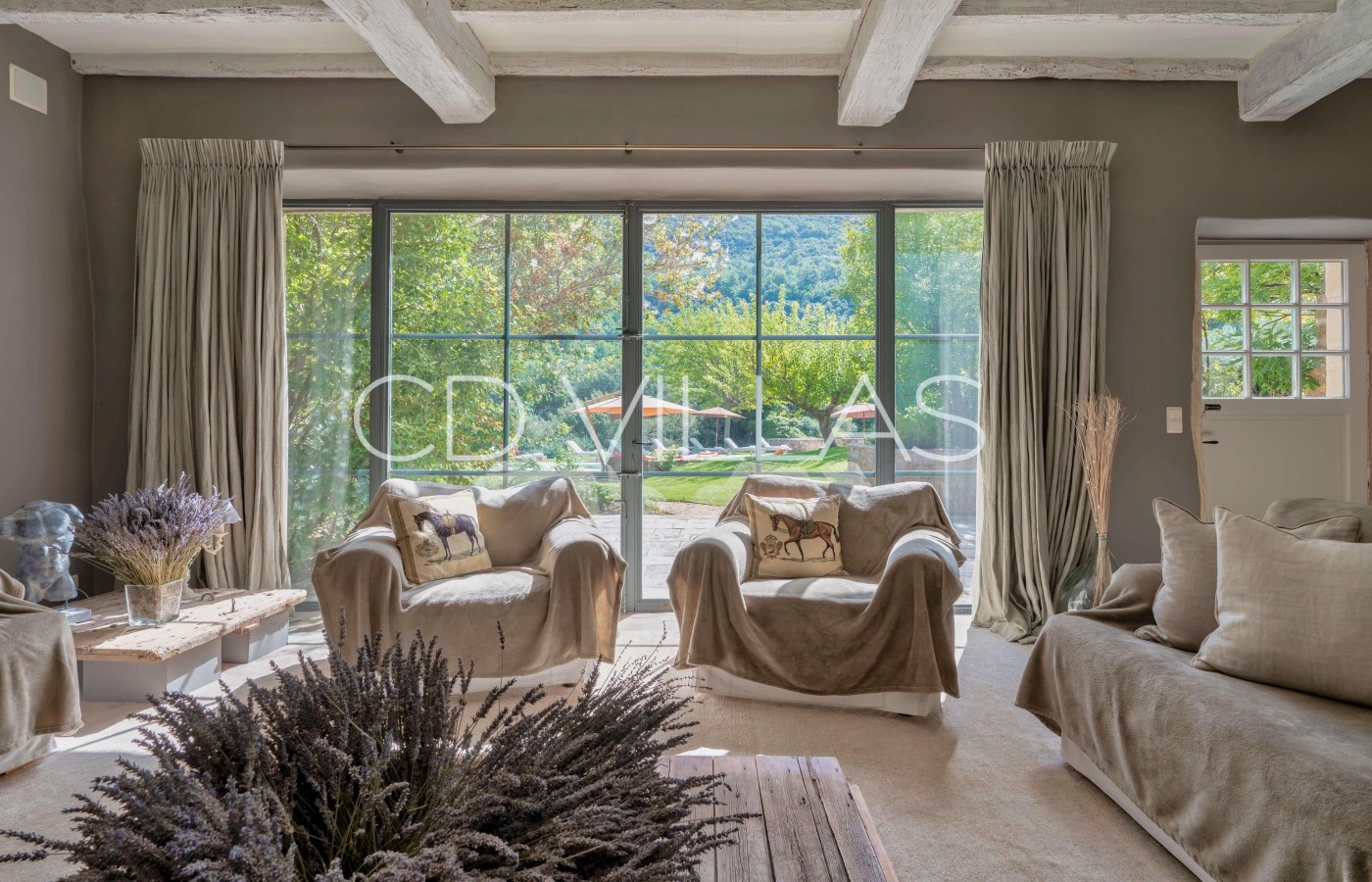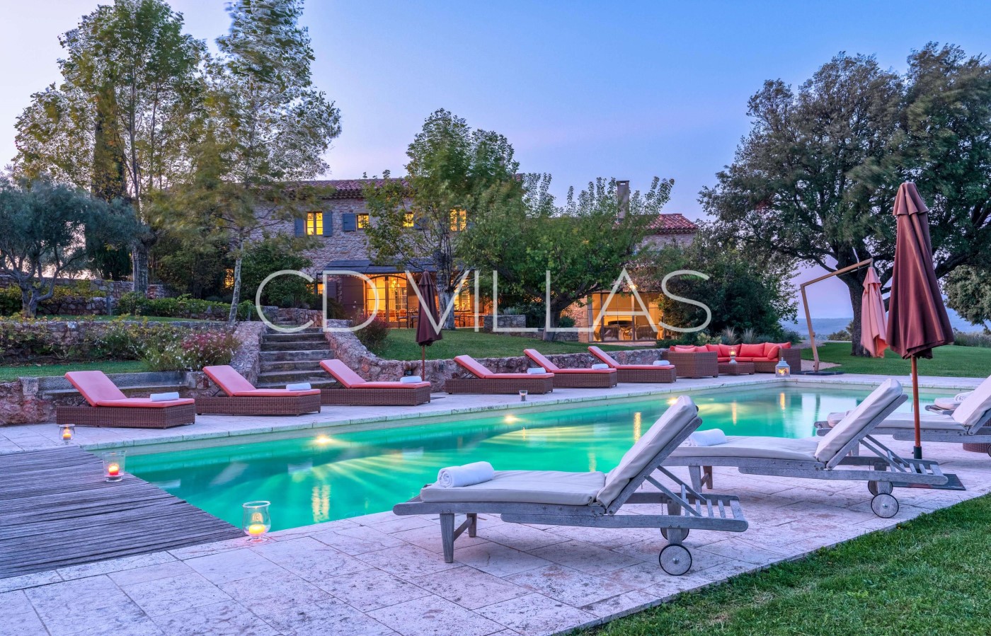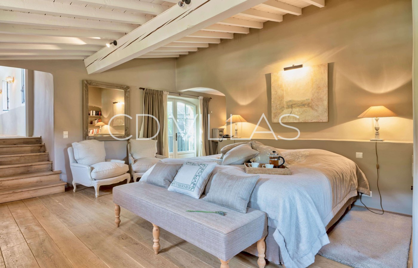 La propriété est située au cœur de son propre domaine, entouré de lavandes et d'oliviers. L'accès se fait par un chemin privé à travers bois et champs, ou par hélicoptère grâce à un héliport dans la propriété. Profitant d'une position élevée, la propriété offre une vue imprenable sur la campagne environnante avec les montagnes en arrière-plan.