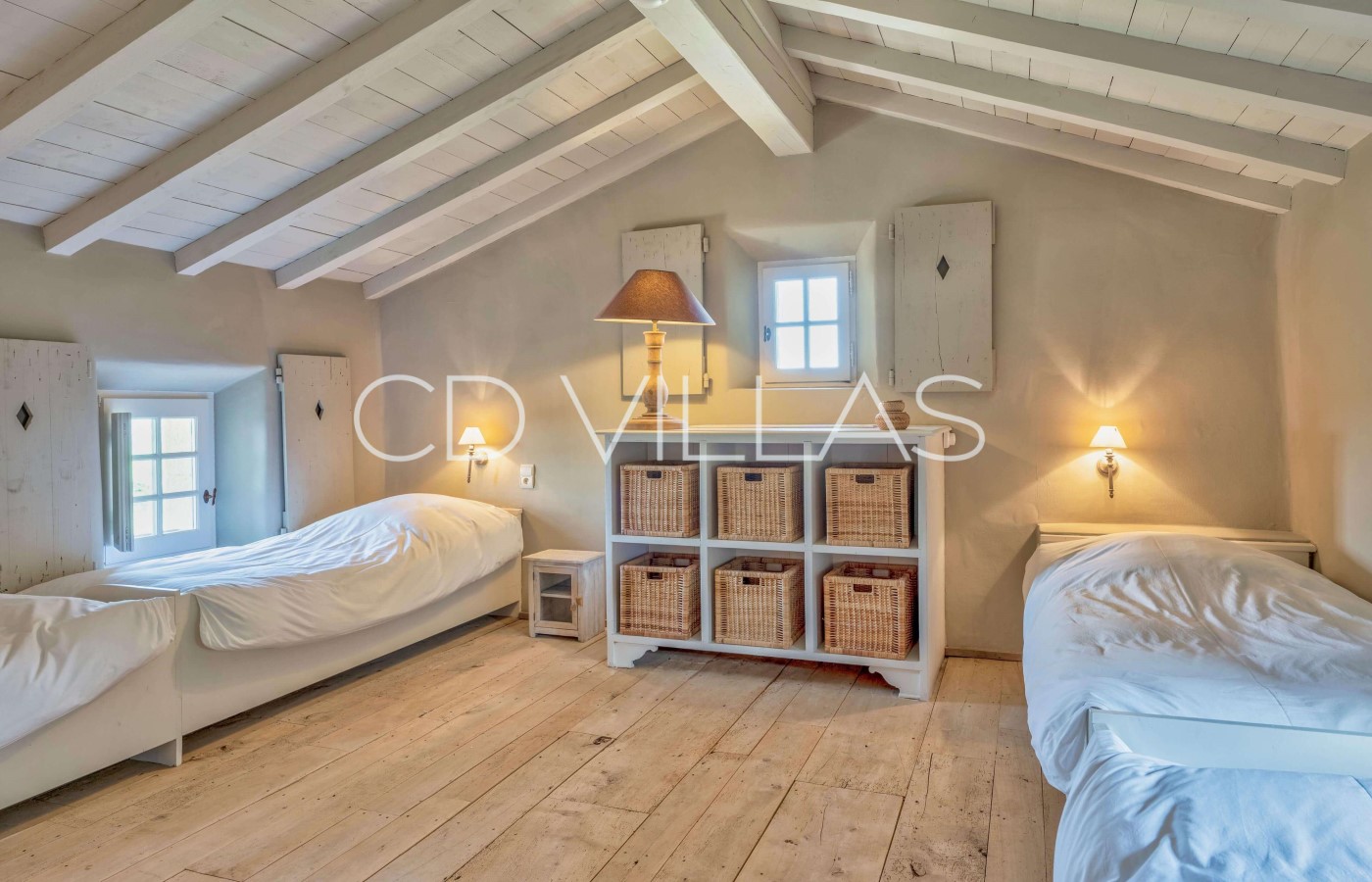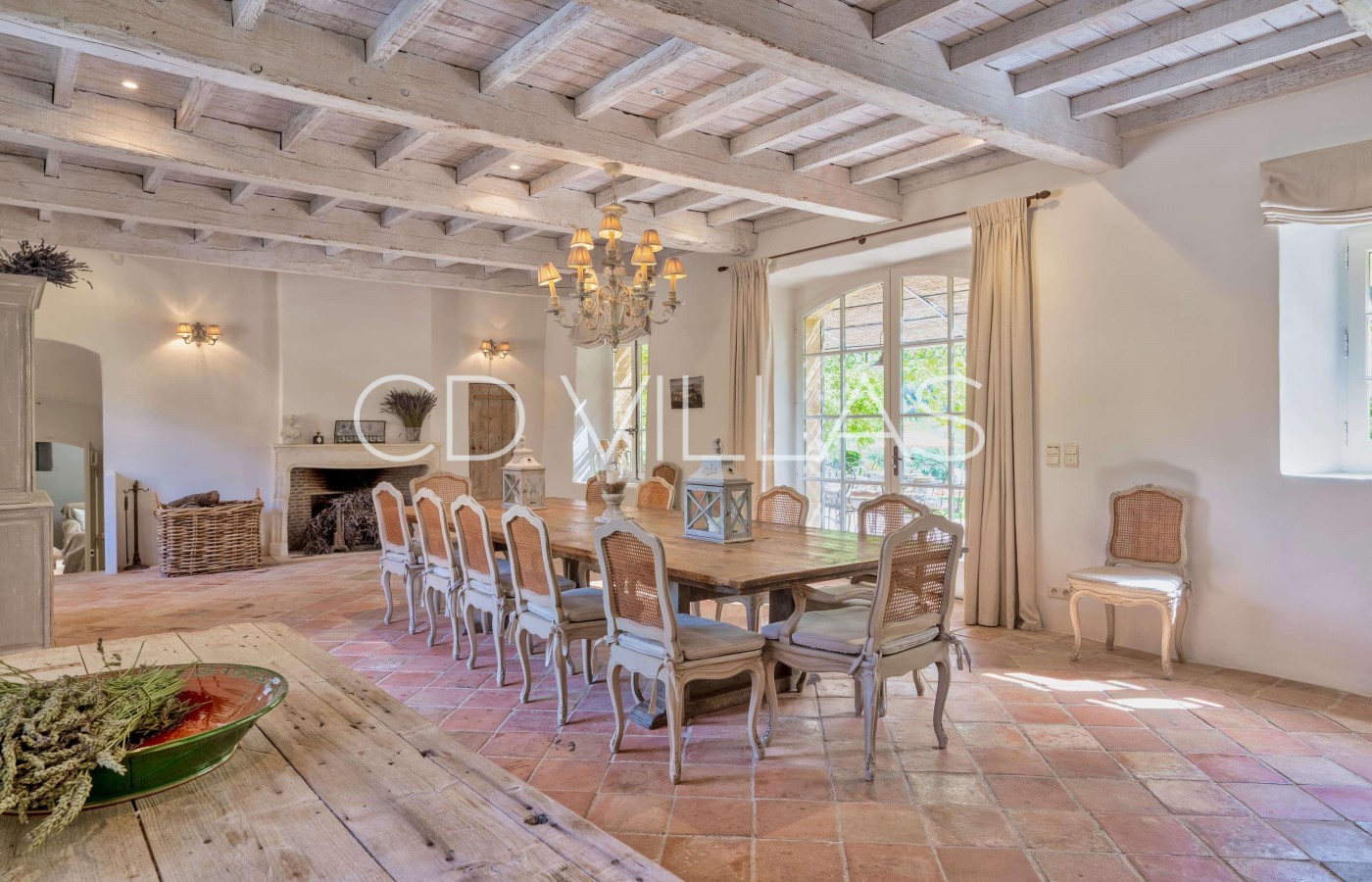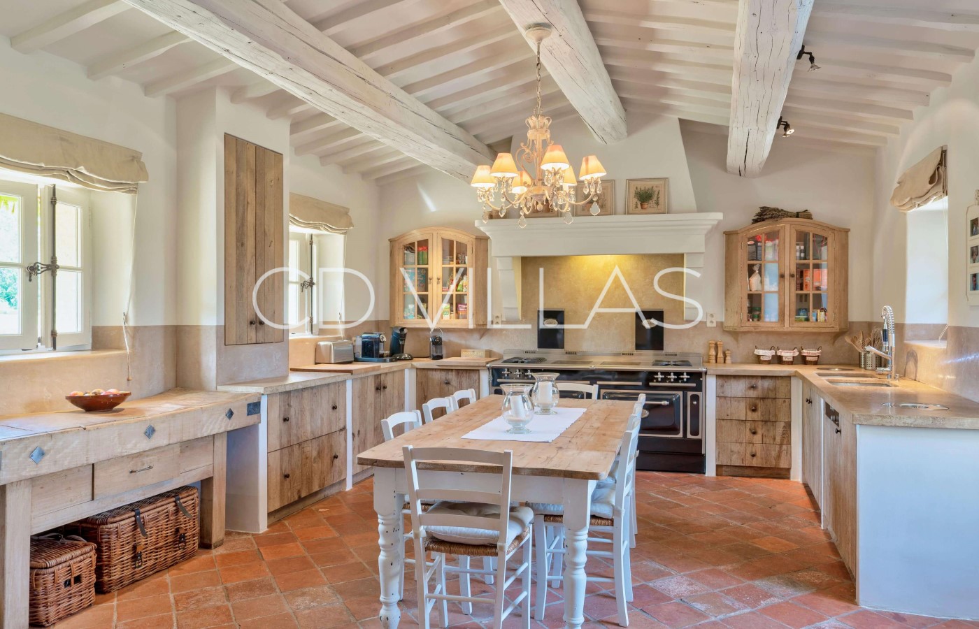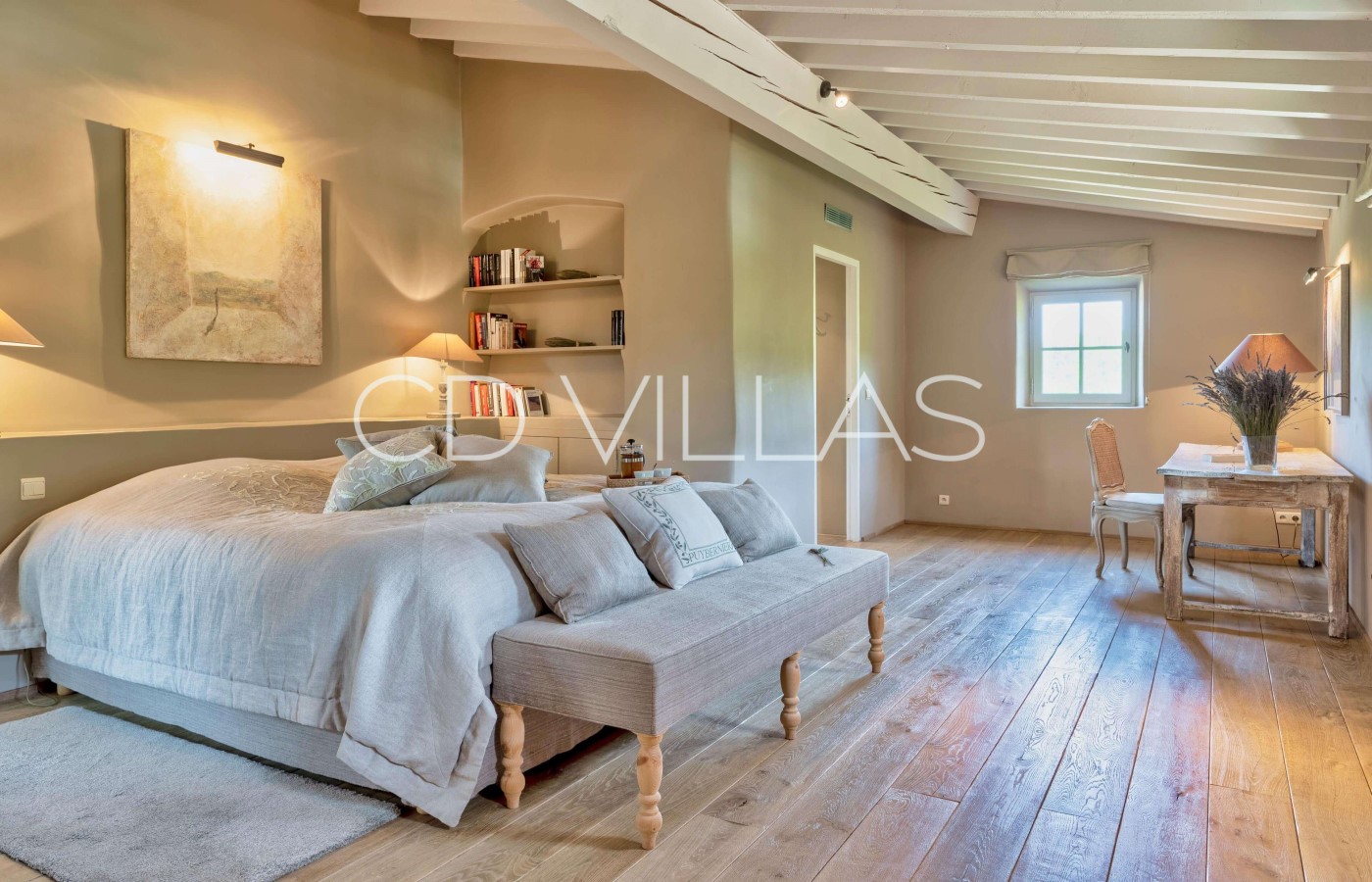 La maison principale est un imposant mas de 2 étages avec un hall d'entrée, un grand salon avec cheminée à foyer ouvert et accès à la terrasse avec barbecue, une salle à manger avec poutres apparentes, une grande cuisine entièrement équipée avec table de petit-déjeuner, chambre froide et buanderie adjacentes. Au premier étage il y a quatre chambres à coucher: une immense chambre principale avec dressing et coin salon, ainsi que trois chambres doubles toutes avec salle de bain en suite.