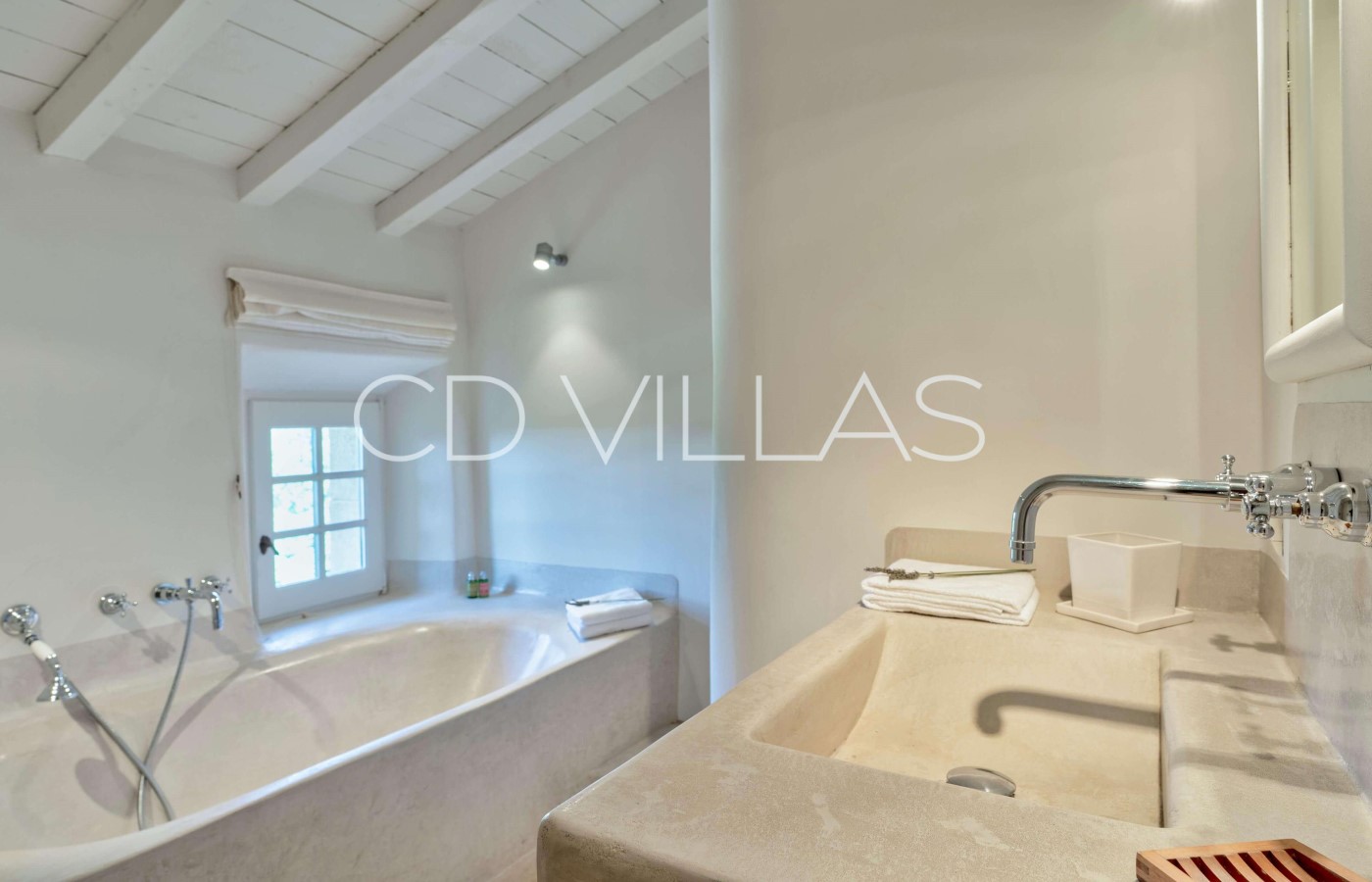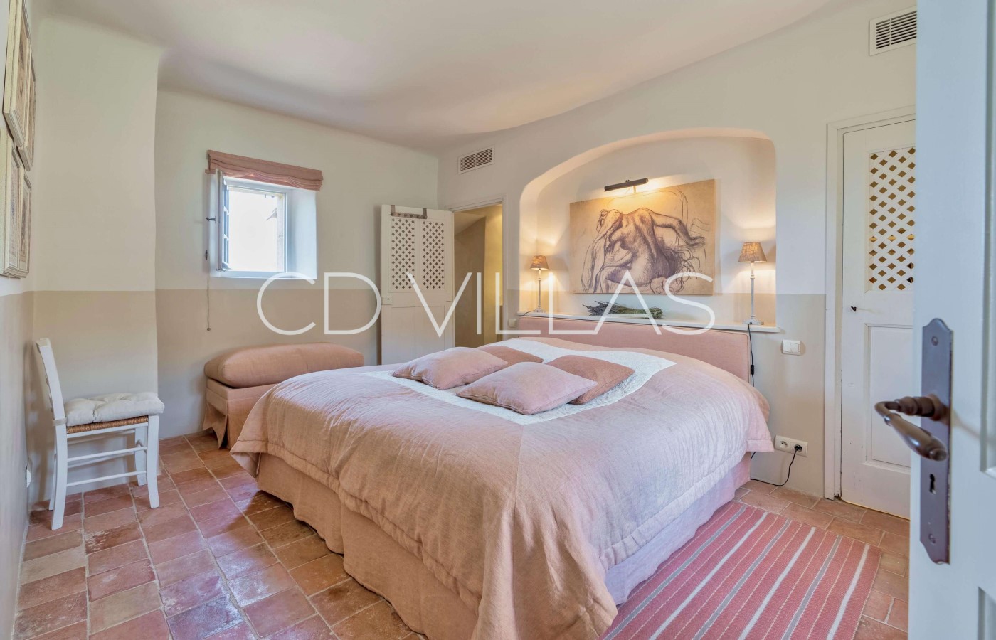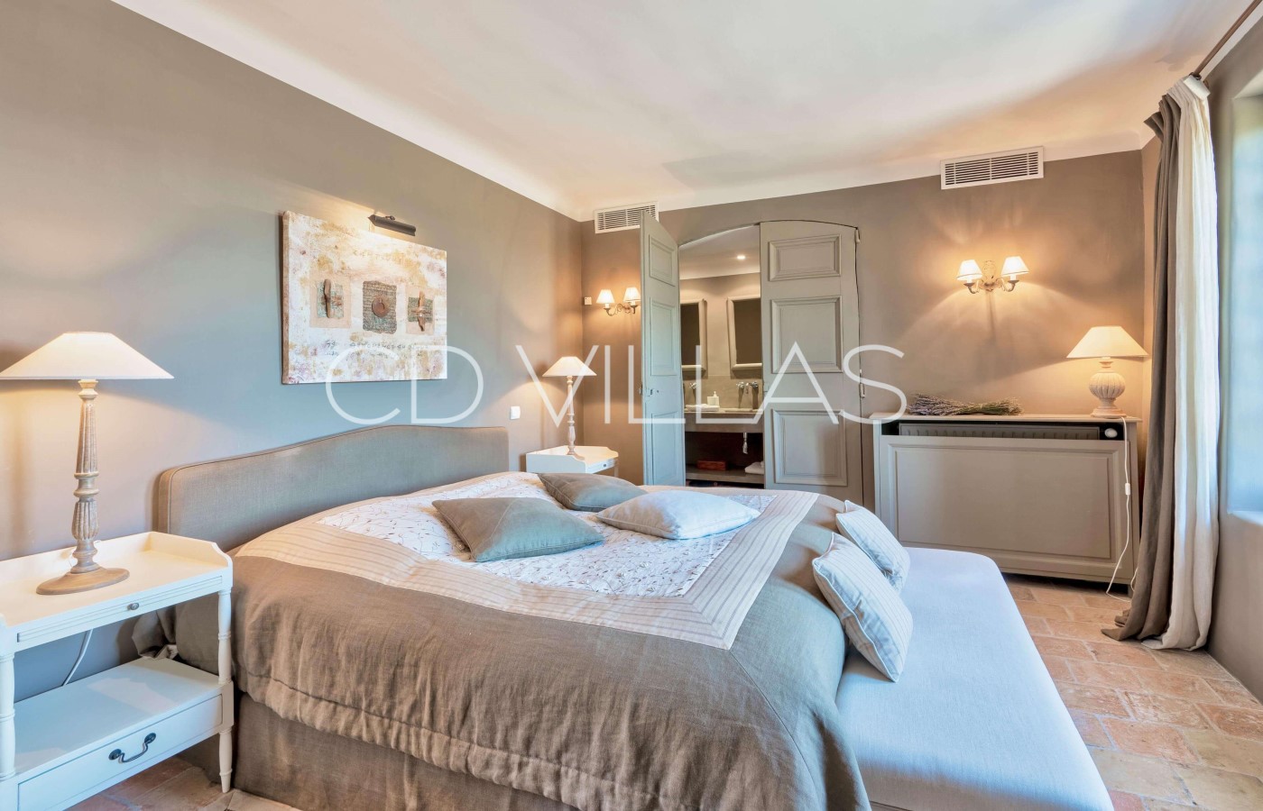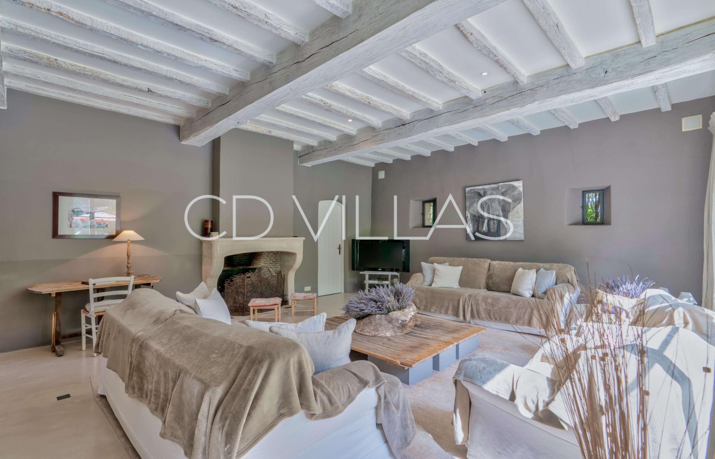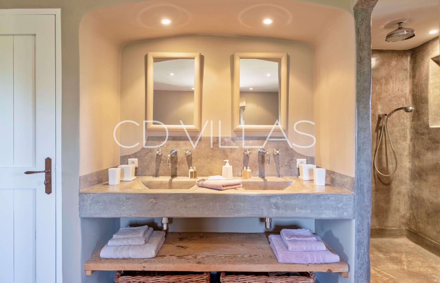 La maison principale est un imposant mas de 2 étages avec un hall d'entrée, un grand salon avec cheminée à foyer ouvert et accès à la terrasse avec barbecue, une salle à manger avec poutres apparentes, une grande cuisine entièrement équipée avec table de petit-déjeuner, chambre froide et buanderie adjacentes. Au premier étage il y a quatre chambres à coucher: une immense chambre principale avec dressing et coin salon, ainsi que trois chambres doubles toutes avec salle de bain en suite.