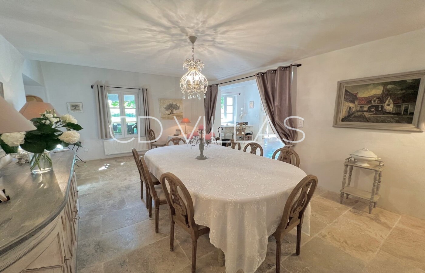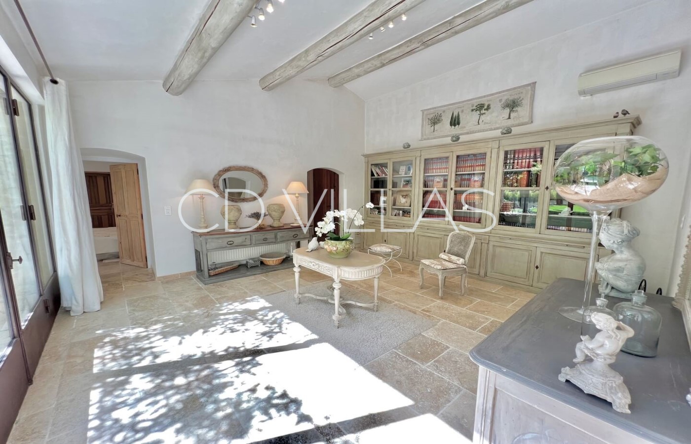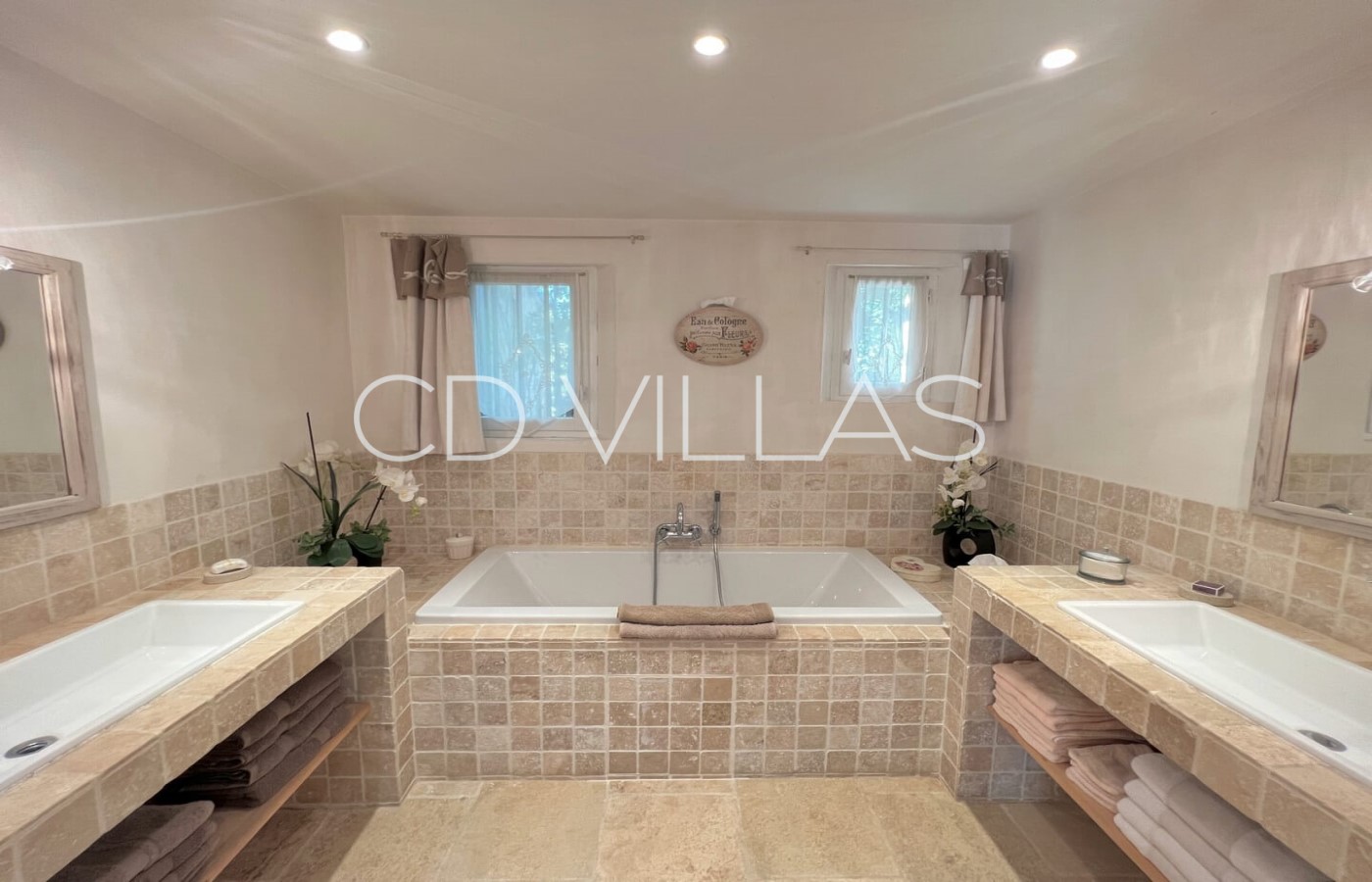 La décoration de la maison est raffinée et élégante dans les tons blancs et beiges. Au rez-de-chaussée vous trouverez un salon avec bibliothèque, un salon avec TV, une salle à manger et une grande cuisine équipée.