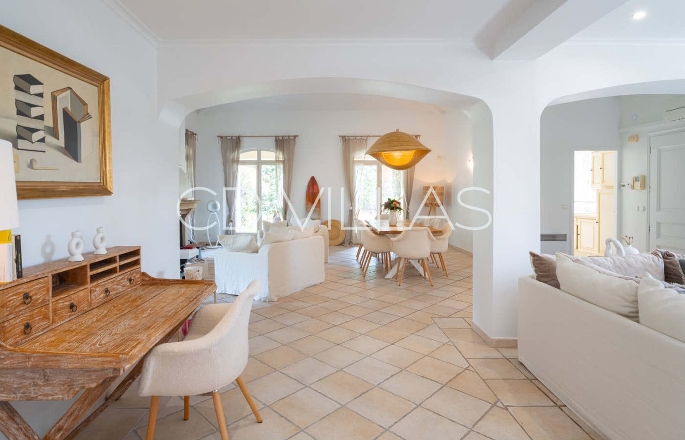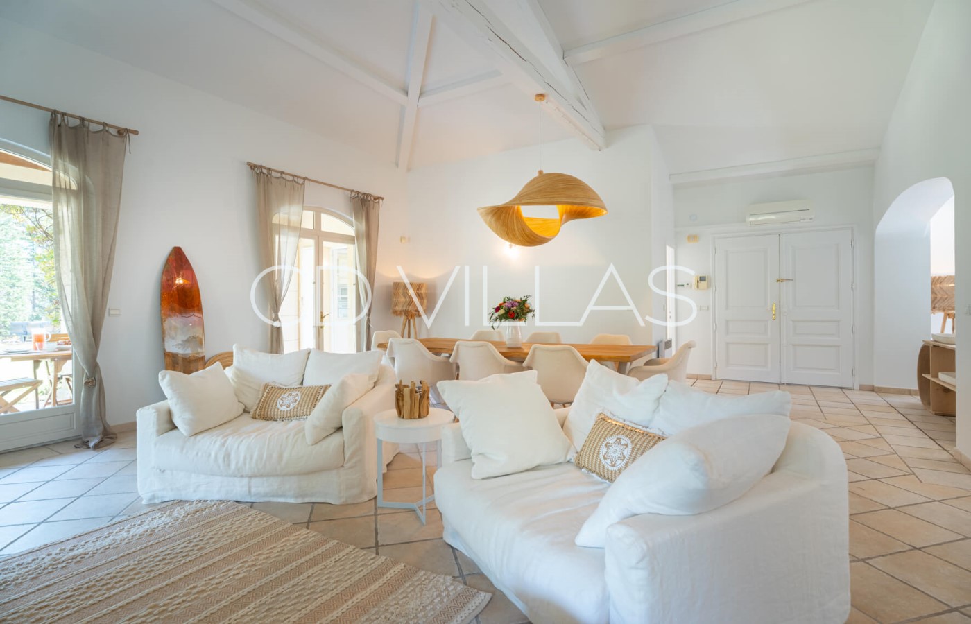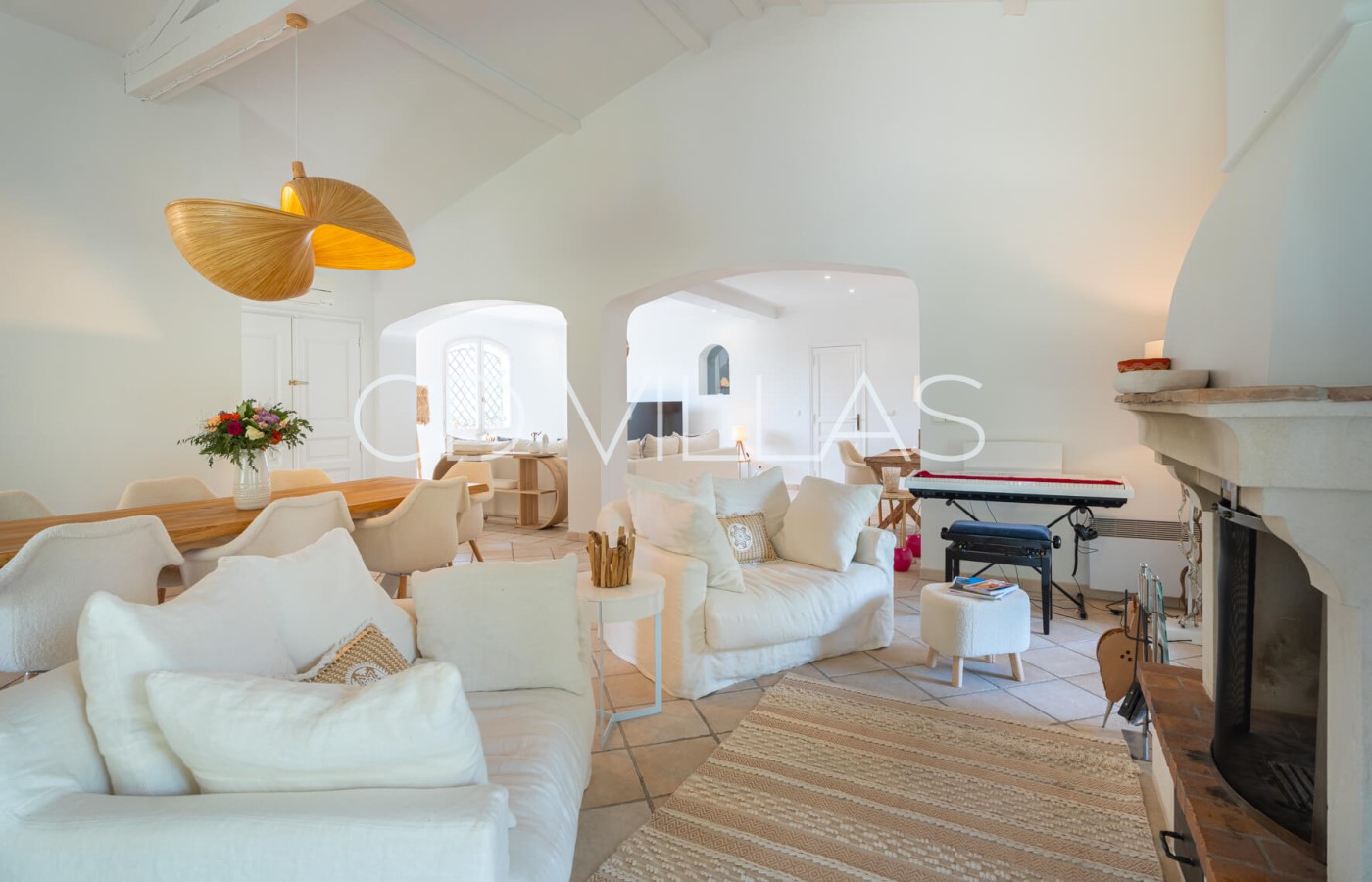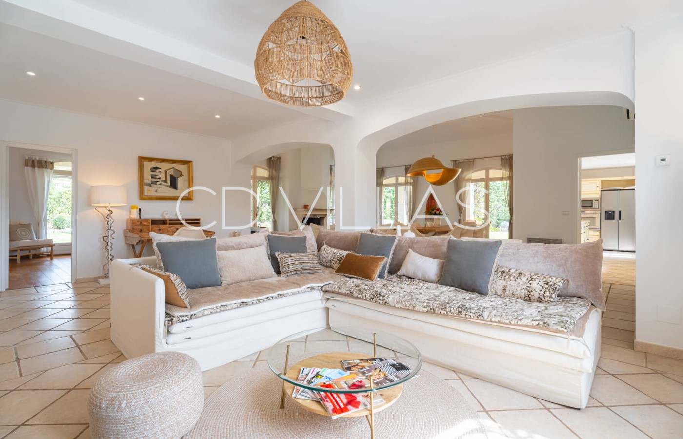 Il y a un spacieux séjour avec salle à manger et 2 coins salons. De larges baies vitrées s'ouvrent sur le jardin et la terrasse couverte. La cuisine est entièrement équipée avec des appareils modernes.