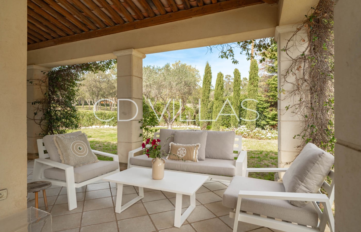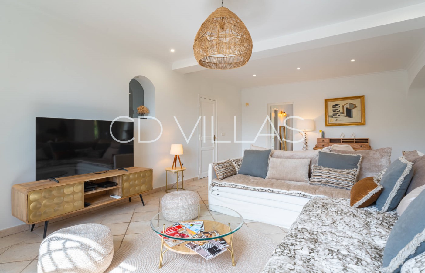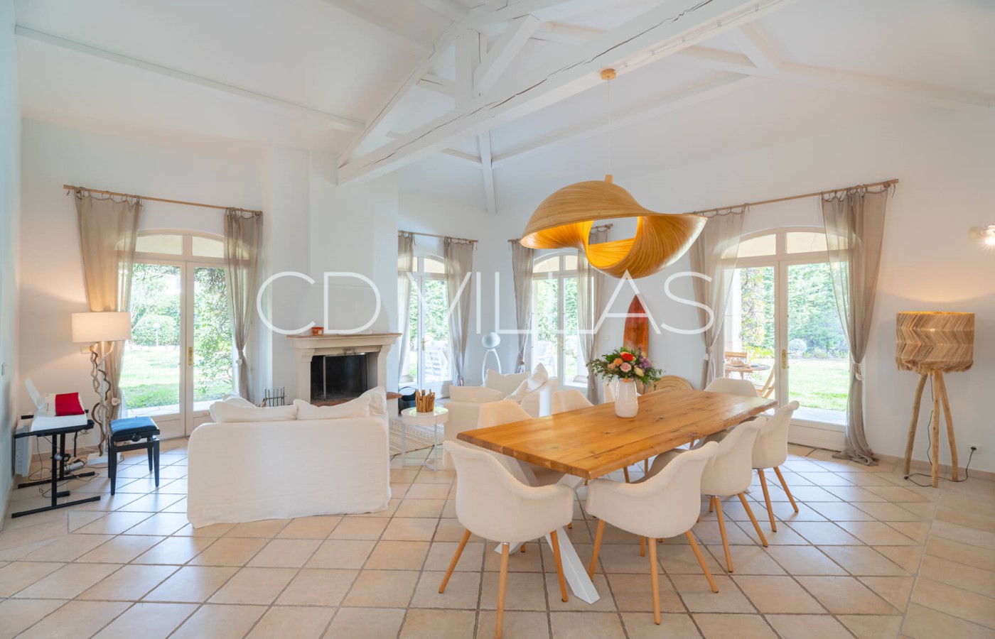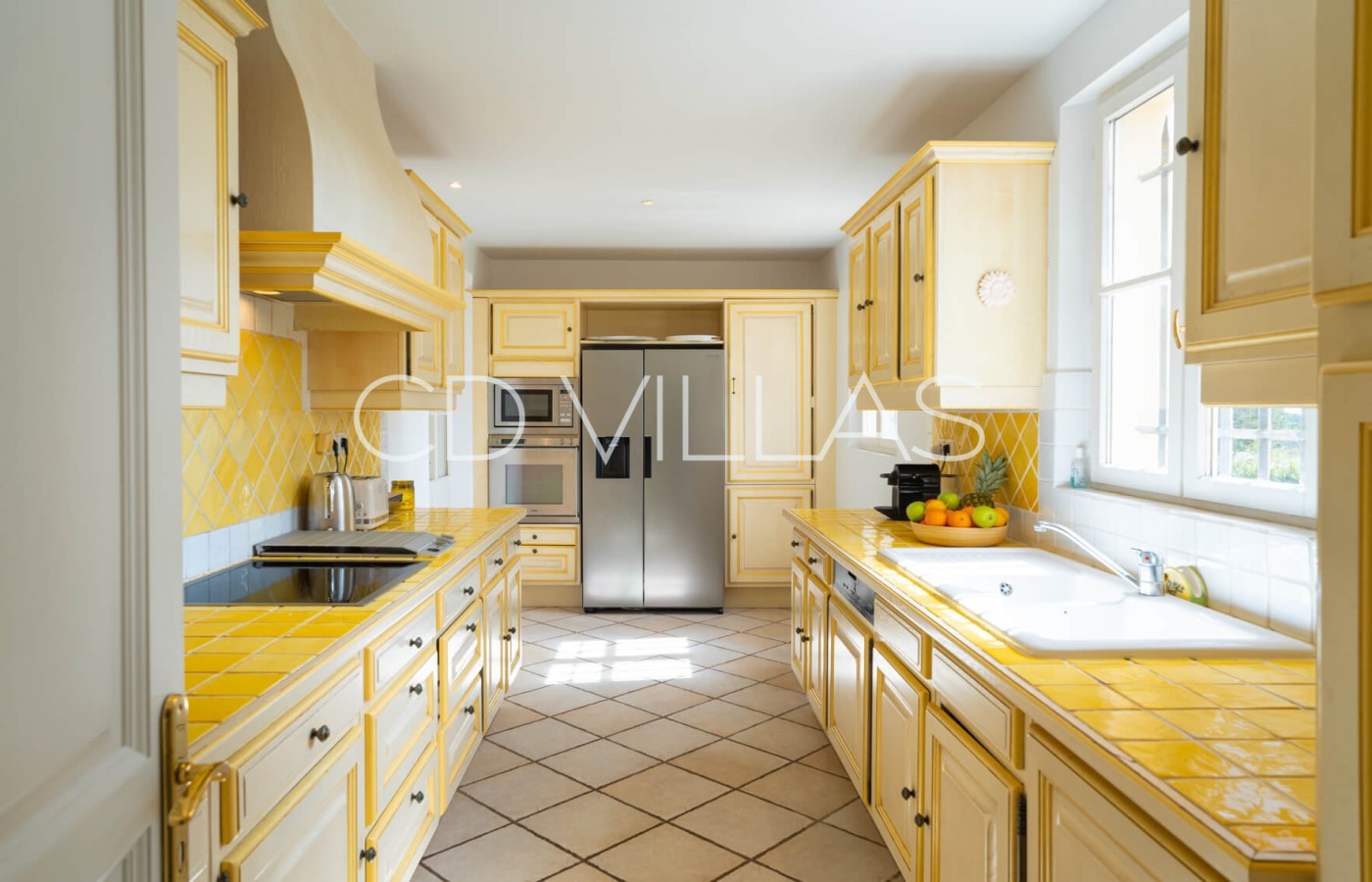 Il y a un spacieux séjour avec salle à manger et 2 coins salons. De larges baies vitrées s'ouvrent sur le jardin et la terrasse couverte. La cuisine est entièrement équipée avec des appareils modernes.