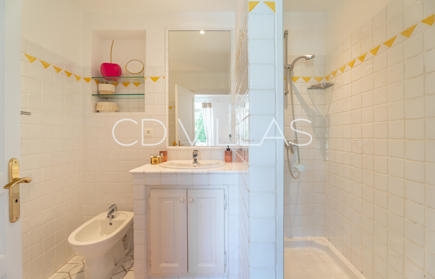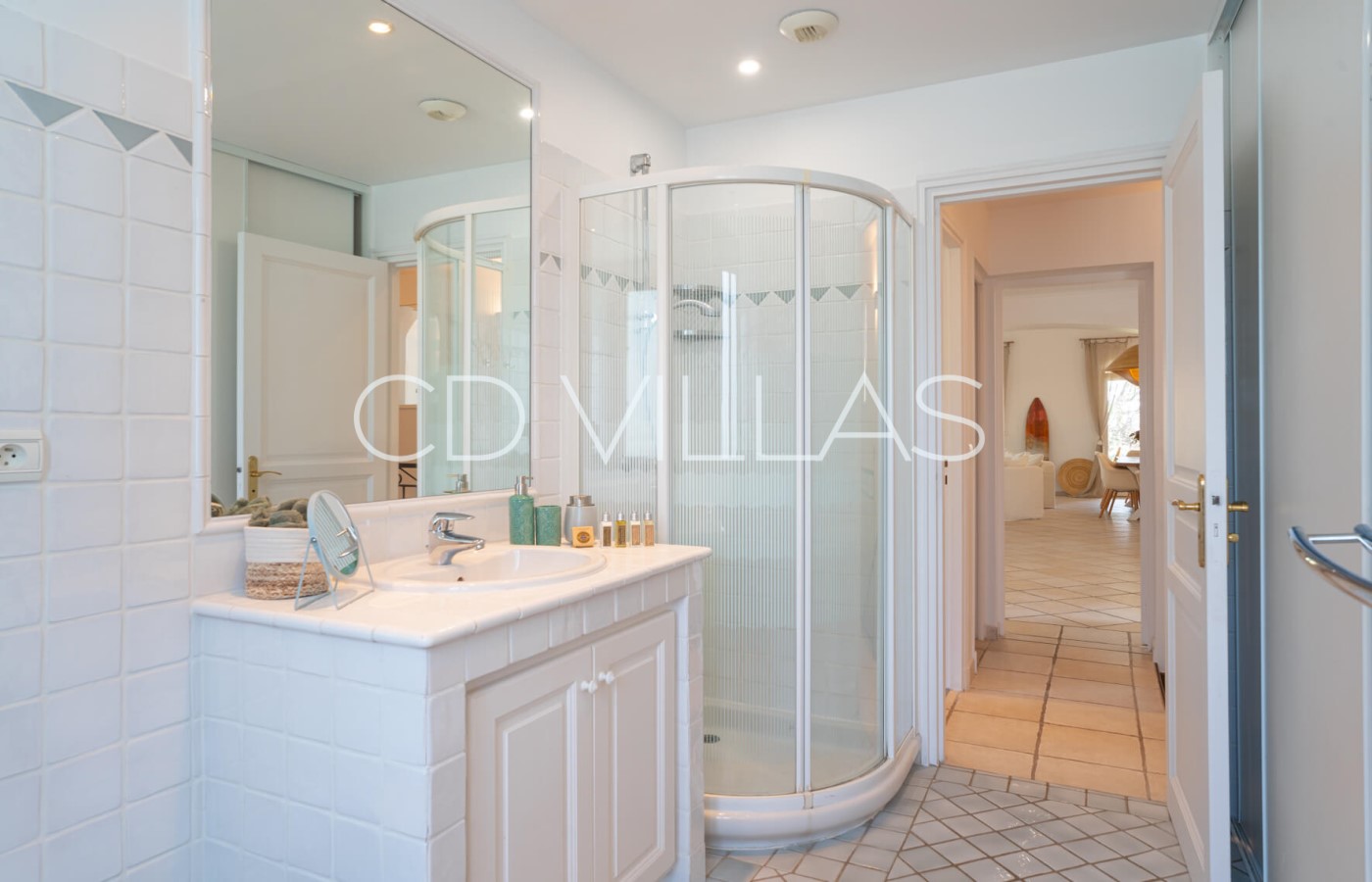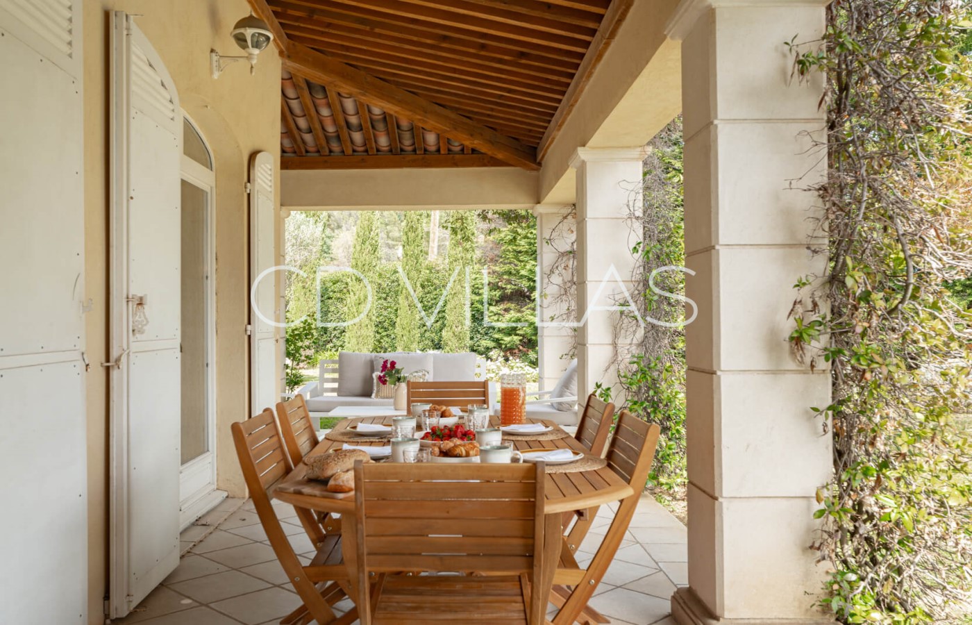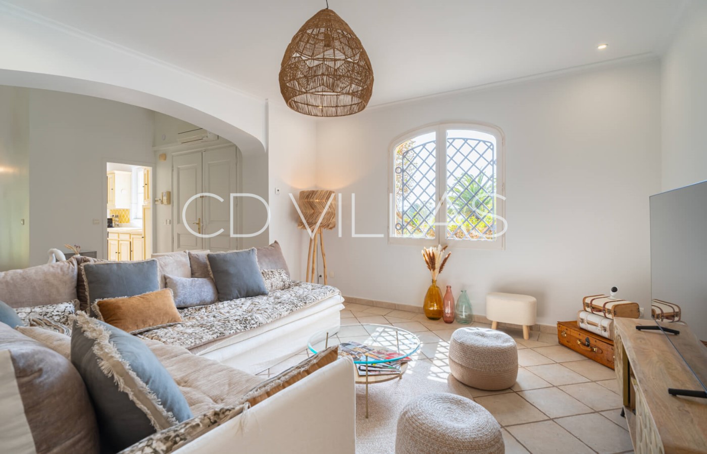 Il y a un spacieux séjour avec salle à manger et 2 coins salons. De larges baies vitrées s'ouvrent sur le jardin et la terrasse couverte. La cuisine est entièrement équipée avec des appareils modernes.