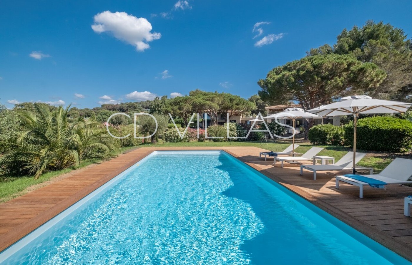 La piscine est entourée d'un pool house et d'une grande terrasse en bois avec chaises longues et parasols.