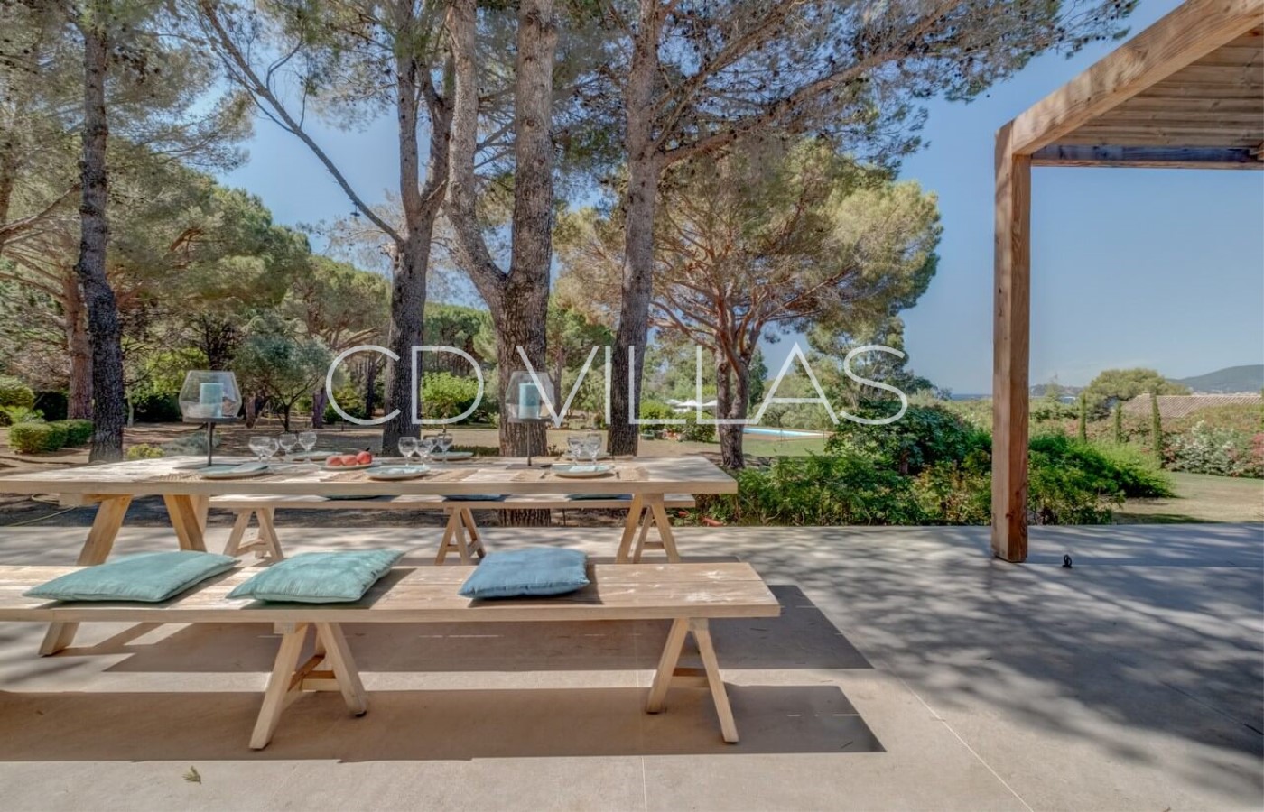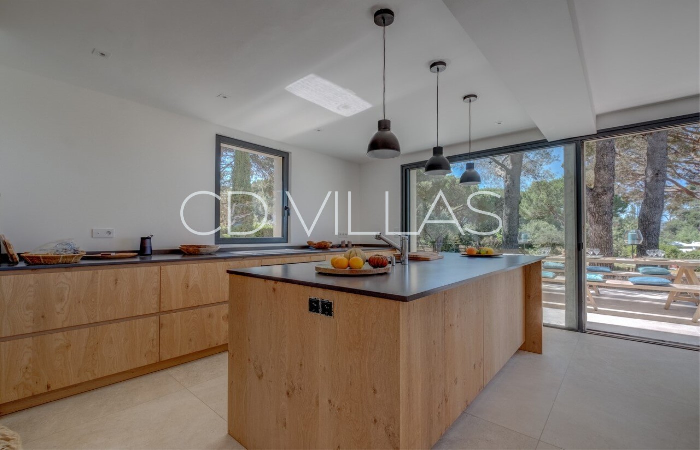 La villa sur 2 niveaux se compose d'un grand séjour ouvrant sur la terrasse et d'une cuisine ouverte avec salle à manger.