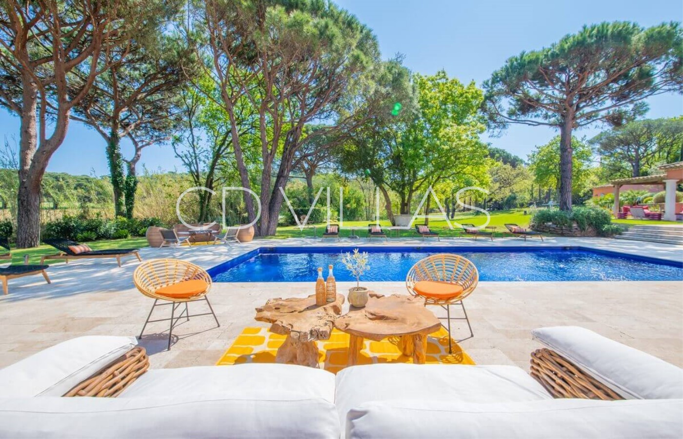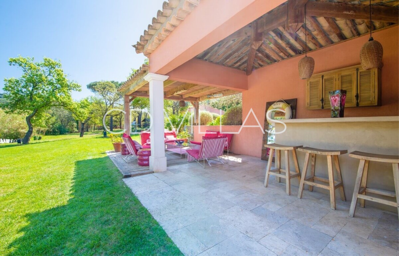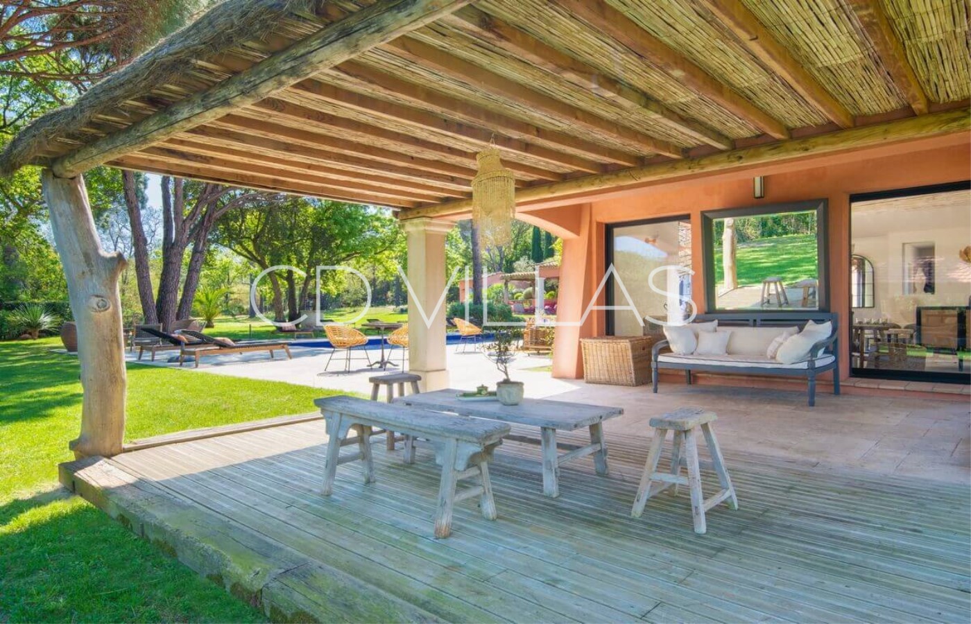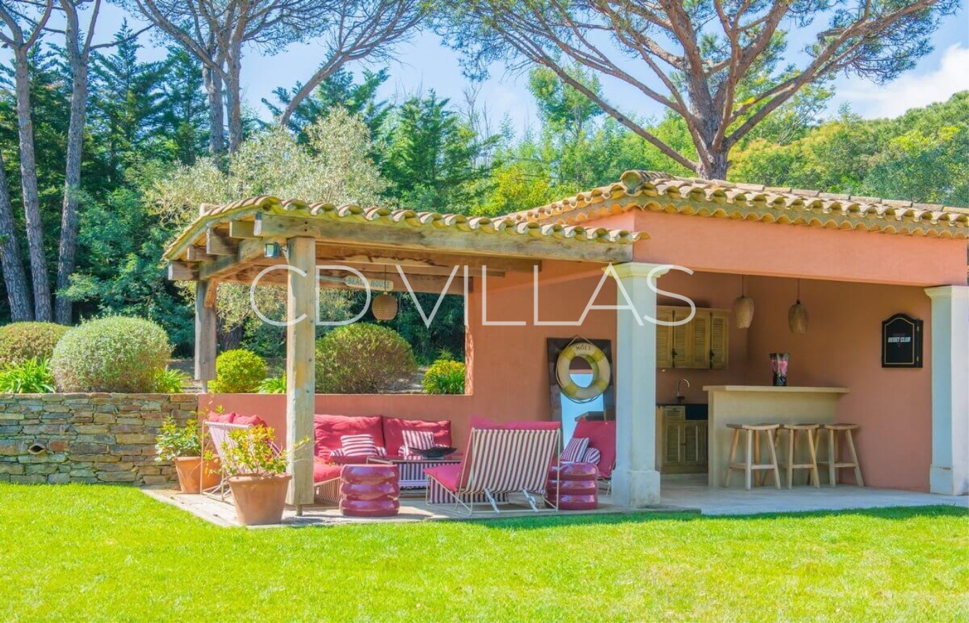 La villa se trouve dans un jardin fabuleux de 6000 m² de pelouses avec un terrain de pétanque, une cuisine d'été couverte avec table et canapés. Il y a une piscine de 11 mètres qui peut être chauffée, entourée d'une grande terrasse ensoleillée avec parasols, transats et tables ainsi qu'un barbecue familial. C'est un paradis pour les enfants car dans le jardin se trouvent une cabane en bois et des balançoires. Pendant ce temps, les parents peuvent trouver un refuge paisible dans le salon balinais en teck d'où vous pourrez admirer le coucher de soleil sur le pittoresque village perché de Ramatuelle.