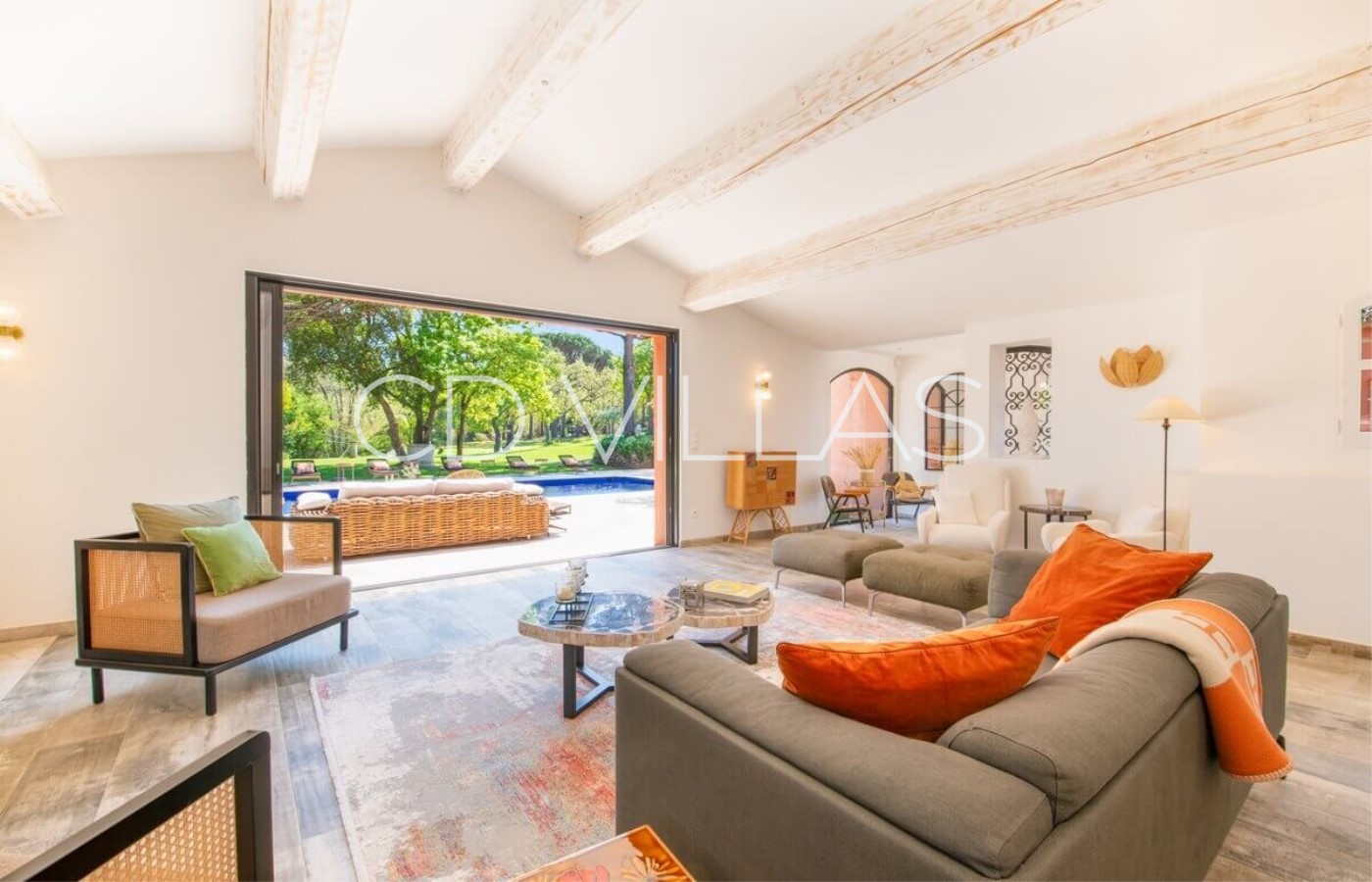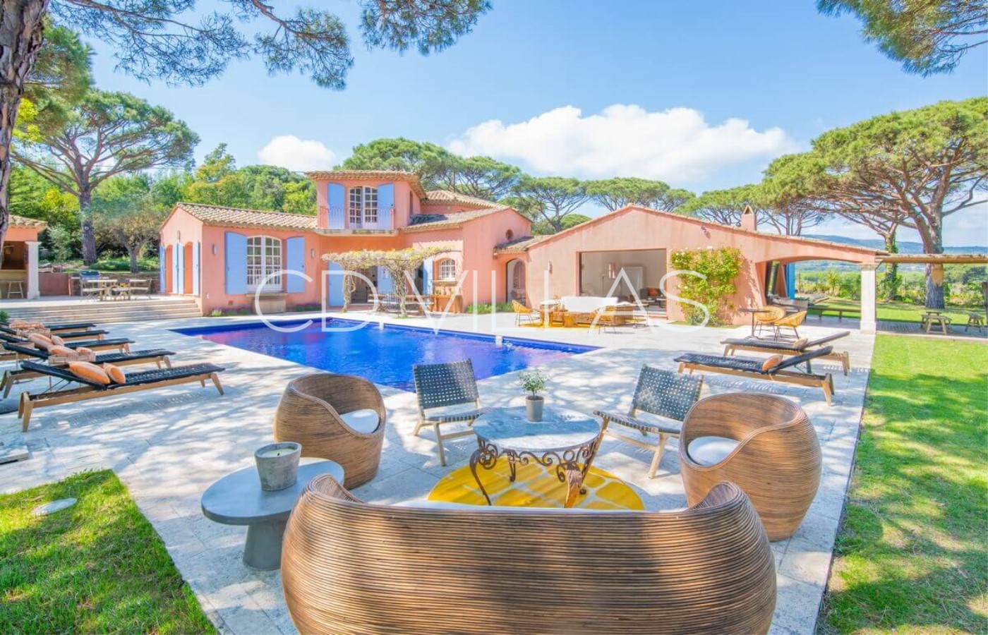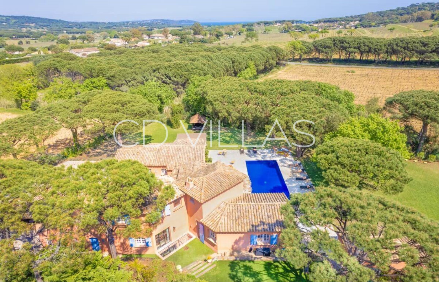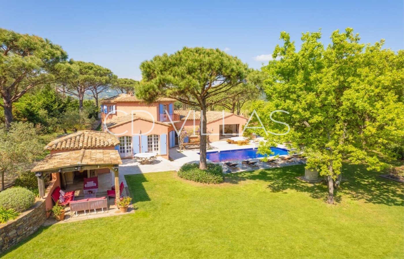 La villa se trouve dans un jardin fabuleux de 6000 m² de pelouses avec un terrain de pétanque, une cuisine d'été couverte avec table et canapés. Il y a une piscine de 11 mètres qui peut être chauffée, entourée d'une grande terrasse ensoleillée avec parasols, transats et tables ainsi qu'un barbecue familial. C'est un paradis pour les enfants car dans le jardin se trouvent une cabane en bois et des balançoires. Pendant ce temps, les parents peuvent trouver un refuge paisible dans le salon balinais en teck d'où vous pourrez admirer le coucher de soleil sur le pittoresque village perché de Ramatuelle.