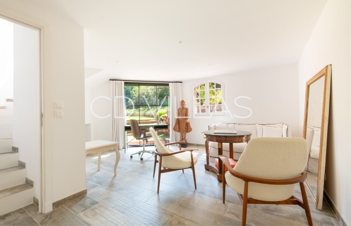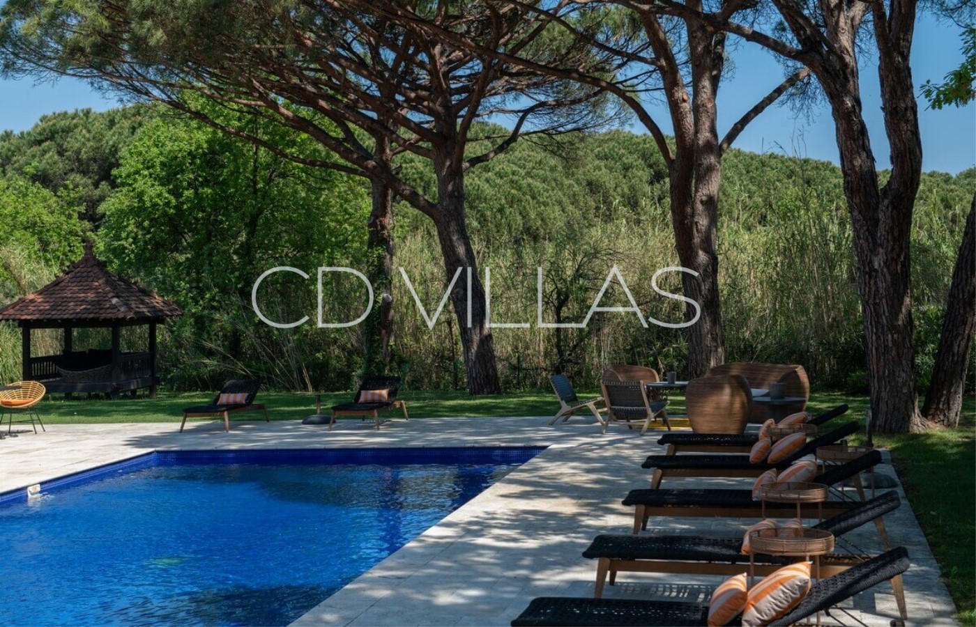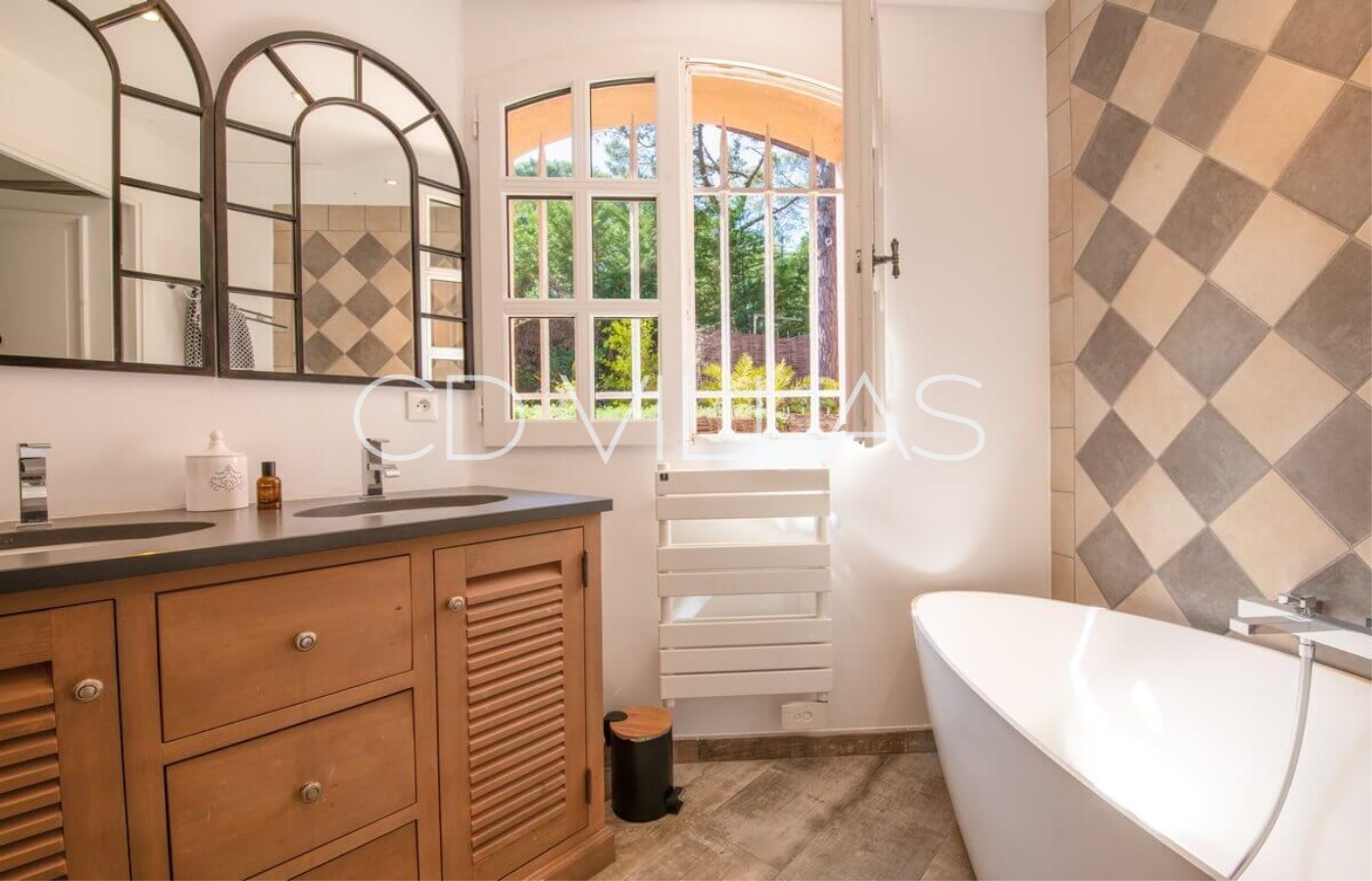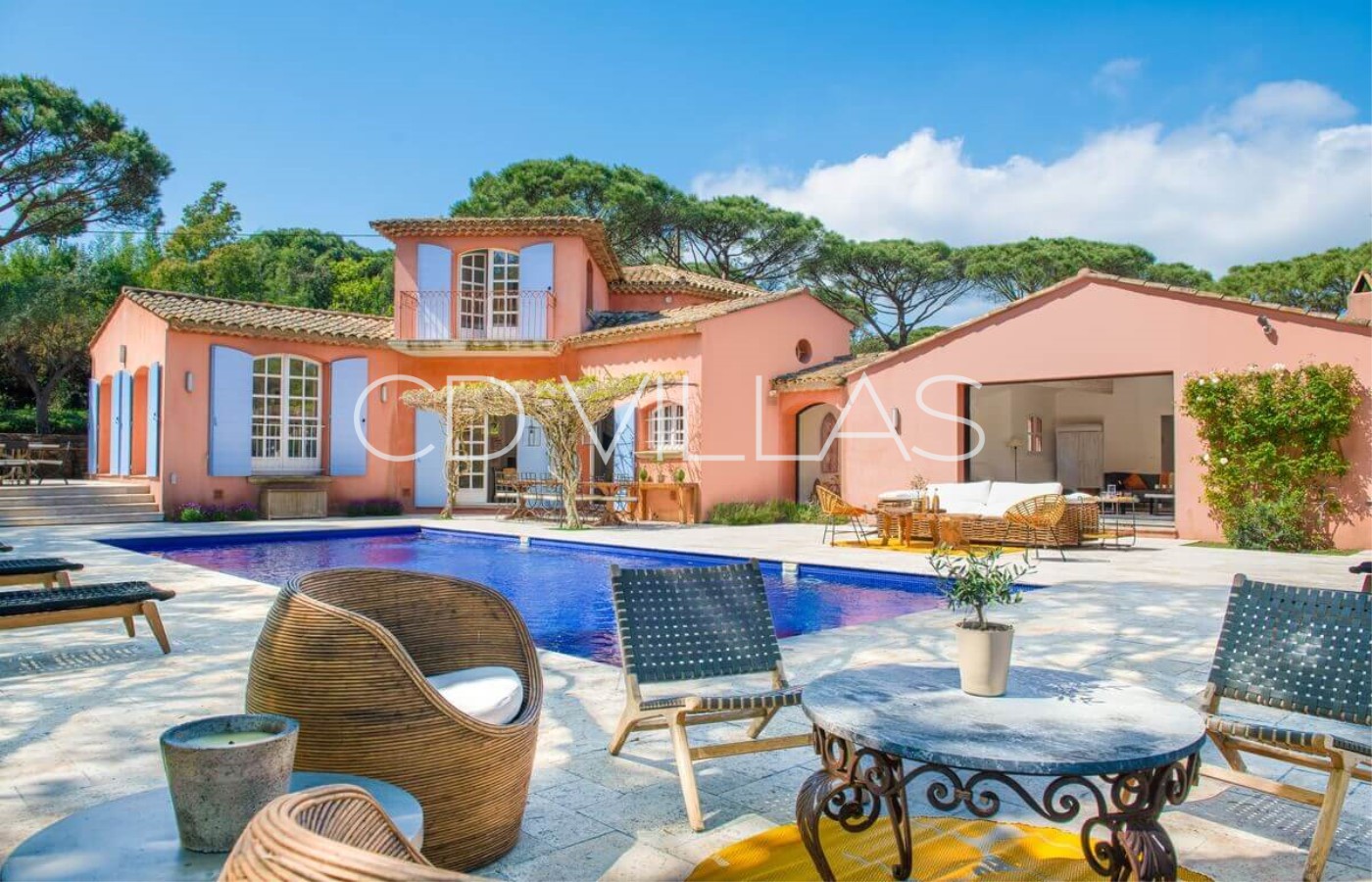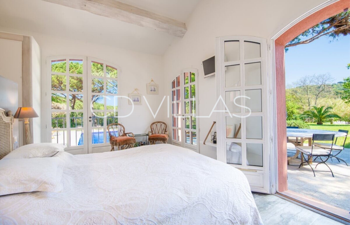 La villa se trouve dans un jardin fabuleux de 6000 m² de pelouses avec un terrain de pétanque, une cuisine d'été couverte avec table et canapés. Il y a une piscine de 11 mètres qui peut être chauffée, entourée d'une grande terrasse ensoleillée avec parasols, transats et tables ainsi qu'un barbecue familial. C'est un paradis pour les enfants car dans le jardin se trouvent une cabane en bois et des balançoires. Pendant ce temps, les parents peuvent trouver un refuge paisible dans le salon balinais en teck d'où vous pourrez admirer le coucher de soleil sur le pittoresque village perché de Ramatuelle.