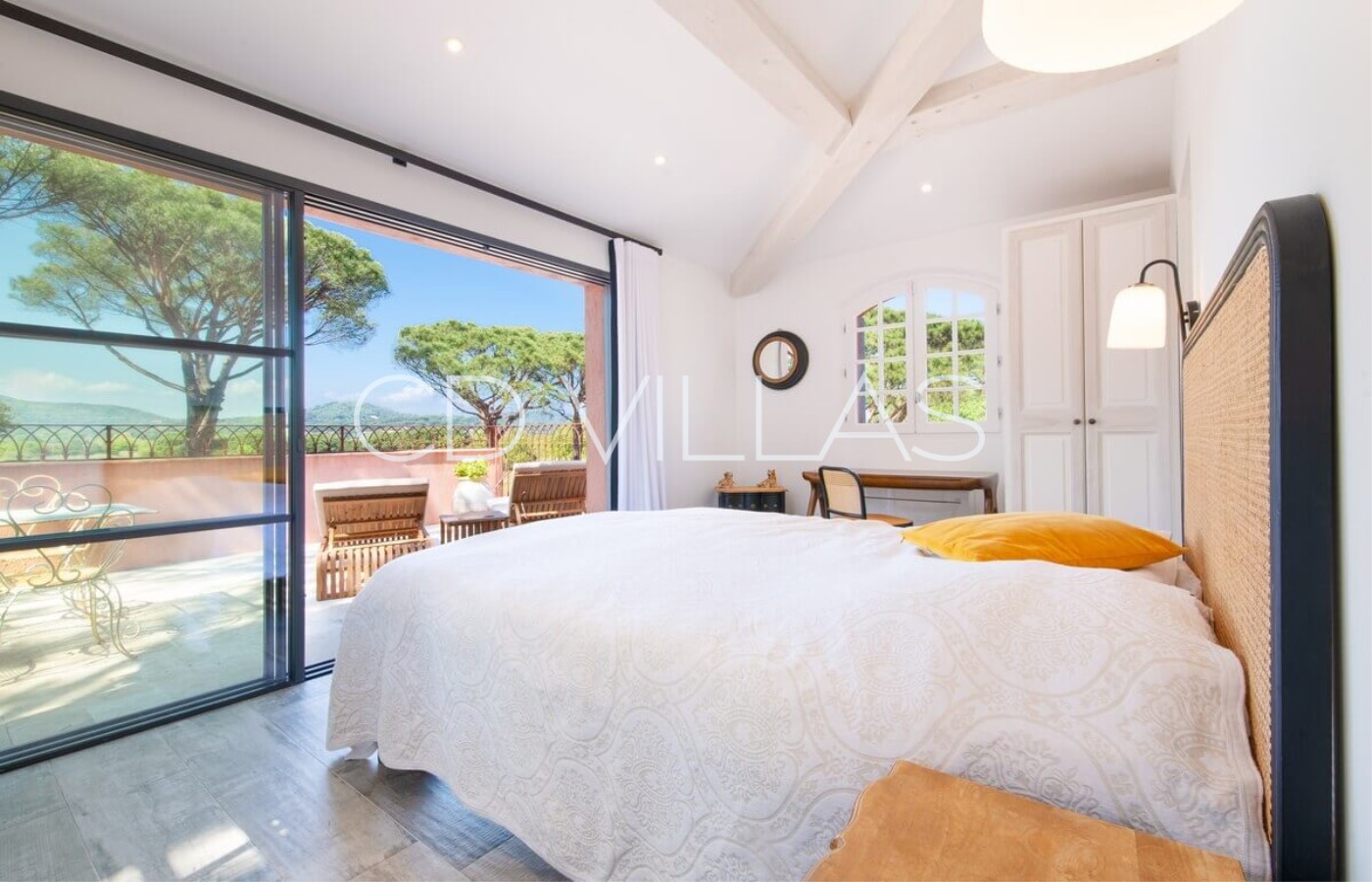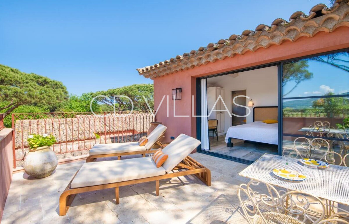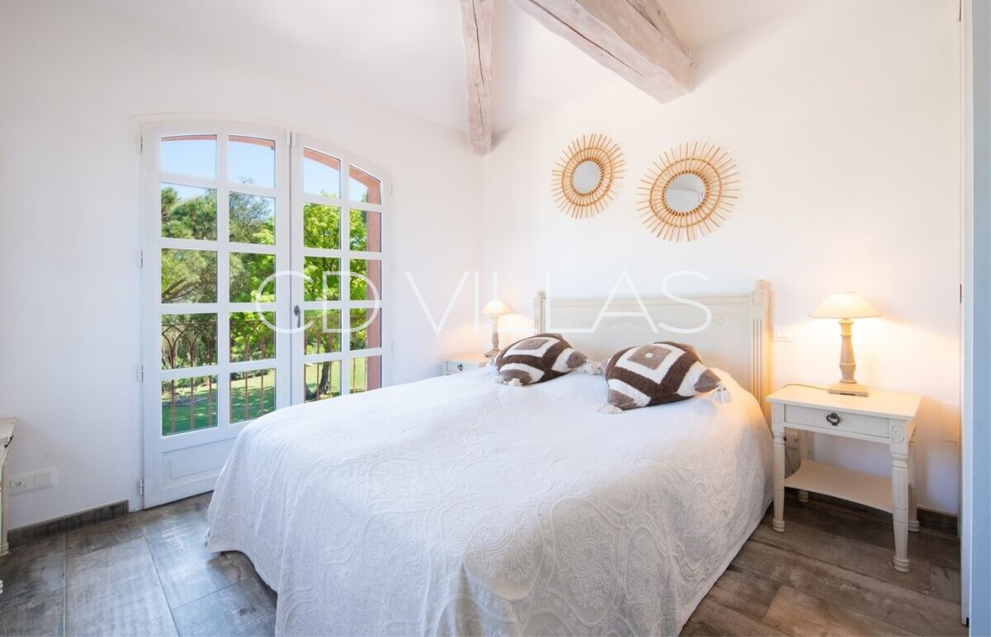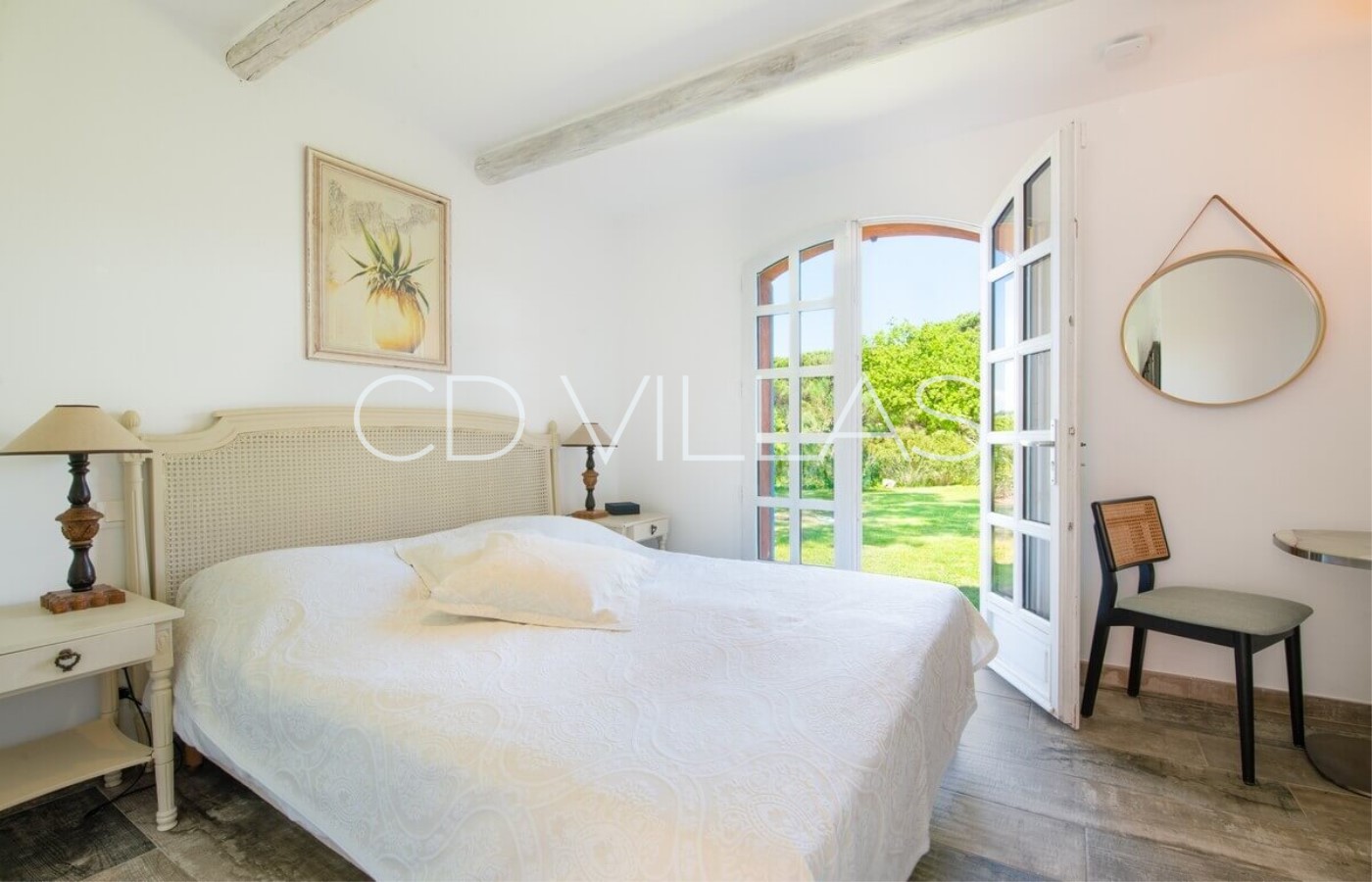Relaxez-vous dans cette belle maison familiale nichée au milieu des vignes à proximité du village de Ramatuelle, à seulement 2 km de la plage de Pampelonne. La propriété dispose de 6 chambres récemment rénovées, toutes climatisées et chacune avec sa nouvelle salle de bains ou salle de douche privative. Cinq des chambres sont situées au rez-de-chaussée et une est située dans la tour à l'étage. Il y a quatre chambres avec un lit double pouvant être aménagé en lits jumeaux, une chambre simple et une chambre avec lits superposés pouvant accueillir 2 enfants. La propriété a été entièrement rénovée en 2015 et décorée dans un style charmant en teck et en bois brossé blanc.