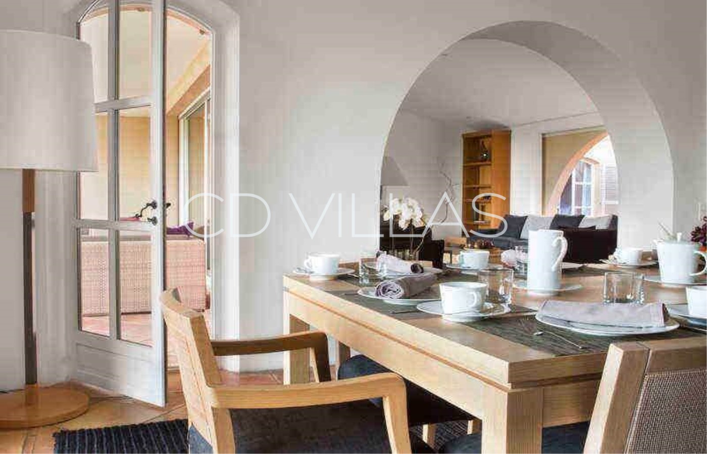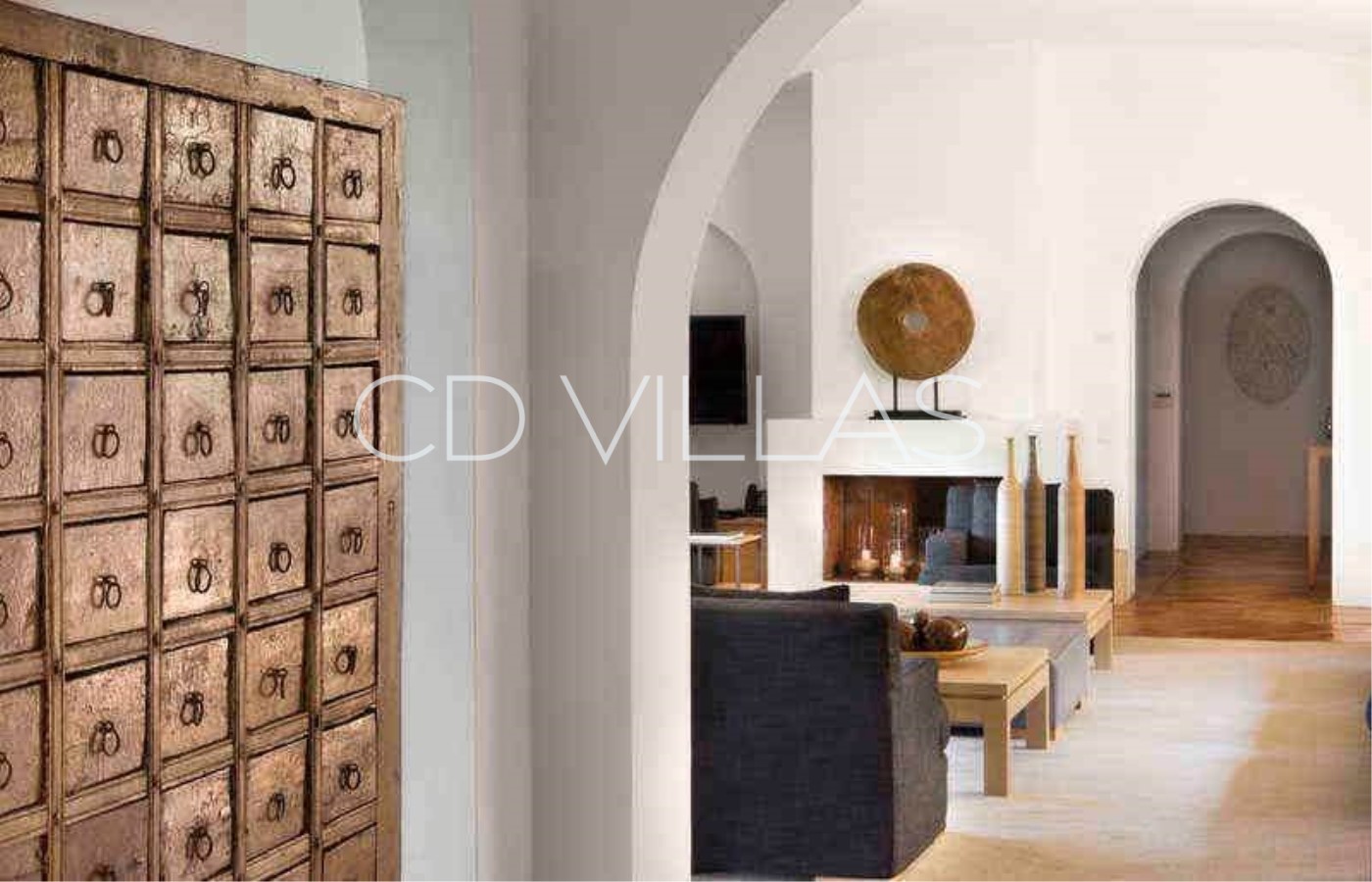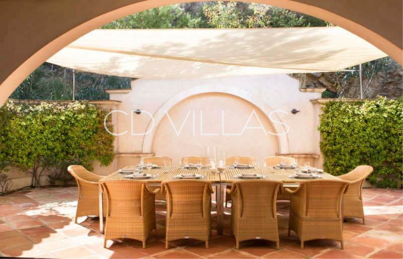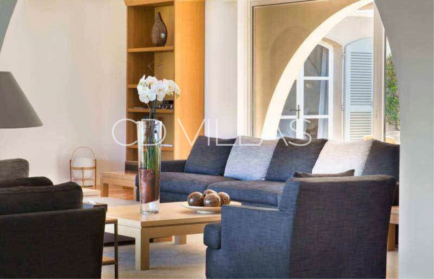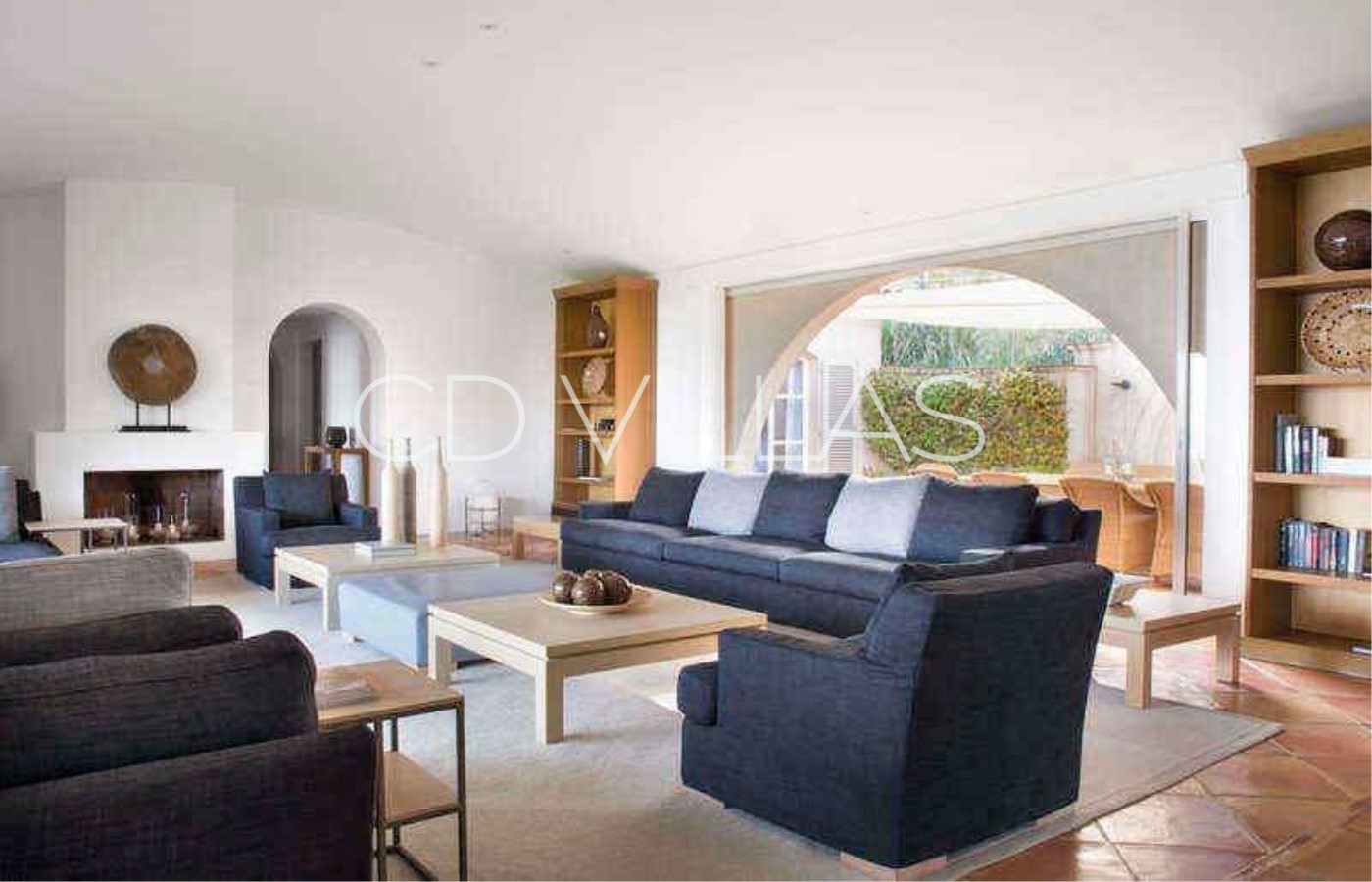 On entre dans la maison par quelques marches qui amène à un couloir. La maison s'articule autour du salon central, avec un patio ombragé et une salle à manger extérieure d'un côté et une terrasse couverte avec des chaises longues confortables donnant sur la piscine et la mer.