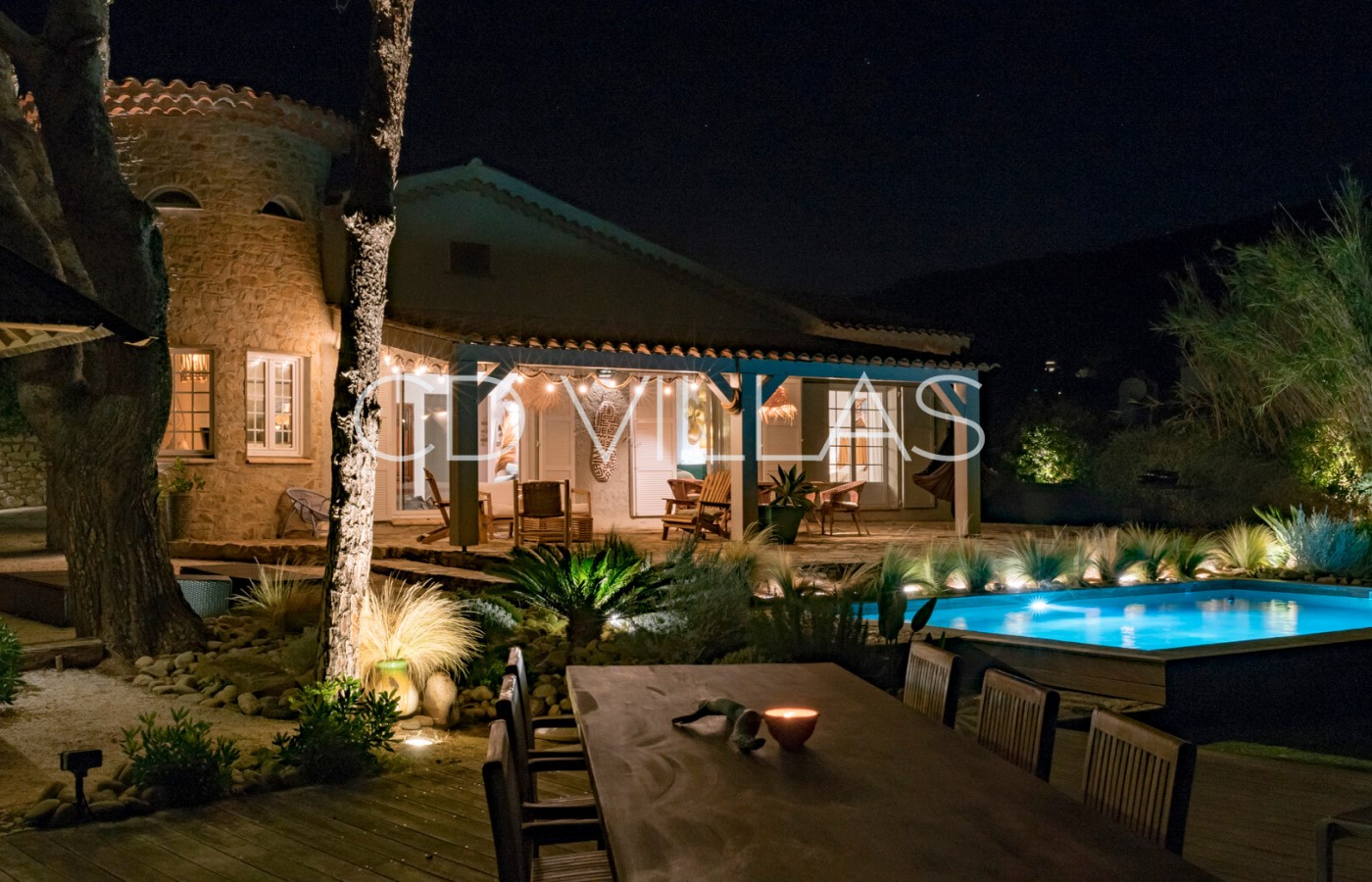 Les extérieurs permettent de profiter pleinement du paysage et de la vue avec un grand jardin, deux terrasses, des chaises longues pour profiter du soleil méditerranéen.