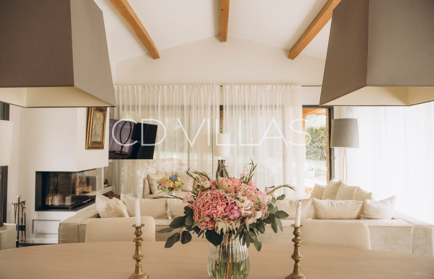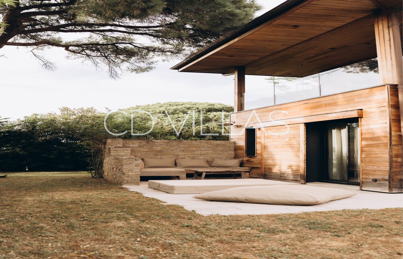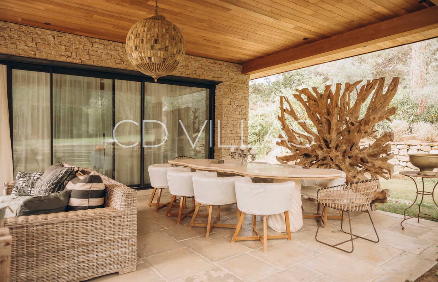 L'extérieur est conçu pour offrir des espaces de détente avec des chaises longues autour de la piscine chauffée, des salons d'été, une pelouse plate sur deux niveaux et un terrain de pétanque.
