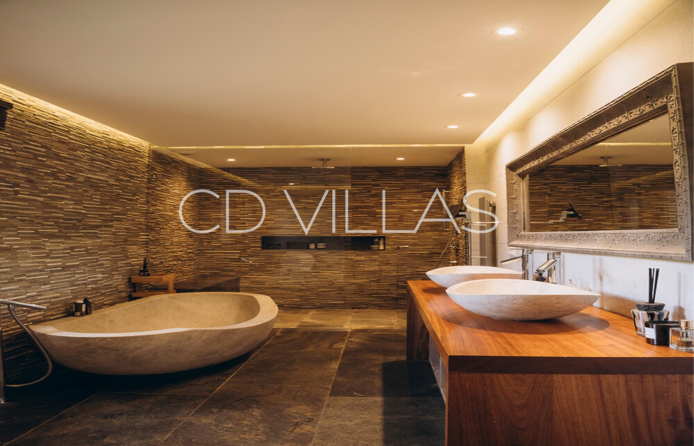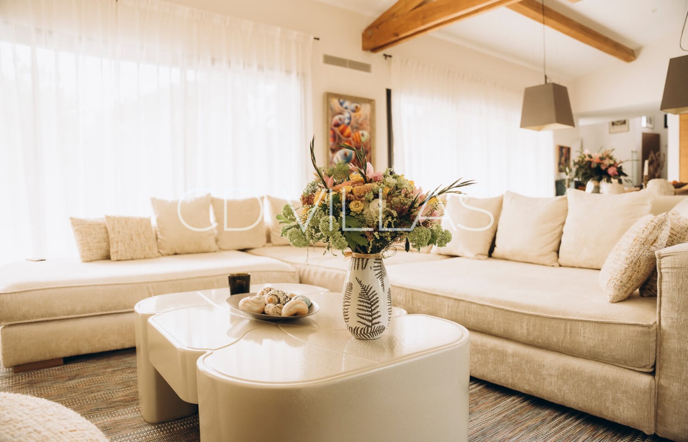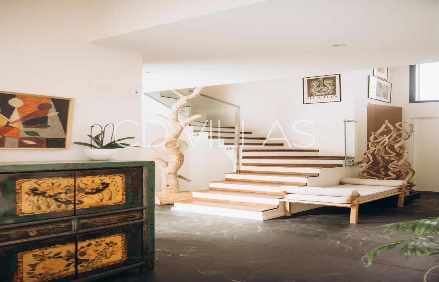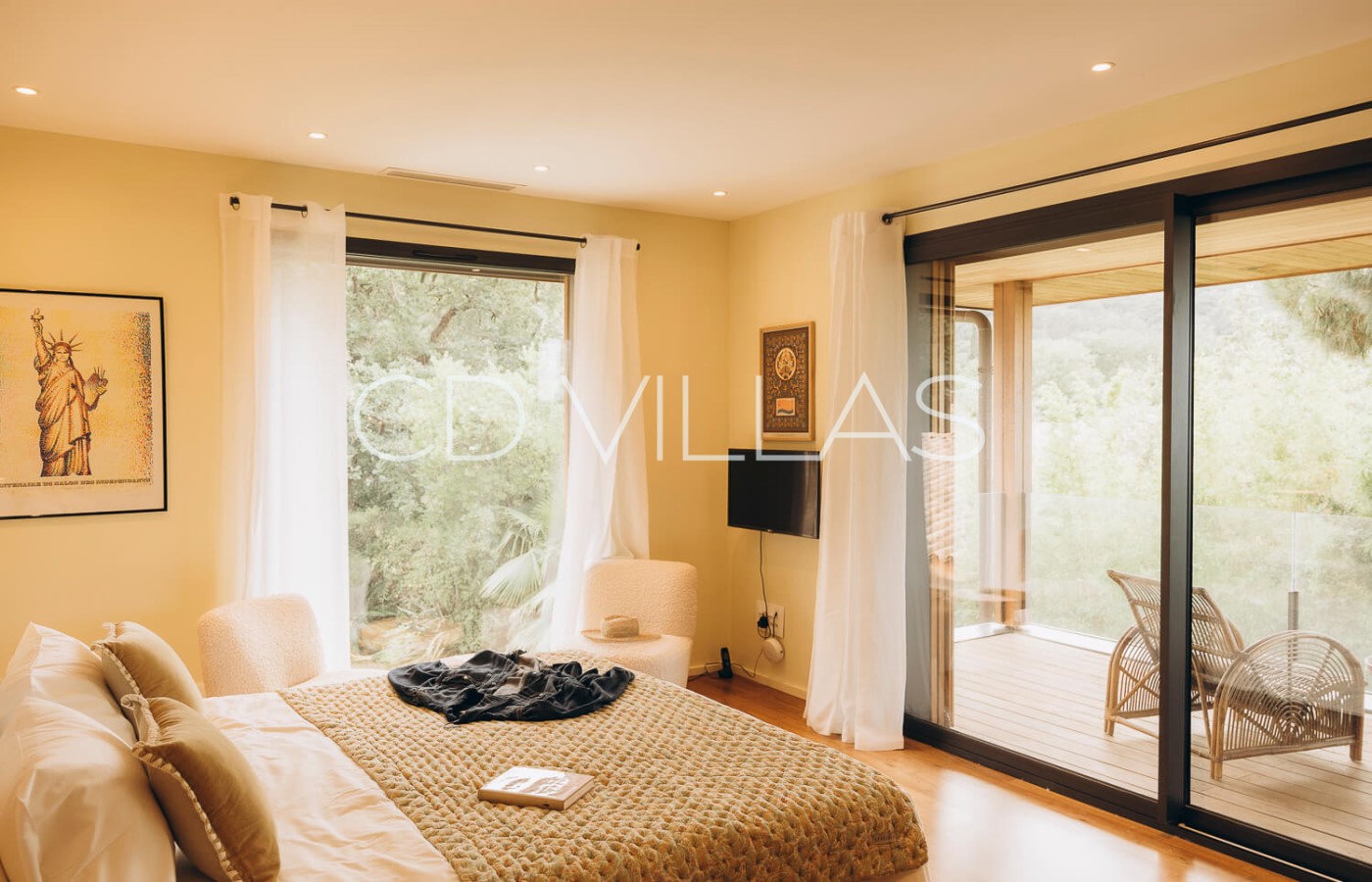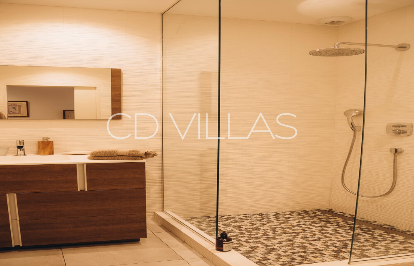 Un couloir amène à la grande salle commune avec cuisine, coin repas et salon. Les grandes baies vitrées offrent une superbe vue sur le jardin et la piscine-couloir, et donnent une impression dedans-dehors. Le salon ouvre sur la terrasse ombragée où se trouve la salle à manger extérieure. À gauche du couloir, il y a une chambre double avec salle de douche et placards intégrés. Sur la droite, vous trouverez la chambre principale avec vue sur la piscine et le jardin, une salle de bain en-suite avec baignoire, cabine de douche, WC et double vasque, ainsi qu'un dressing.
