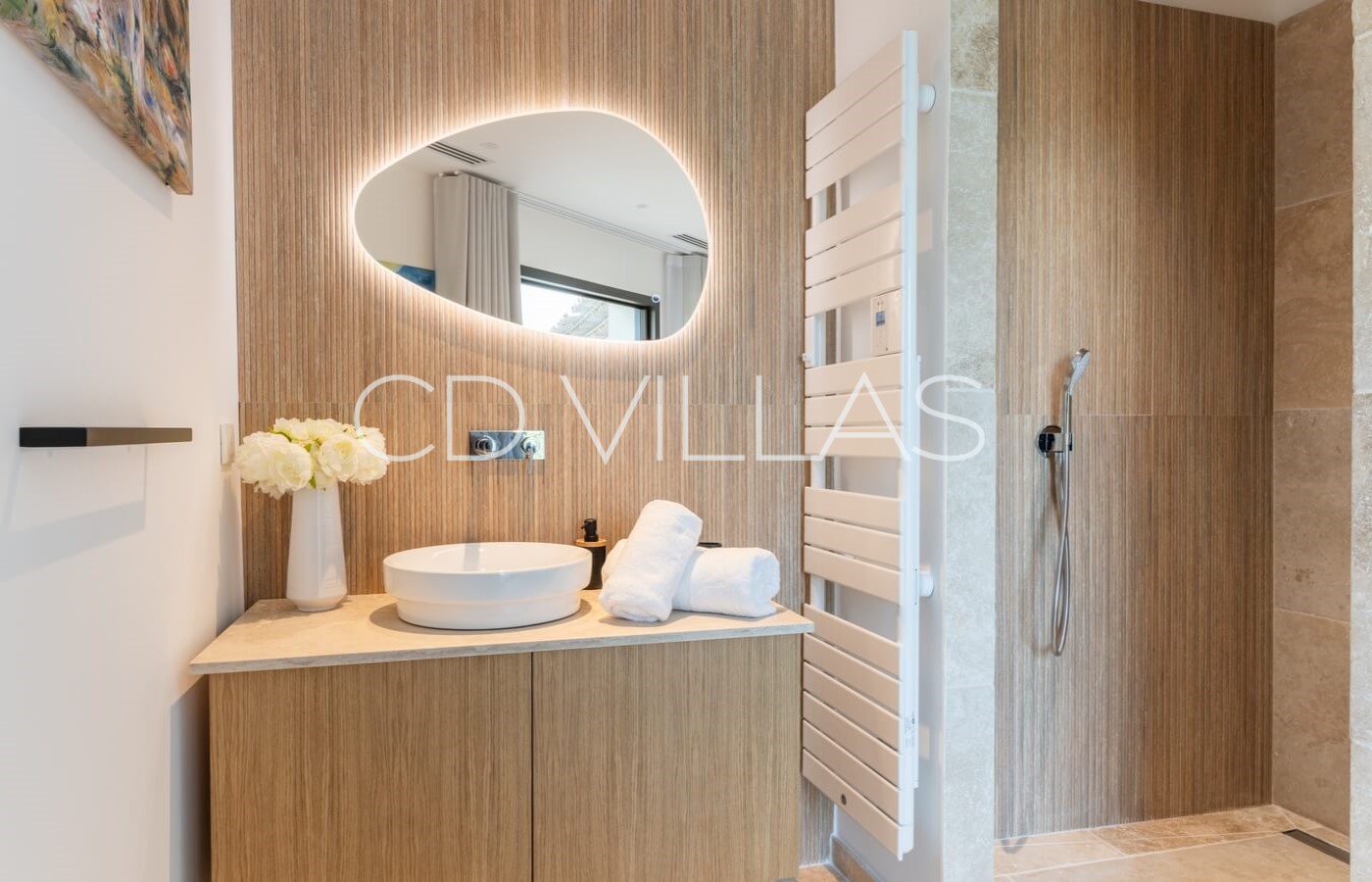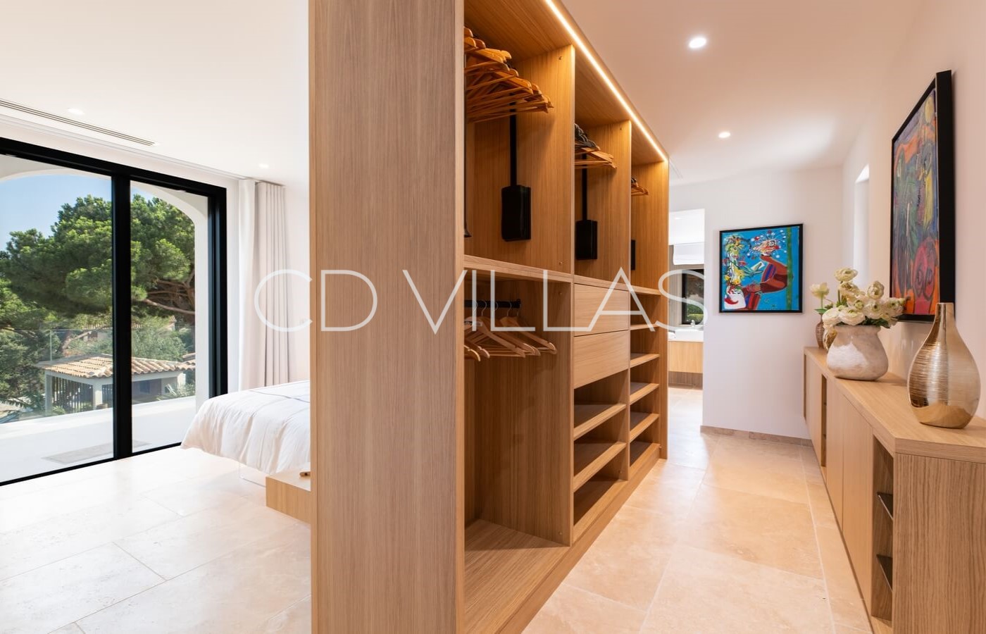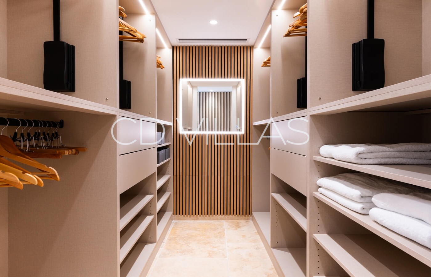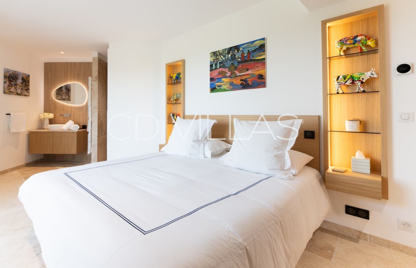 La villa propose 5 chambres luxueuses, chacune dotée de son propre dressing et sa salle de bain. La chambre principale dispose d'une terrasse privée offrant un espace de détente exclusif.