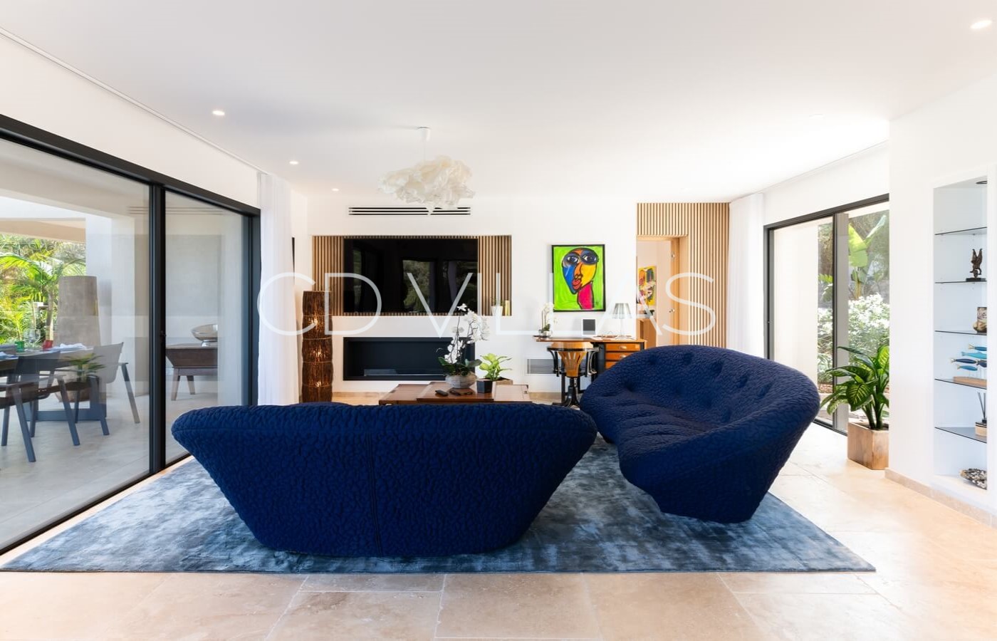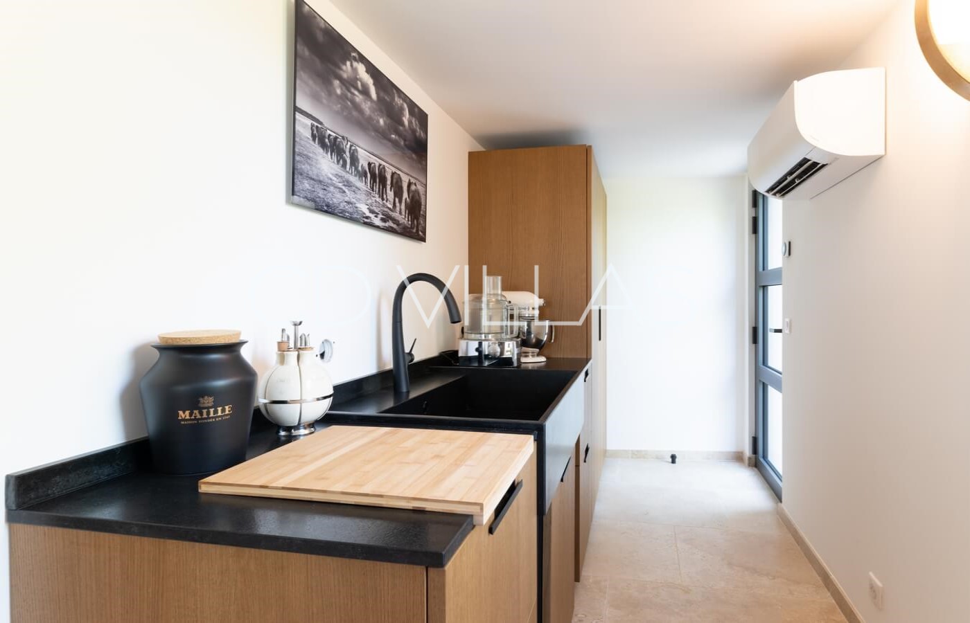 La villa dispose d'un double séjour lumineux avec cheminée, d'une élégante salle à manger pouvant accueillir jusqu'à 10 convives et d'une grande cuisine entièrement équipée avec un îlot central.