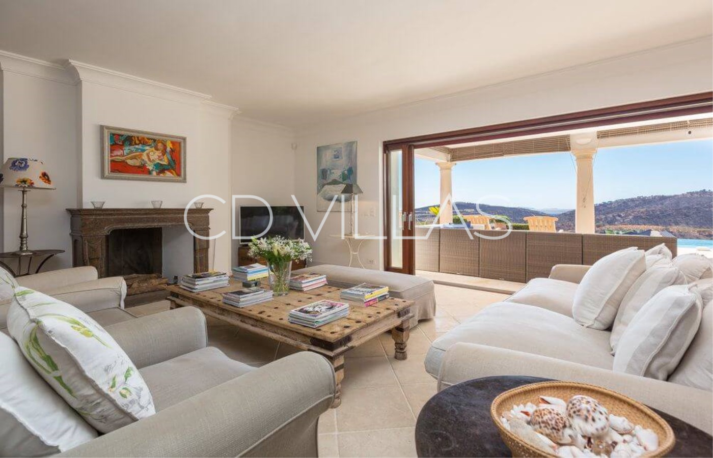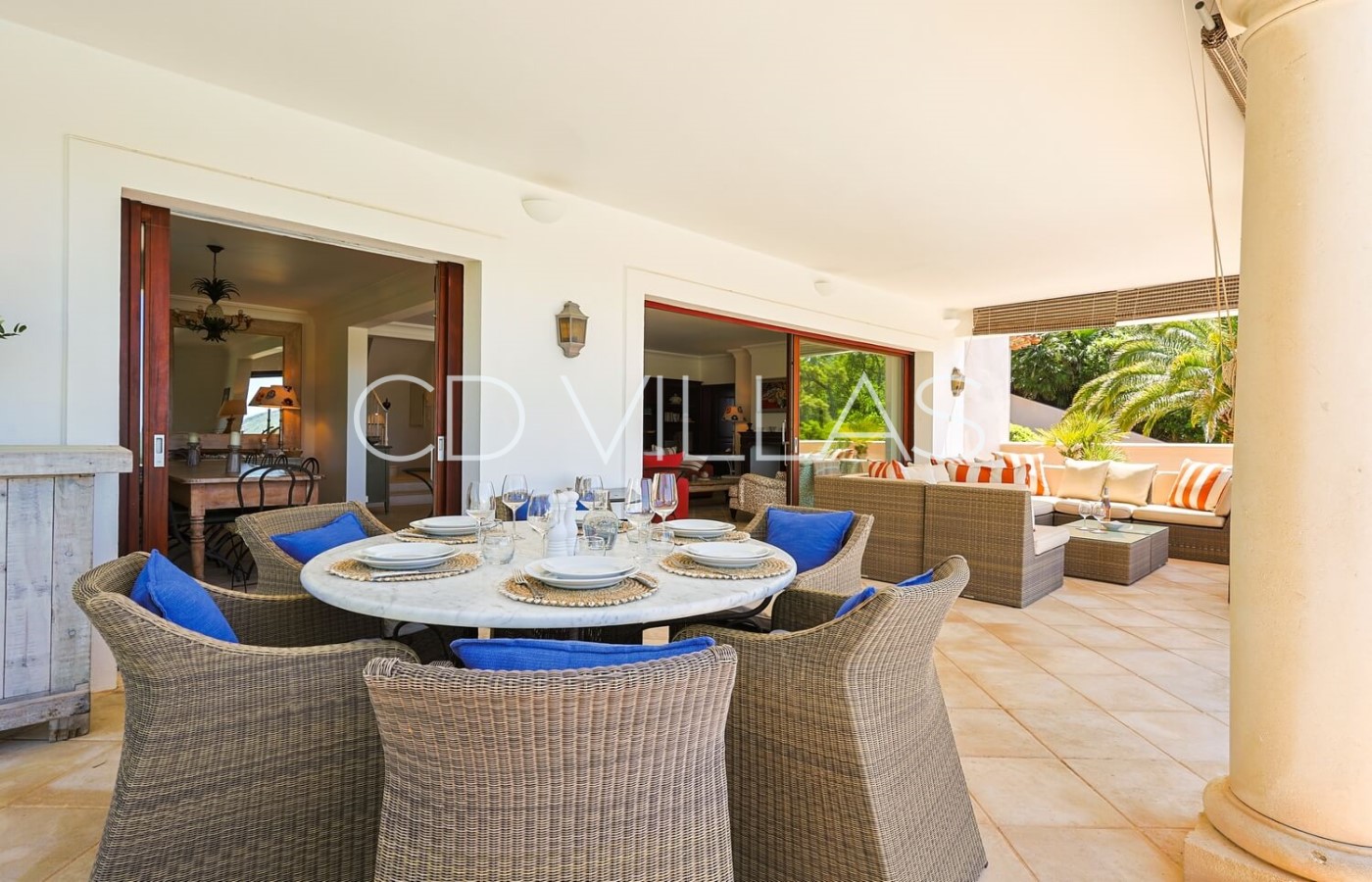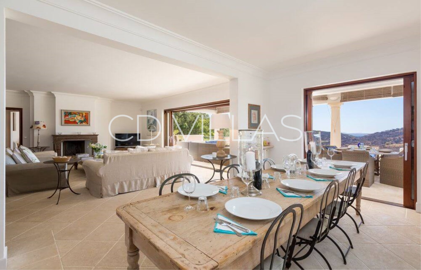 Salon - ouvert sur la salle à manger, avec canapés confortables, Sky TV et accès direct à la terrasse et à la piscine