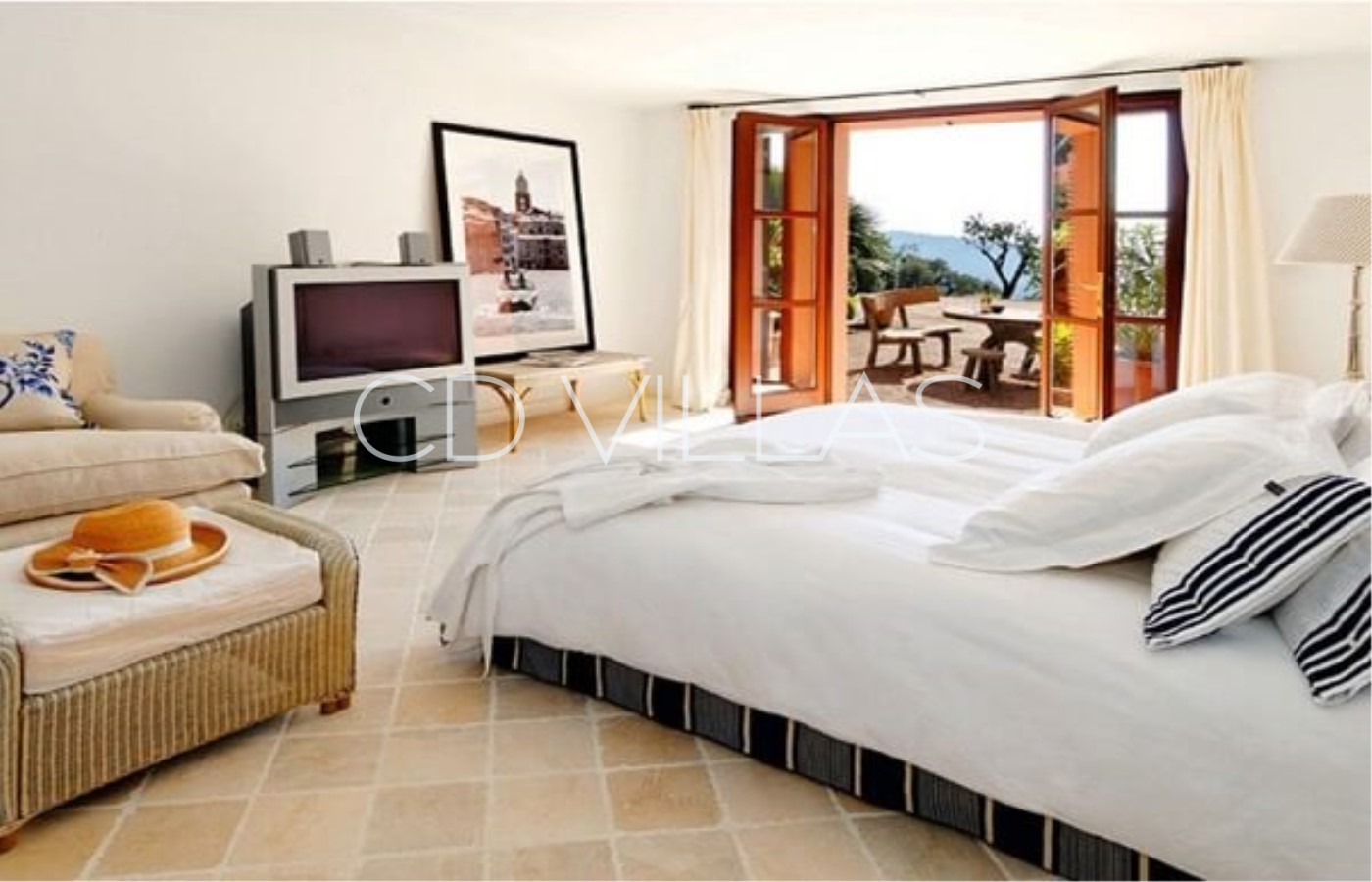 Chambre 1 - Suite principale avec lit double, patio avec vue panoramique, salle de bains, dressing et TV plasma.