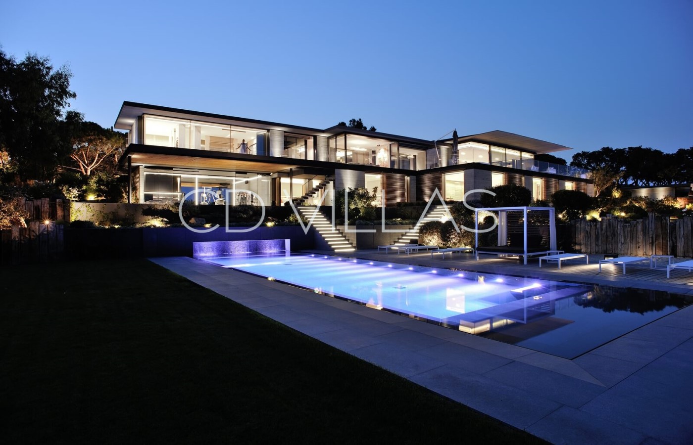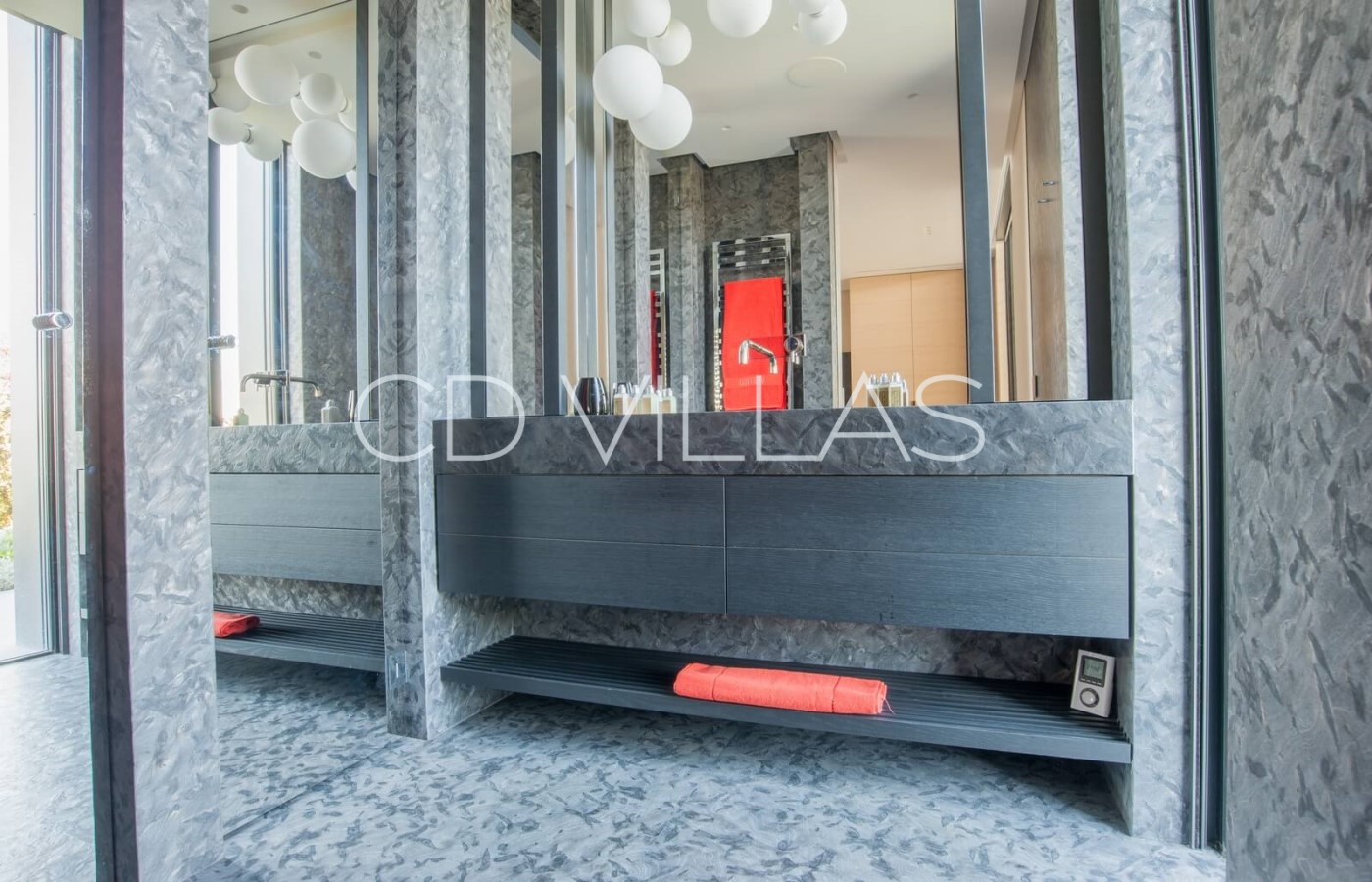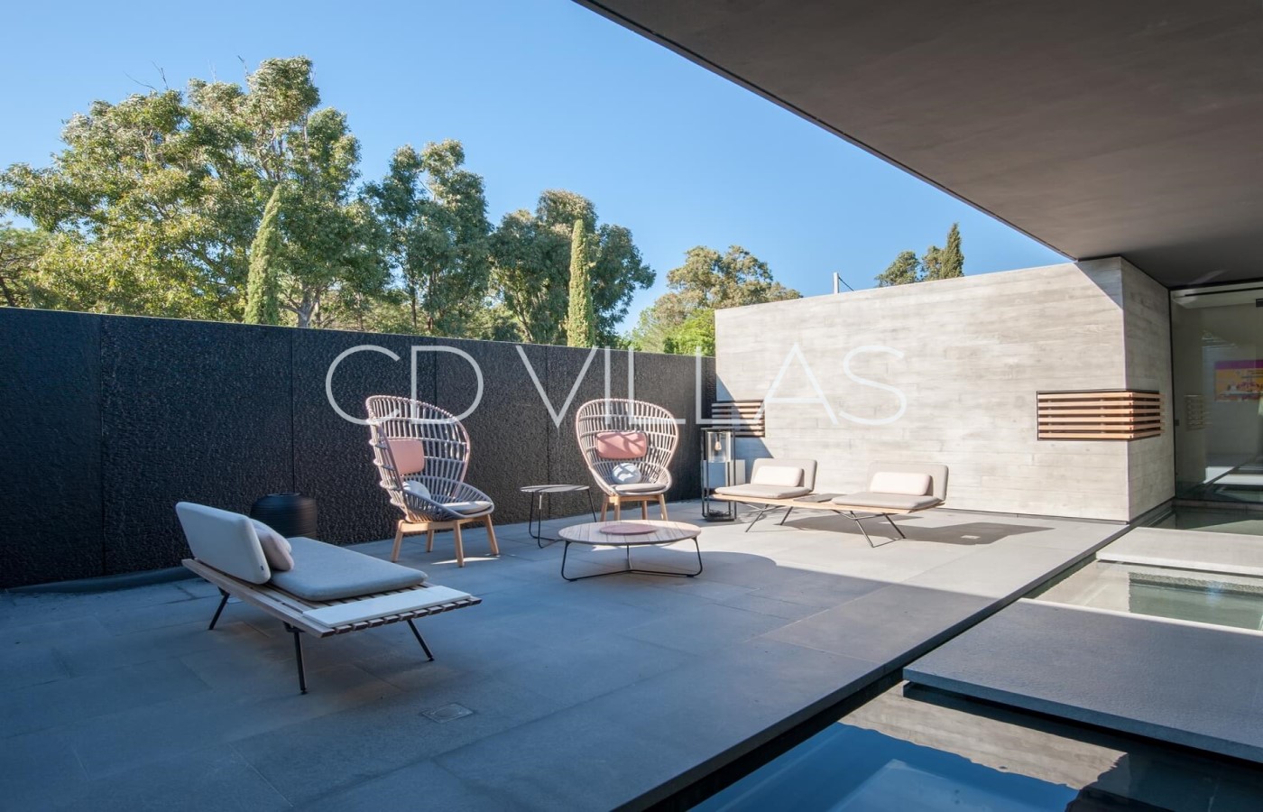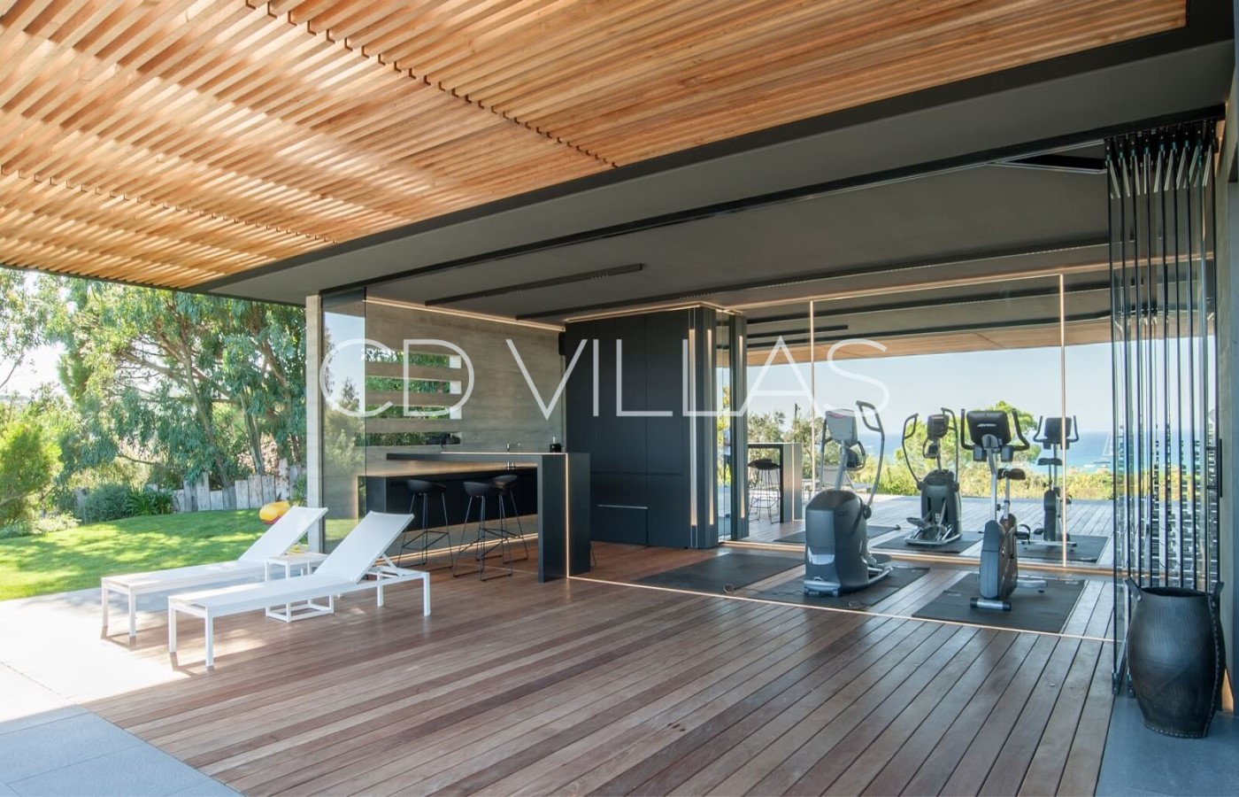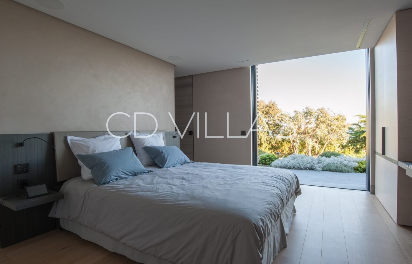 Le niveau jardin abrite 5 chambres d'invités avec salles de bains attenantes, un coin bureau, des armoires intégrées, une télévision et la climatisation, un grand hammam avec douche et vestiaire, une salle de jeux avec grand écran TV et deux chambres pour le personnel partageant une salle de bains. Il y a plusieurs éléments d'eau dans le patio, le jardin et la piscine, et les invités peuvent profiter de moments à l'ombre, prendre un verre tout en admirant la vue, sur une grande terrasse avec un brasero.