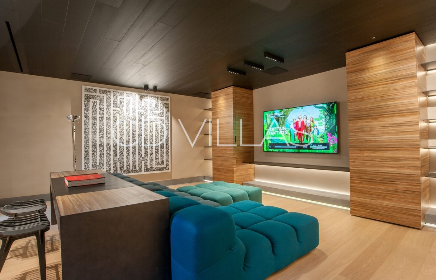 TV Den - Une pièce spécialement conçue pour regarder des films avec une expérience cinématographique à la maison, équipée d'un grand écran, d'un son surround et de sièges confortables.