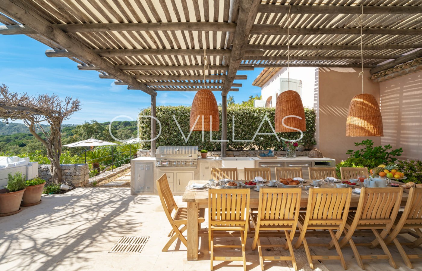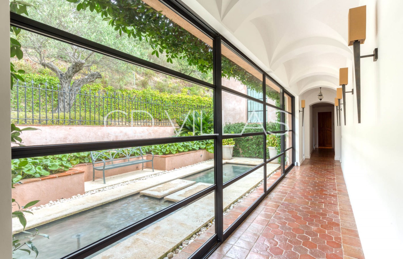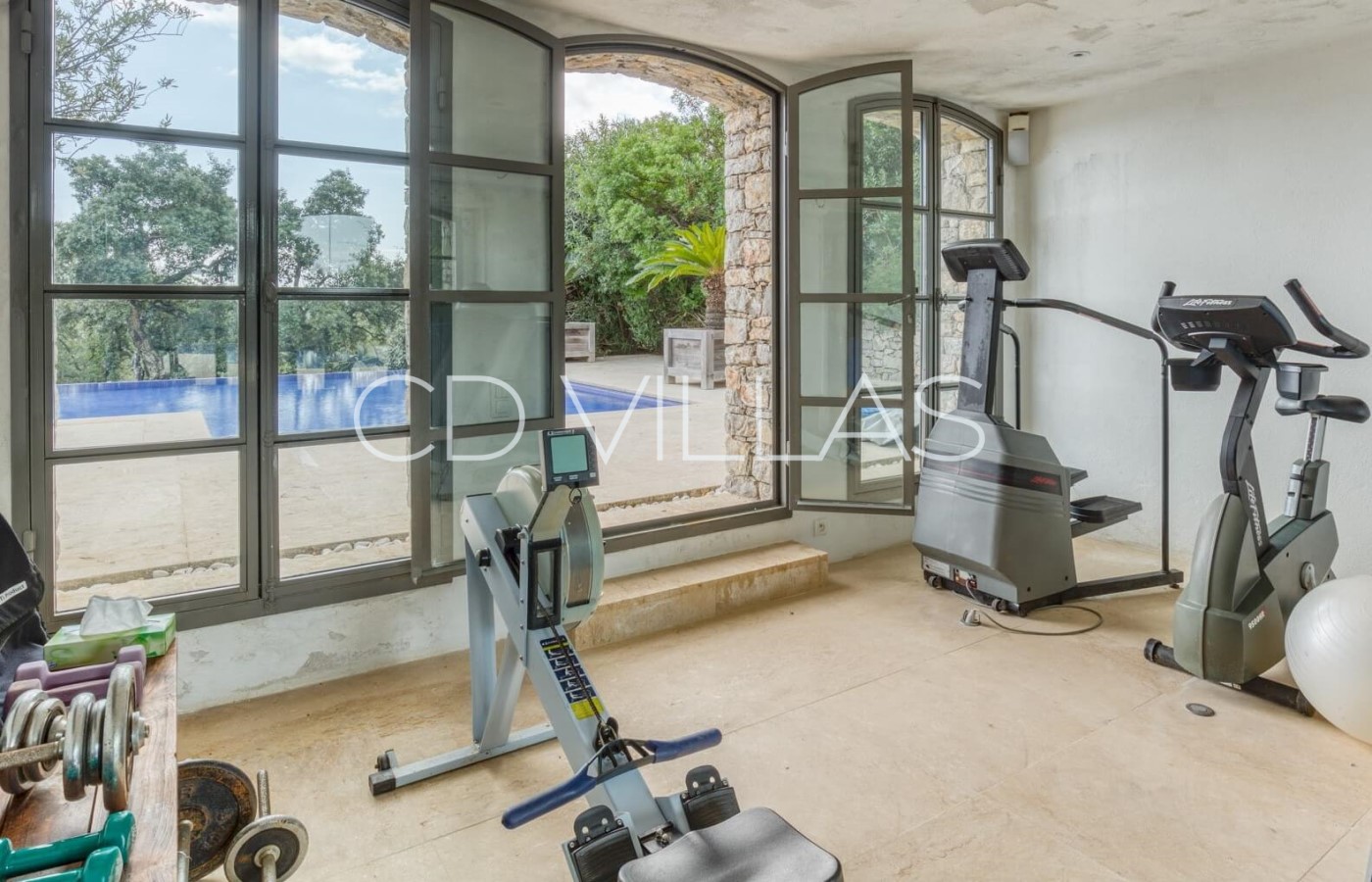 Les extérieurs offrent de nombreuses possibilités pour profiter de différents moments de la journée: se relaxer, lire, faire une sieste, profiter de la vue ou des rayons du soleil. Il y a deux pergolas couvertes de glycines, une grande fontaine d'agrément, un jardin de cactus, un deuxième salon d'été à côté de la piscine, un petit salon à l'ombre des roches derrière la piscine, une cuisine d'été avec un espace salon ainsi qu'une salle de sport avec du matériel de cardio-training. La piscine d'un bleu profond est entouré de transats et offre une magnifique vue sur la mer.