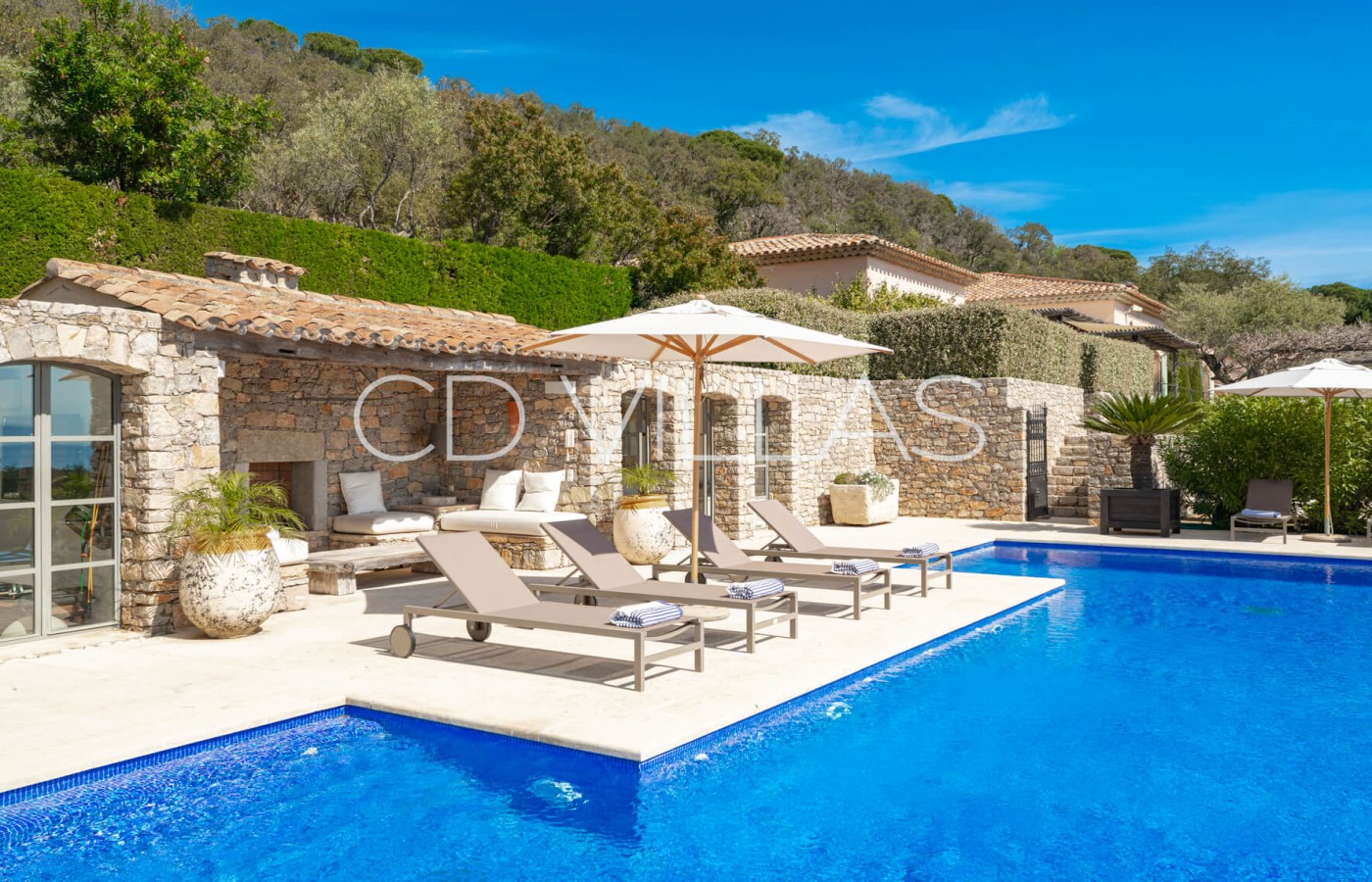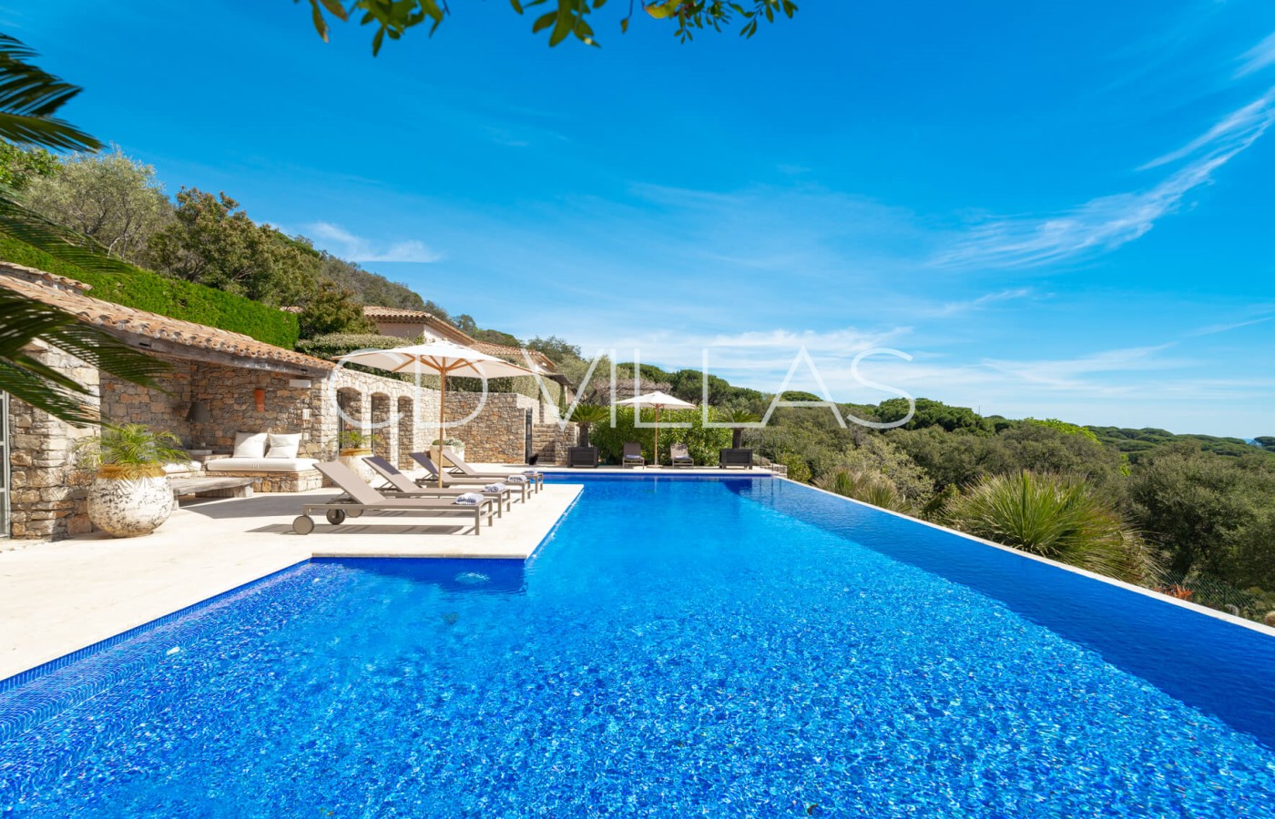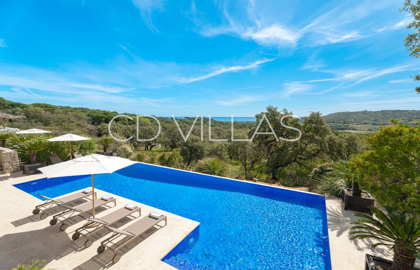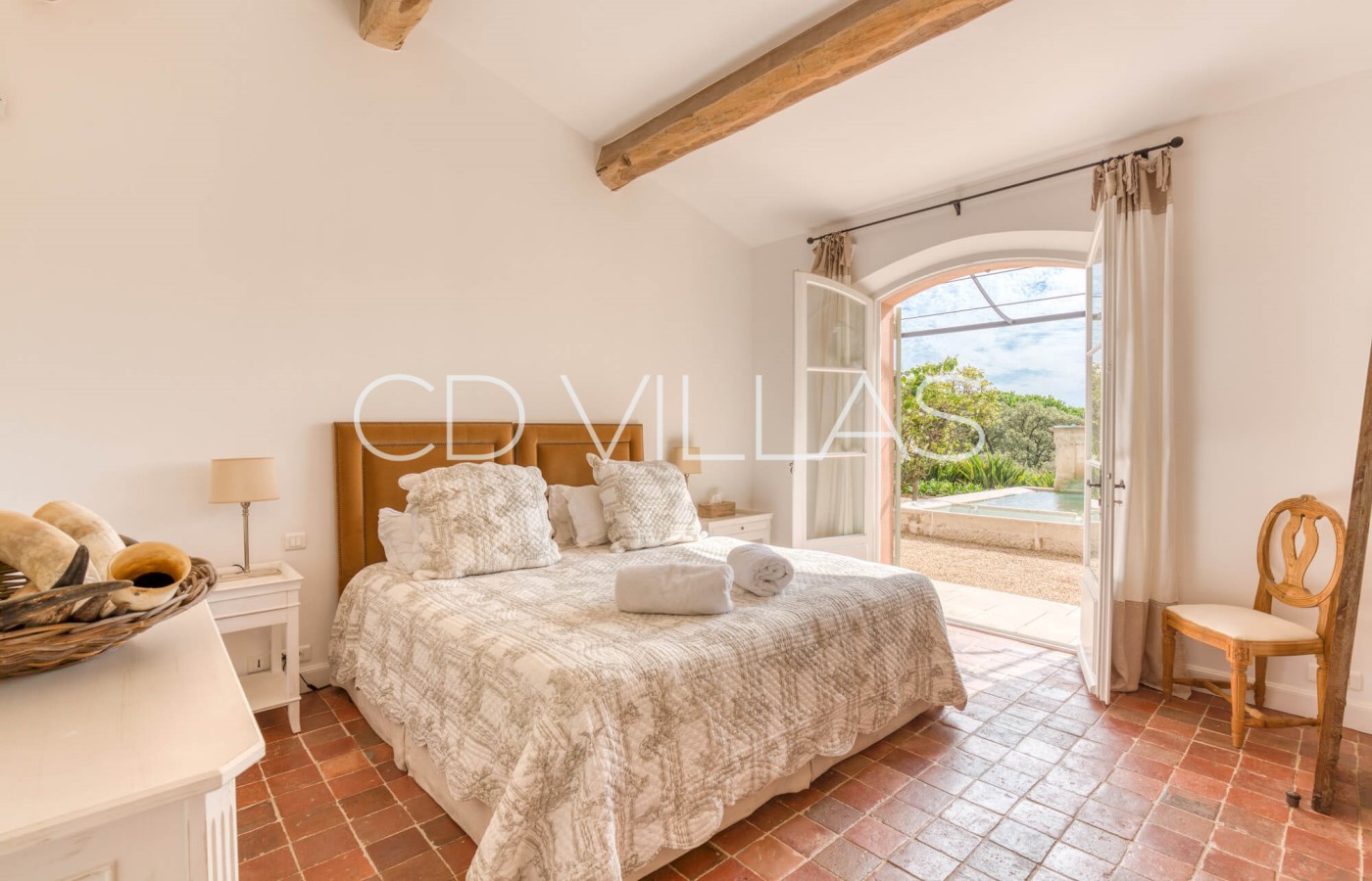 Villa provençale de luxe avec 6 chambres, située dans le Quartier des Marres, à Ramatuelle, avec 3 hectares de terrain, vue mer, une grande piscine et salle de sport. C'est le lieu idéal pour les vacanciers à la recherche d'un endroit reposant et au calme, tout en étant à 5mn en voiture de Saint Tropez et des plages de Pampelonne.