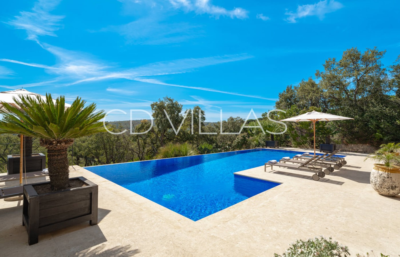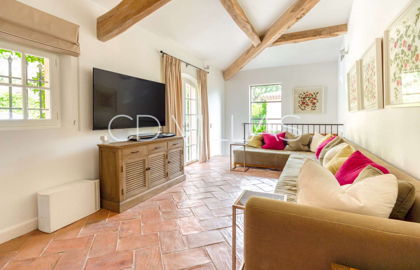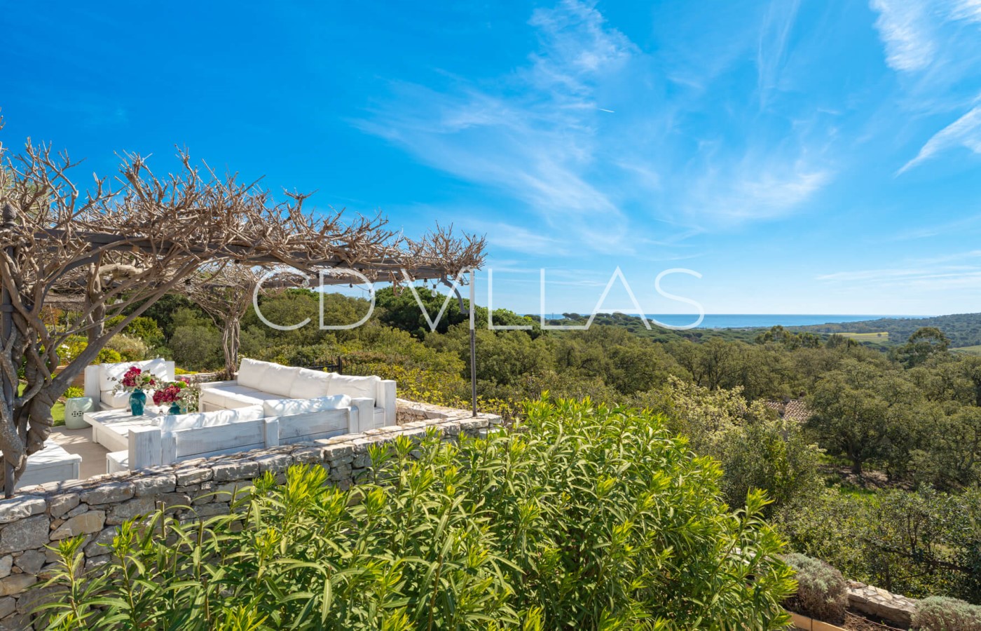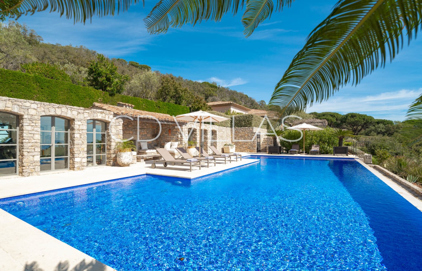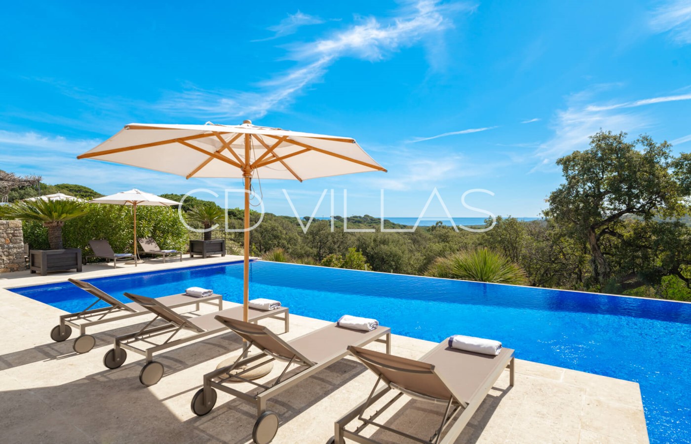Villa provençale de luxe avec 6 chambres, située dans le Quartier des Marres, à Ramatuelle, avec 3 hectares de terrain, vue mer, une grande piscine et salle de sport. C'est le lieu idéal pour les vacanciers à la recherche d'un endroit reposant et au calme, tout en étant à 5mn en voiture de Saint Tropez et des plages de Pampelonne.