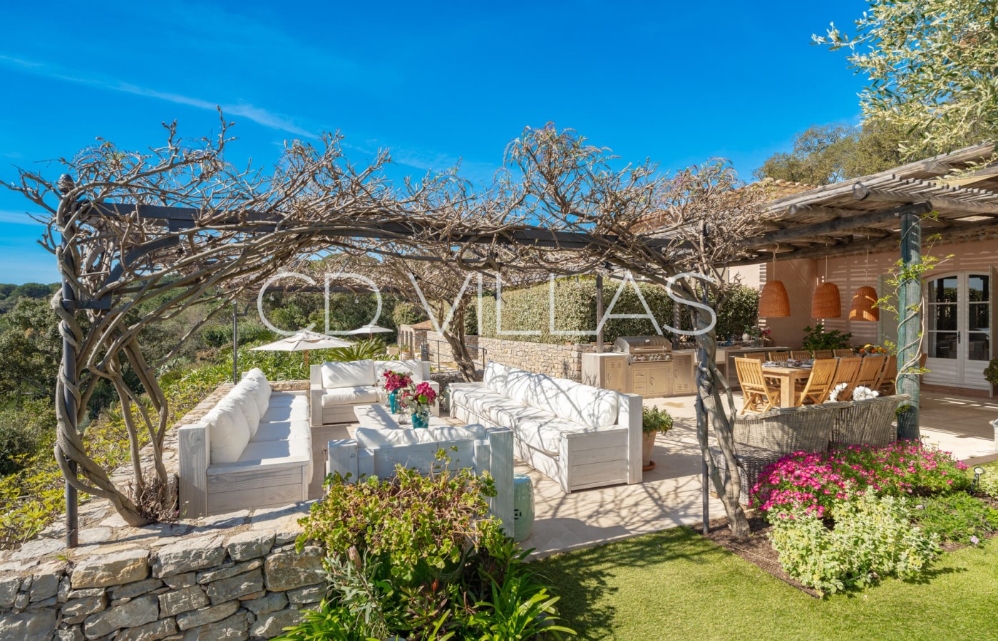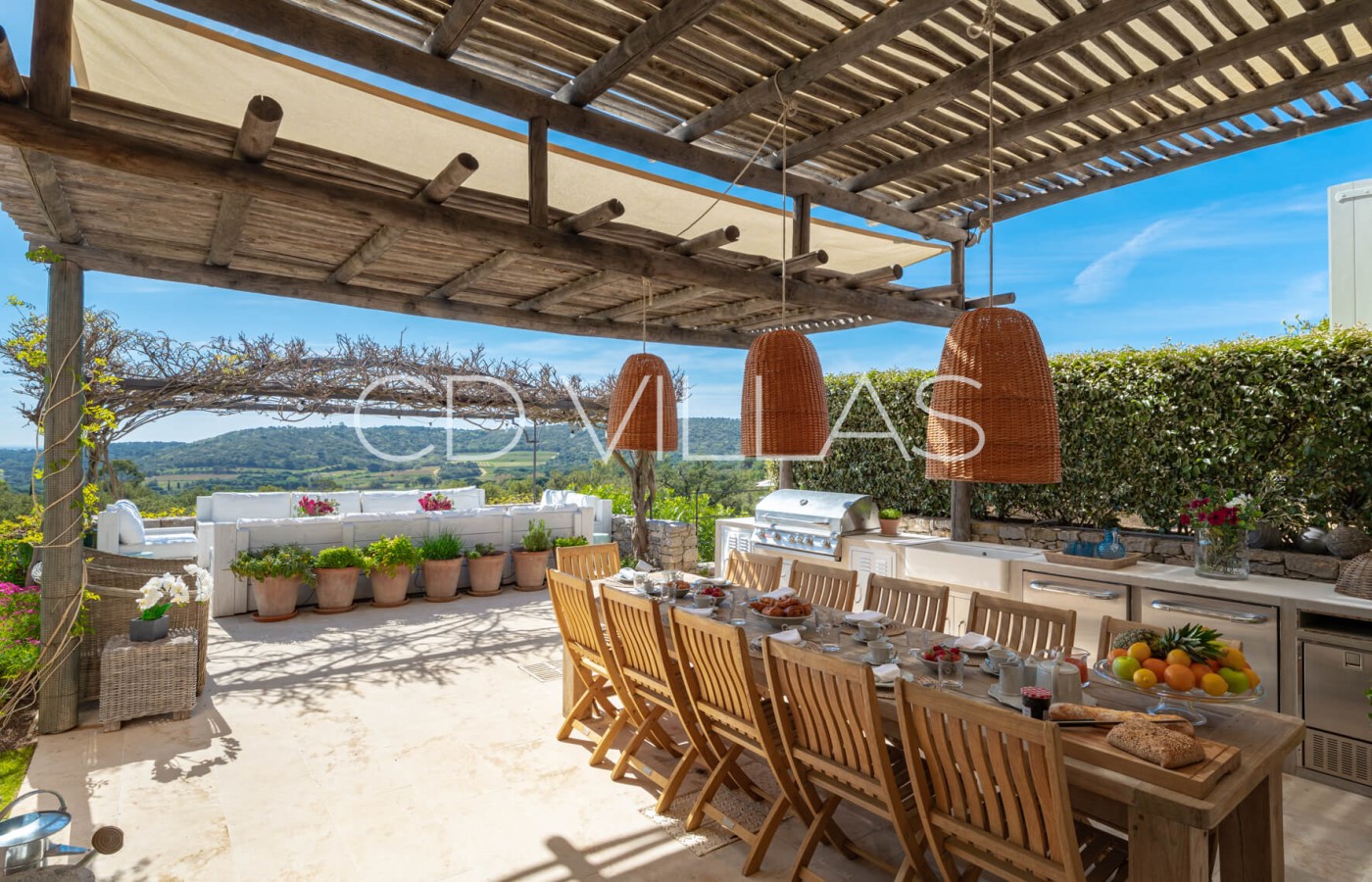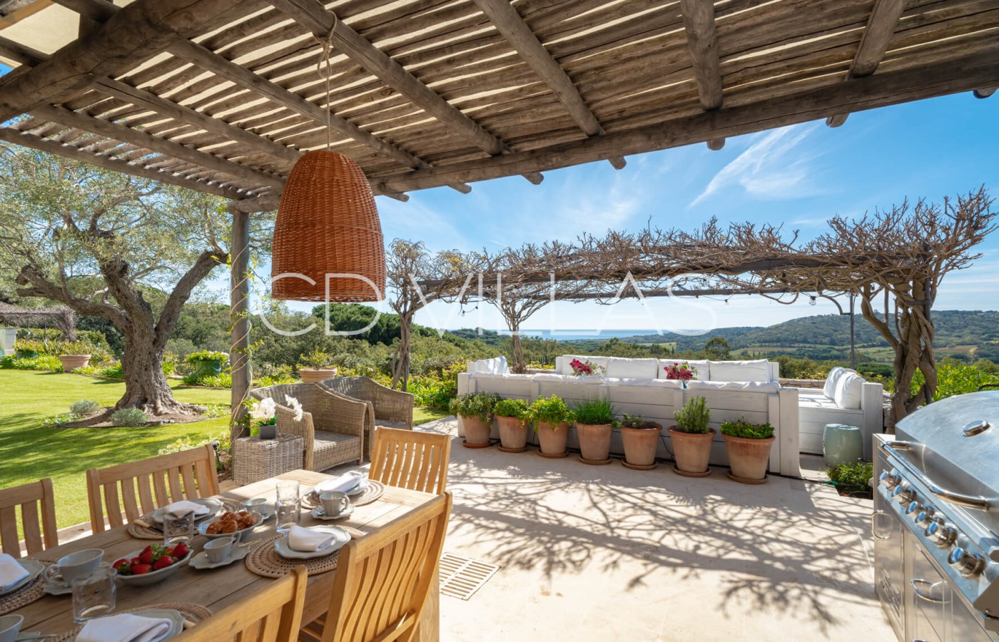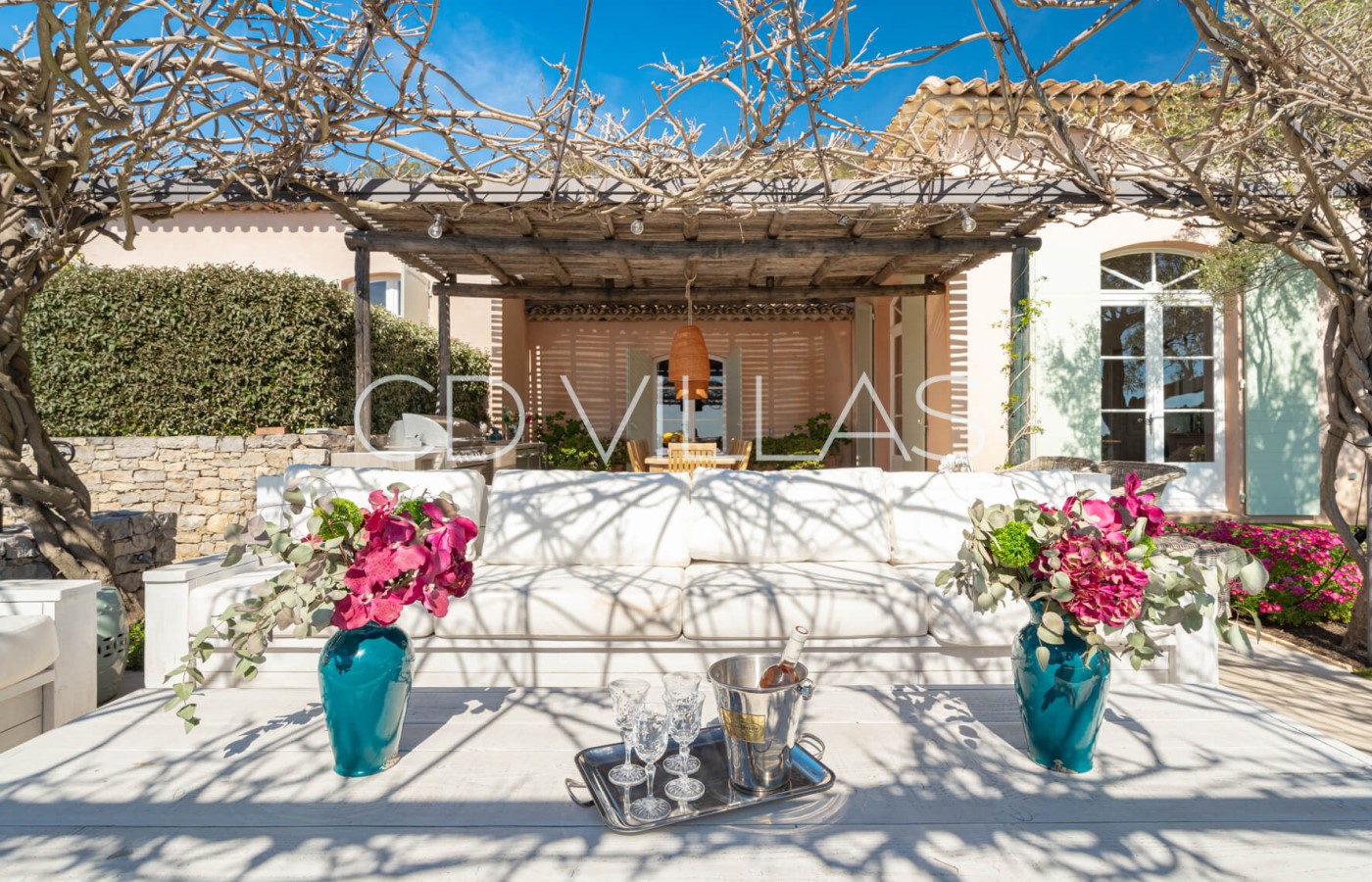 Le salon et salle à manger ouvrent sur une grande terrasse couverte avec une salle à manger pour 12 personnes, ainsi qu'un très grand salon de jardin abrité sous une pergola couverte de glycines et dominant la mer et tout Pampelonne.
