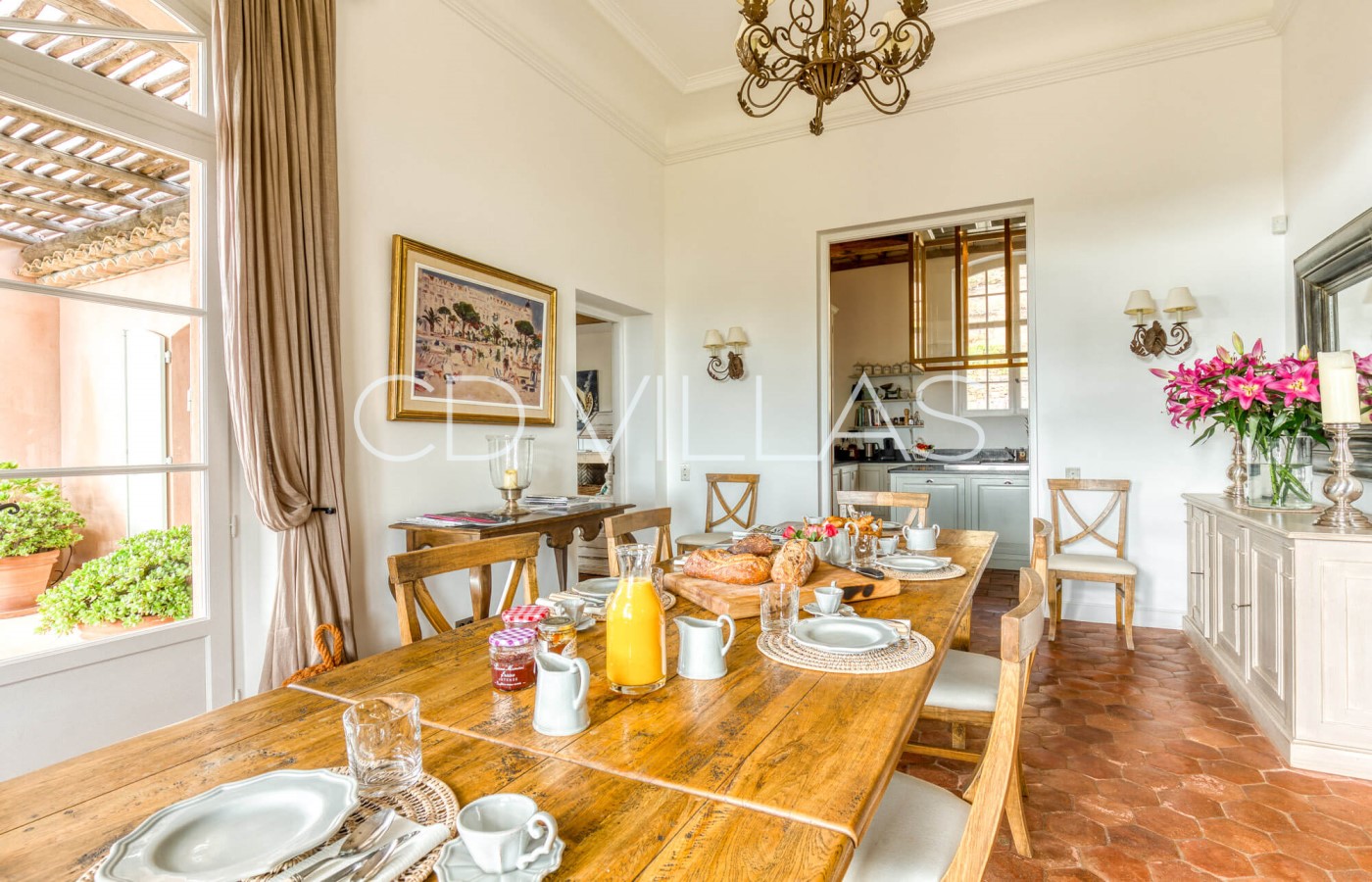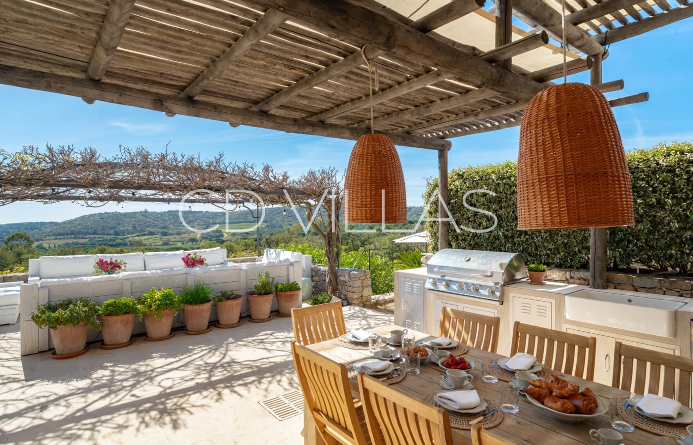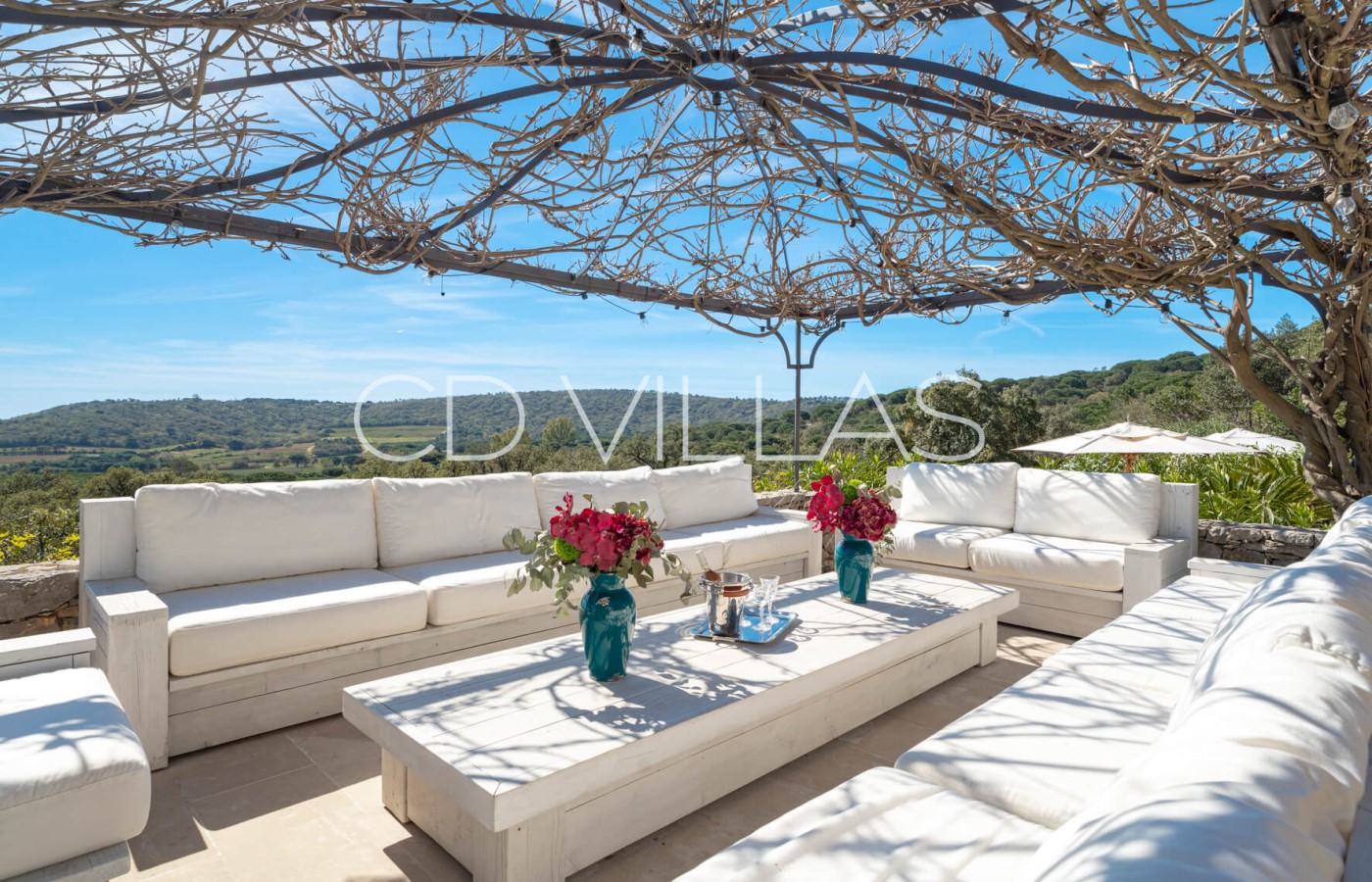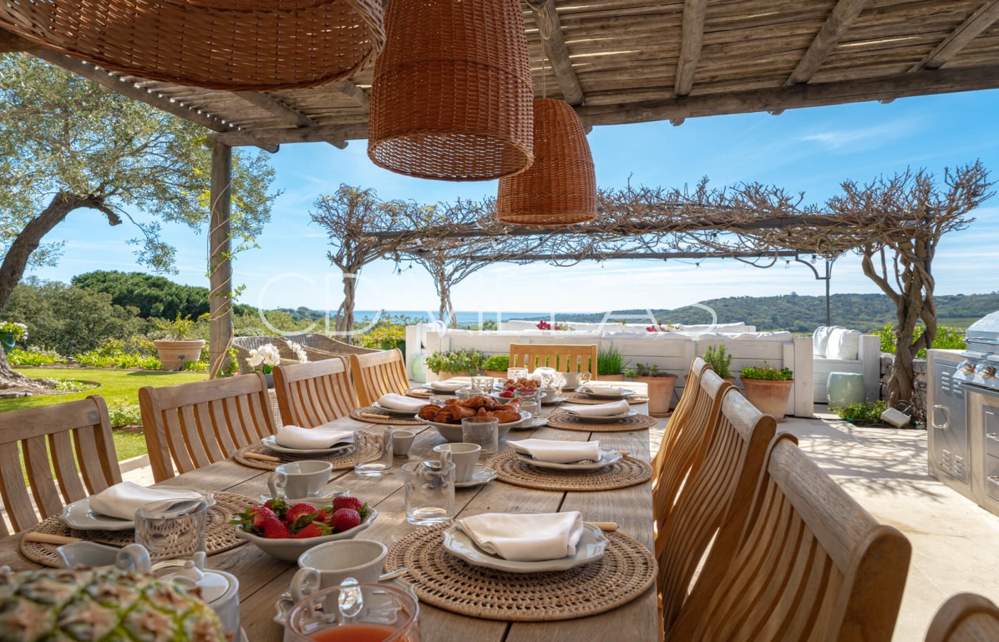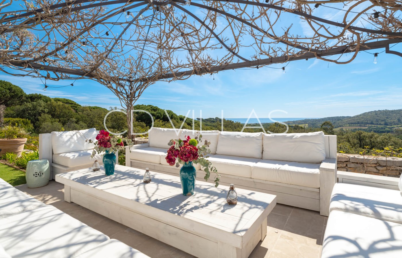 Le salon et salle à manger ouvrent sur une grande terrasse couverte avec une salle à manger pour 12 personnes, ainsi qu'un très grand salon de jardin abrité sous une pergola couverte de glycines et dominant la mer et tout Pampelonne.
