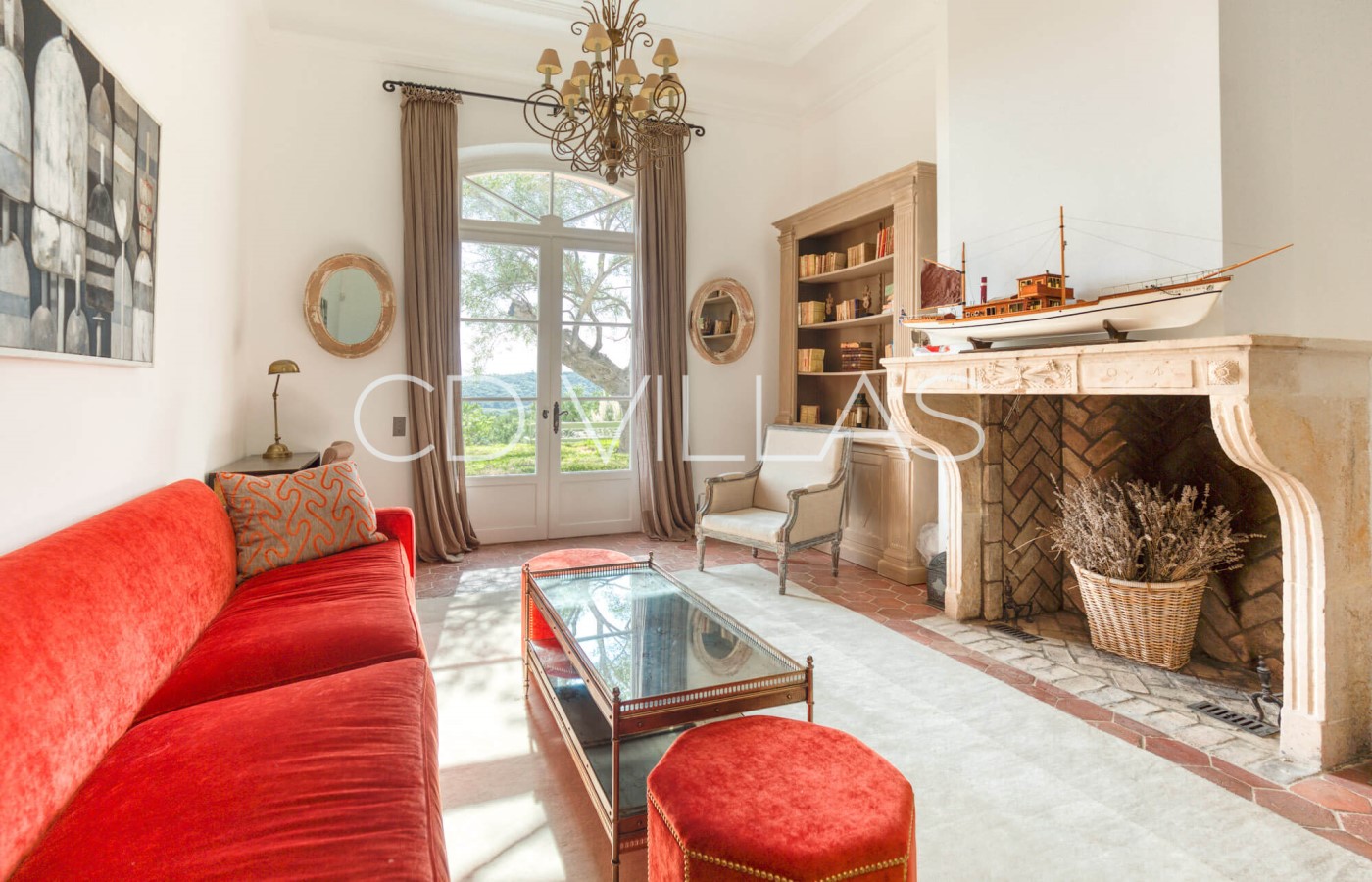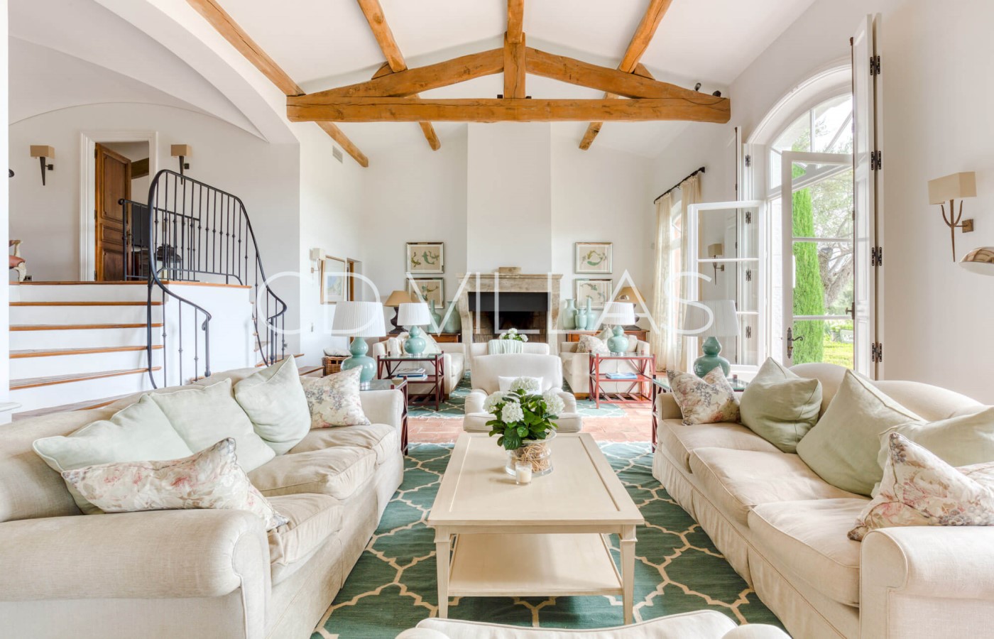 Une fois le hall d'entrée passé et en contrebas d'un bel escalier à double volée, on arrive dans un très grand salon doté de 4 canapés avec de très hauts plafonds, des poutres imposantes et des portes fenêtres imposantes qui donnent un cachet unique à cette belle bâtisse, tout en offrant une très belle vue sur les jardins verdoyants et la Méditerranée.