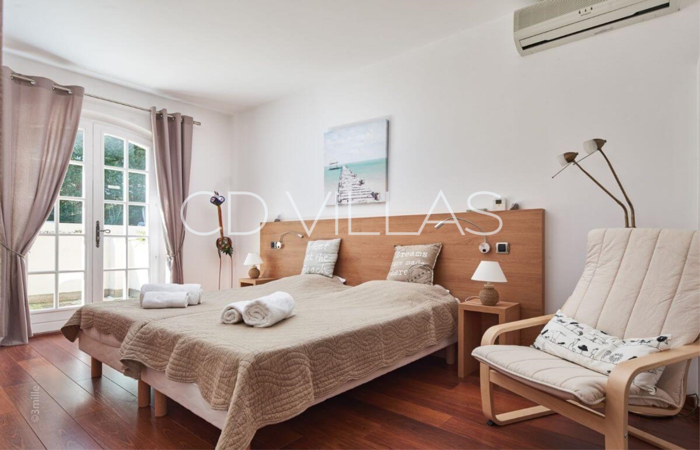 Il y a 3 chambres au rez-de-chaussée : une chambre double avec un lit 180 et une chambre avec deux lits simples pouvant être transformé en lit king size qui ont un accès direct sur le terrain de pétanque. La troisième chambre se situe sur l'avant de la maison avec une belle vue mer et un accès direct à la terrasse. Les trois chambres ont une salle de douche privative avec WC et vasque, des placards intégrés et la climatisation. Le premier étage est composé de la chambre de maître avec placards intégrés, une grande salle de bain avec deux vasques, douche, WC et coiffeuse. Au rez-de-chaussée, il y a un WC invité ainsi qu'une buanderie avec un grand frigo/congélateur, une machine à laver, un sèche-linge et une station de repassage.