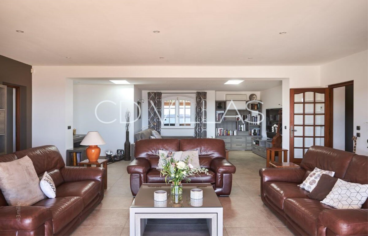 Salon - avec canapés en cuir, coin salon TV. ouvert sur terrasse avec belle vue mer