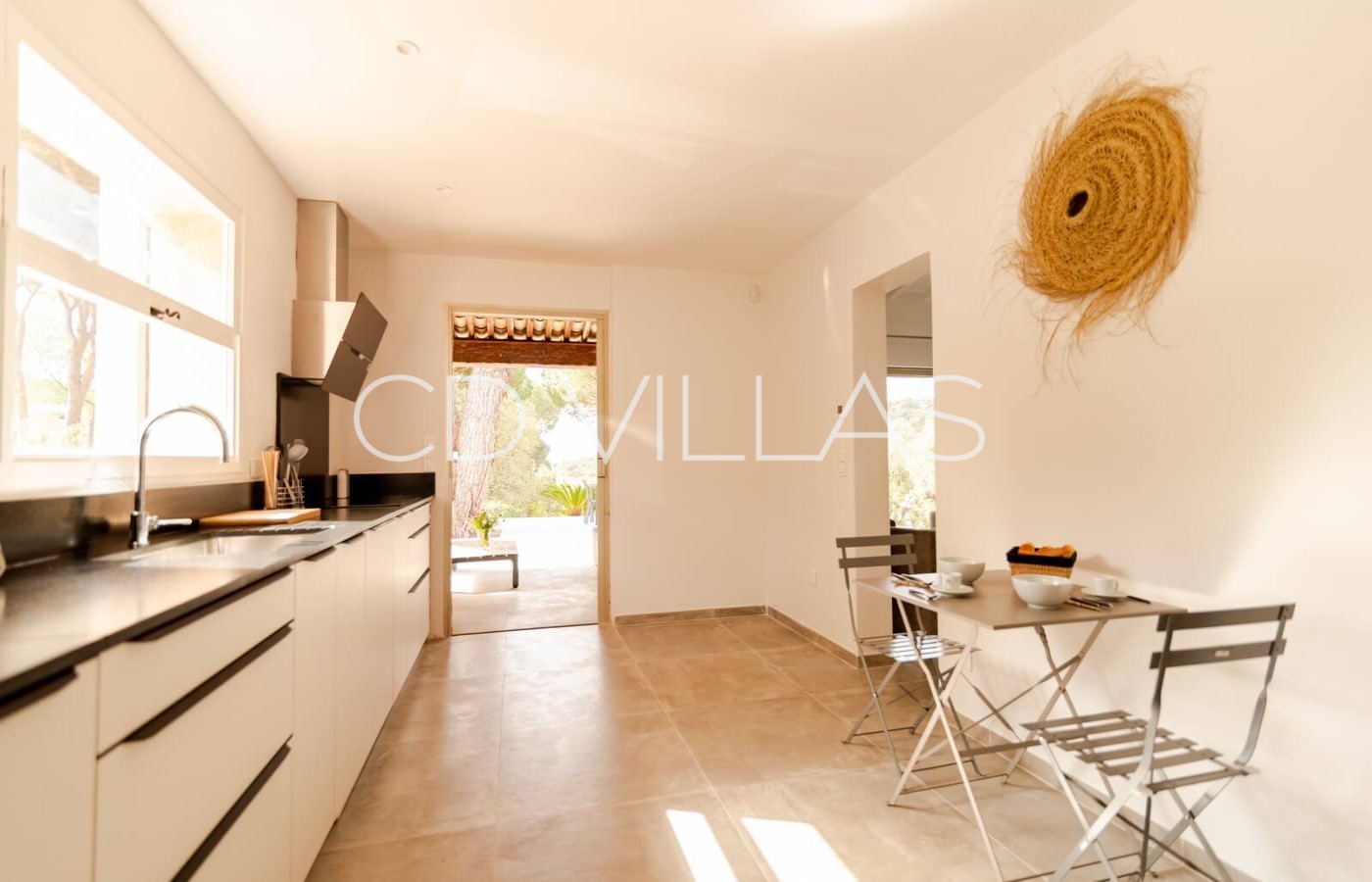 Le couloir s'ouvre sur un grand salon avec des canapés confortables, une cheminée, une télévision et un accès direct à la grande terrasse ; une cuisine ultra moderne avec plaques à induction, lave-vaisselle, réfrigérateur/congélateur, cafetière Nespresso, bouilloire, presse-agrumes et grille-pain.