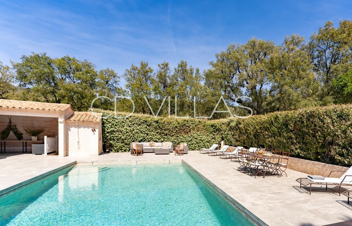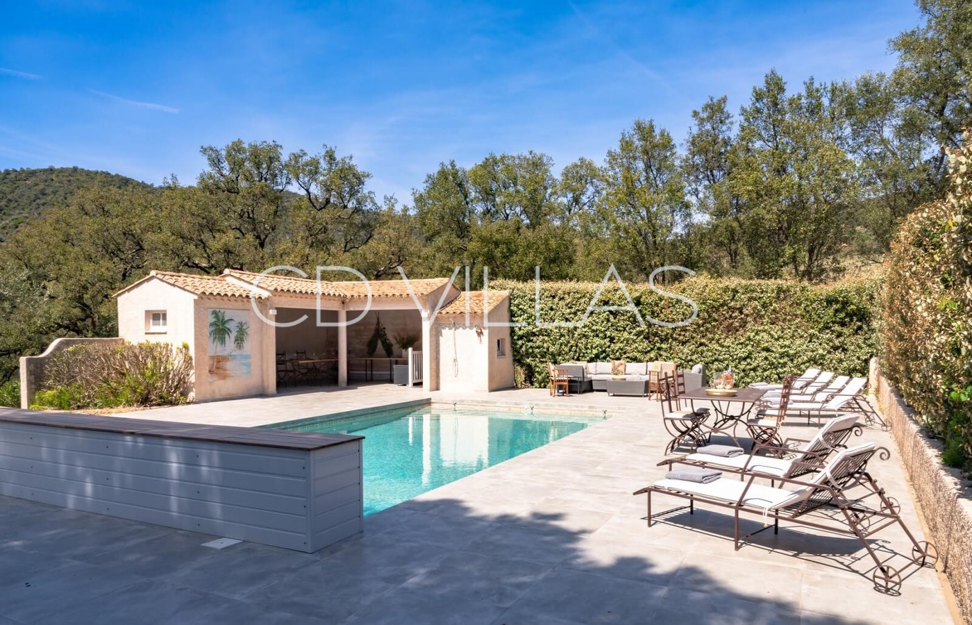 Entièrement rénovée en 2022, la propriété offre plus d'un hectare de terrain, une terrasse de 150 m² plein sud, une piscine et une terrasse de 250 m² avec pool house et terrain de pétanque éclairé.