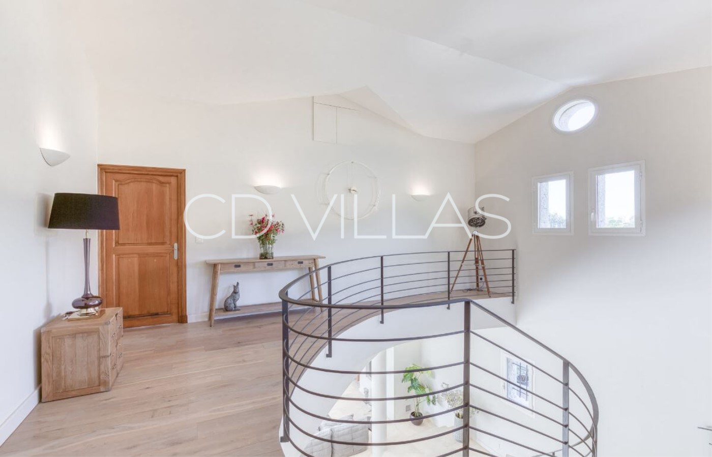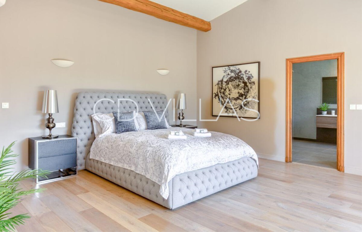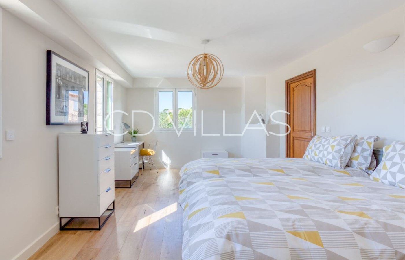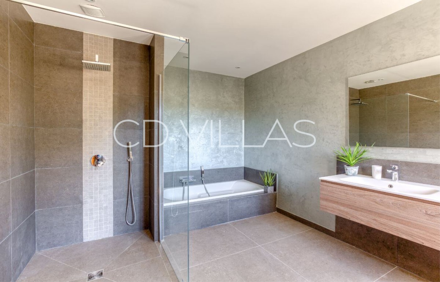 A l'étage se trouve la suite parentale avec sa terrasse privée vue mer, sa salle de bains avec baignoire, douche à l'italienne, double vasque et un grand dressing. Il y a aussi deux autres chambres spacieuses, chacune avec sa salle de bains en suite. La villa entièrement climatisée bénéficie de hauts plafonds et de lumière toute la journée.