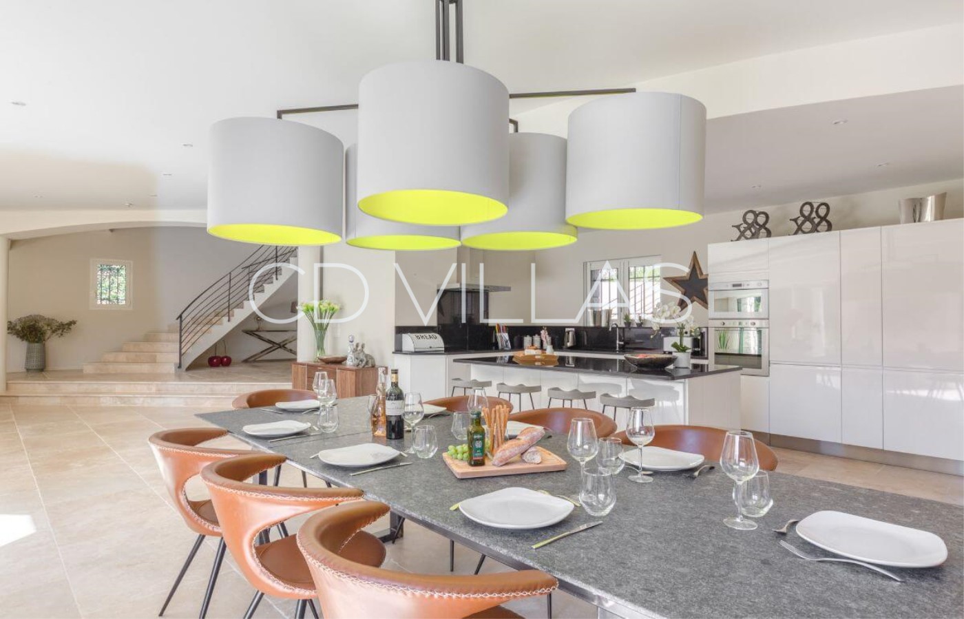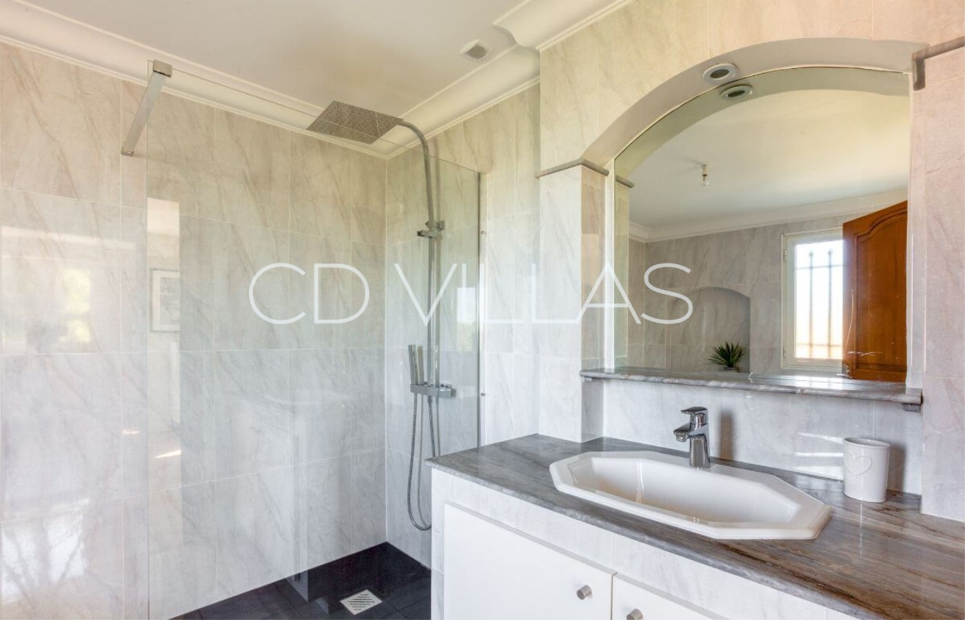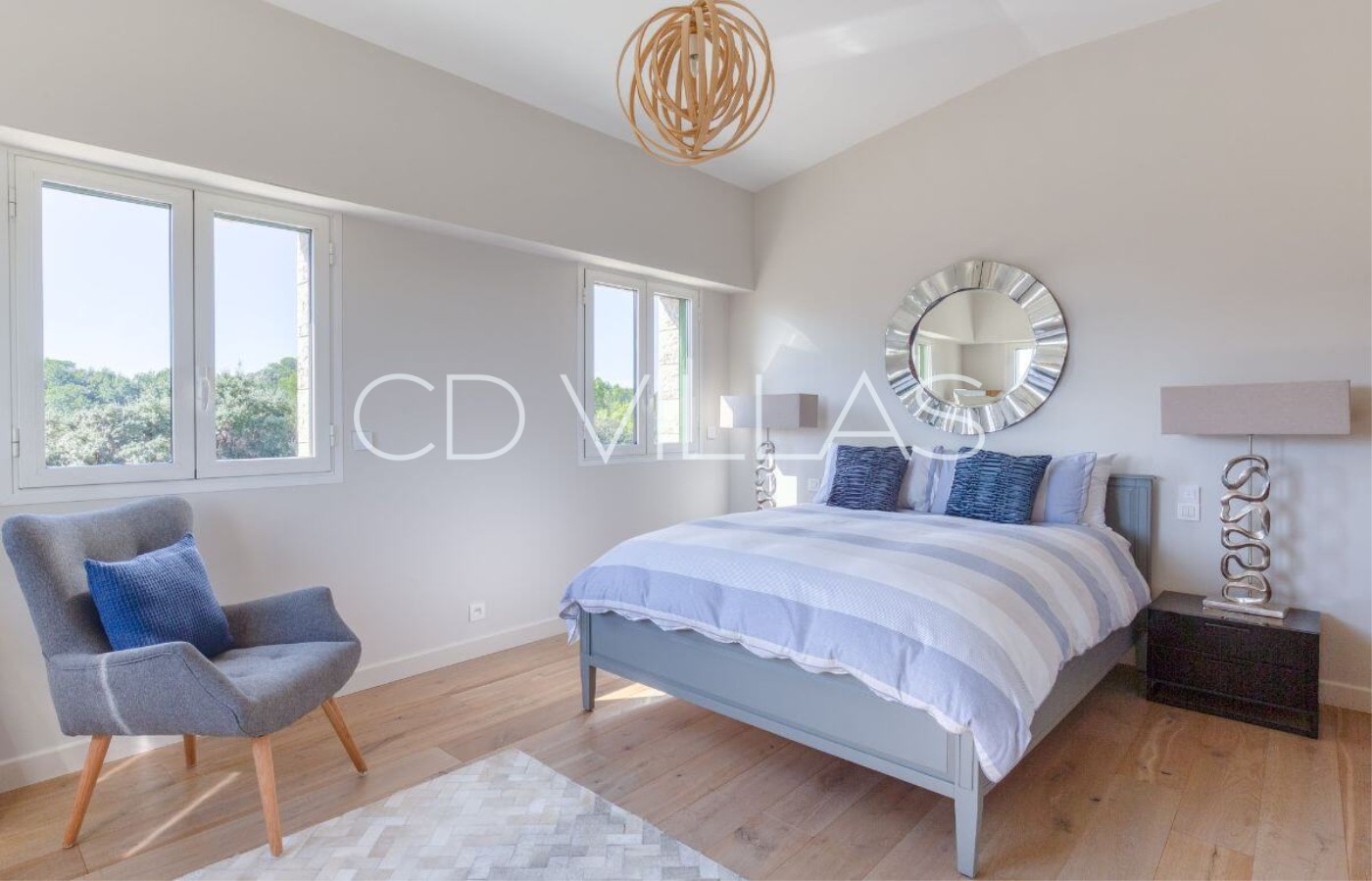 A l'étage se trouve la suite parentale avec sa terrasse privée vue mer, sa salle de bains avec baignoire, douche à l'italienne, double vasque et un grand dressing. Il y a aussi deux autres chambres spacieuses, chacune avec sa salle de bains en suite. La villa entièrement climatisée bénéficie de hauts plafonds et de lumière toute la journée.