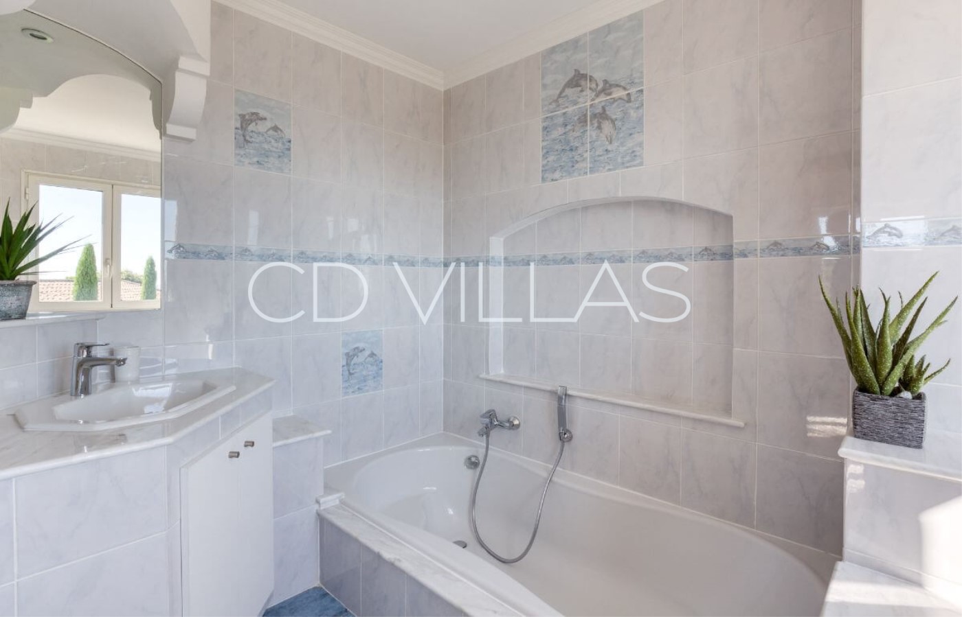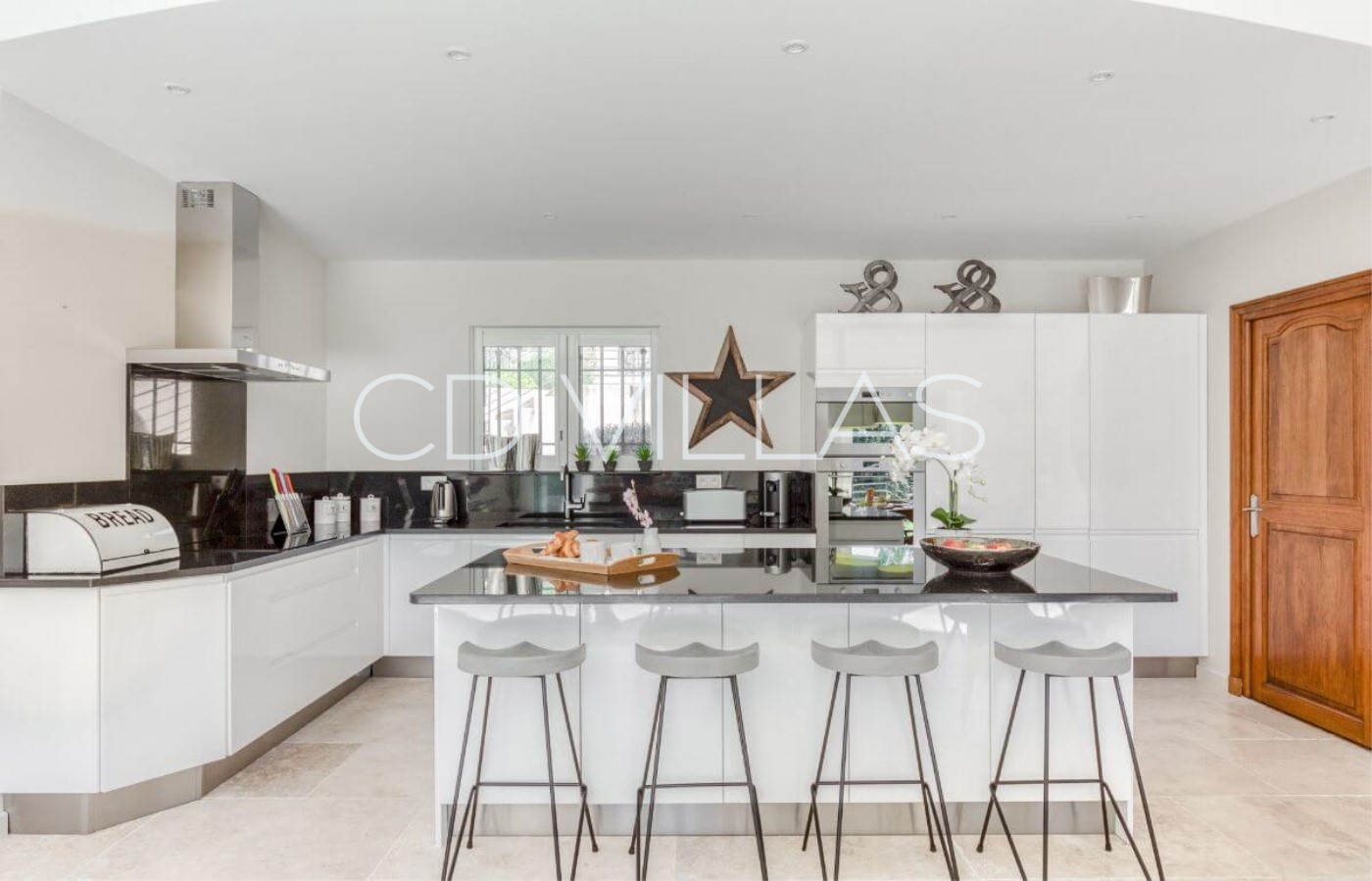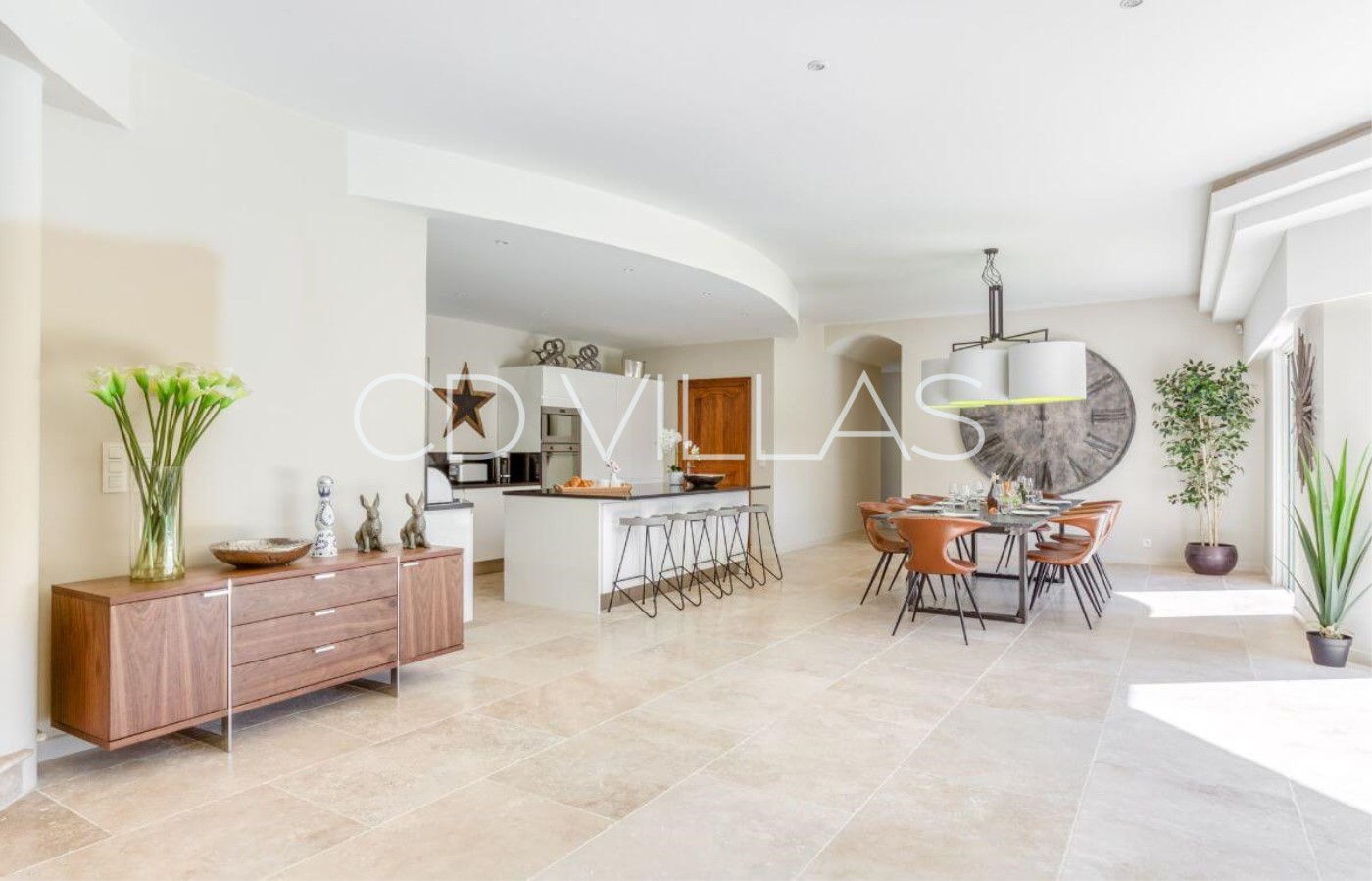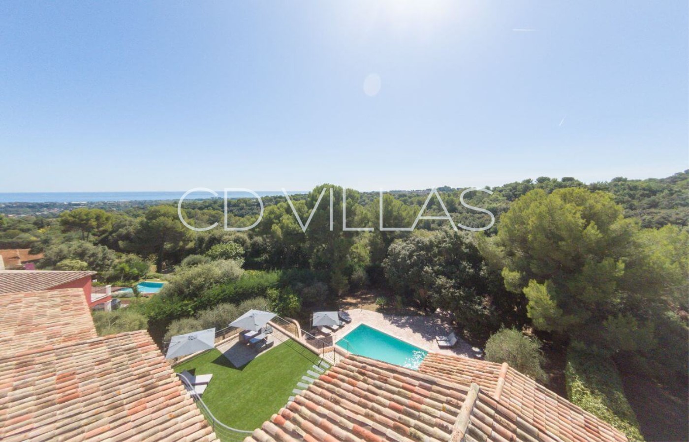 A l'étage se trouve la suite parentale avec sa terrasse privée vue mer, sa salle de bains avec baignoire, douche à l'italienne, double vasque et un grand dressing. Il y a aussi deux autres chambres spacieuses, chacune avec sa salle de bains en suite. La villa entièrement climatisée bénéficie de hauts plafonds et de lumière toute la journée.