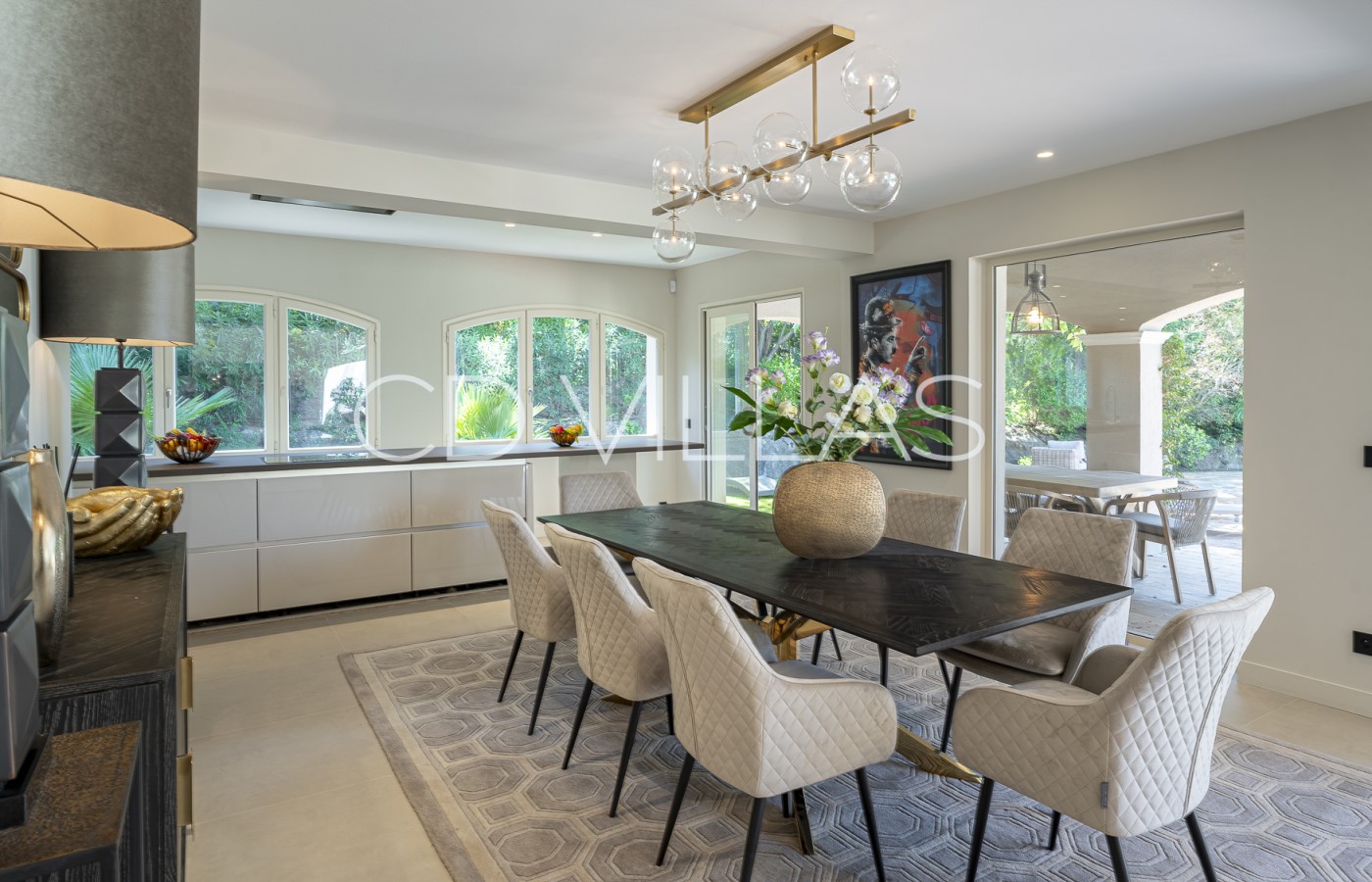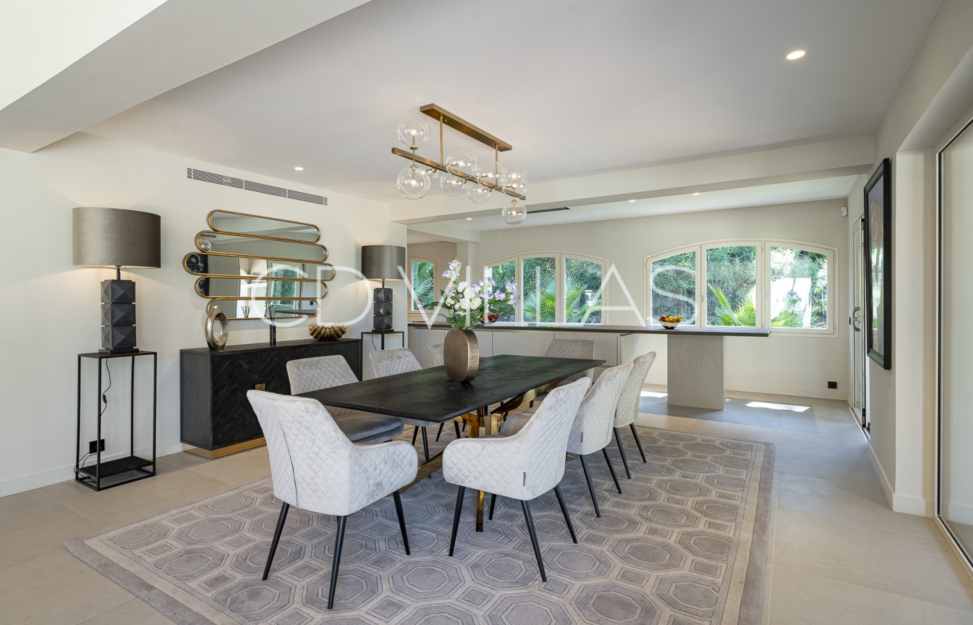 Récemment et soigneusement rénovée, la villa est entièrement climatisée et propose environ 430 m² d'espaces de vie baignés de lumière. De vastes baies vitrées inondent les intérieurs de lumière naturelle, créant une harmonie parfaite entre intérieur et extérieur.